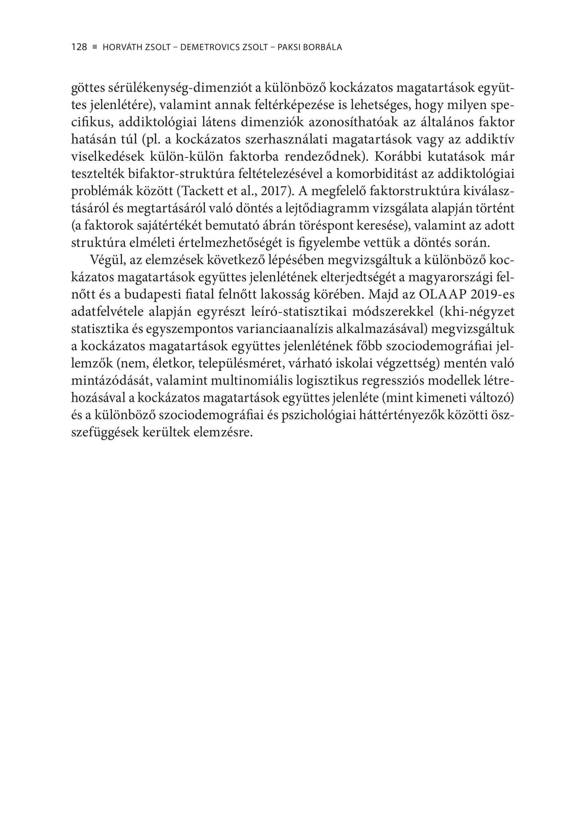 128 u HORVÁTH ZSOLT - DEMETROVICS ZSOLT - PAKSI BORBÁLA göttes sérülékenység-dimenziót a különböző kockázatos magatartások együttes jelenlétére), valamint annak feltérképezése is lehetséges, hogy milyen specifikus, addiktológiai látens dimenziók azonosíthatóak az általános faktor hatásán túl (pl. a kockázatos szerhasználati magatartások vagy az addiktív viselkedések külön-külön faktorba rendeződnek). Korábbi kutatások már tesztelték bifaktor-struktúra feltételezésével a komorbiditást az addiktológiai problémák között (Tackett et al., 2017). A megfelelő faktorstruktúra kiválasztásáról és megtartásáról való döntés a lejtődiagramm vizsgálata alapján történt (a faktorok sajátértékét bemutató ábrán töréspont keresése), valamint az adott struktúra elméleti értelmezhetőségét is figyelembe vettük a döntés során. Végül, az elemzések következő lépésében megvizsgáltuk a különböző kockázatos magatartások együttes jelenlétének elterjedtségét a magyarországi felnőtt és a budapesti fiatal felnőtt lakosság körében. Majd az OLAAP 2019-es adatfelvétele alapján egyrészt leíró-statisztikai módszerekkel (khi-négyzet statisztika és egyszempontos varianciaanalízis alkalmazásával) megvizsgáltuk a kockázatos magatartások együttes jelenlétének f6bb szociodemogräfiai jellemzők (nem, életkor, településméret, várható iskolai végzettség) mentén való mintázódását, valamint multinomiális logisztikus regressziós modellek létrehozásával a kockázatos magatartások együttes jelenléte (mint kimeneti változó) és a különböző szociodemográfiai és pszichológiai háttértényezők közötti öszszefüggések kerültek elemzésre.