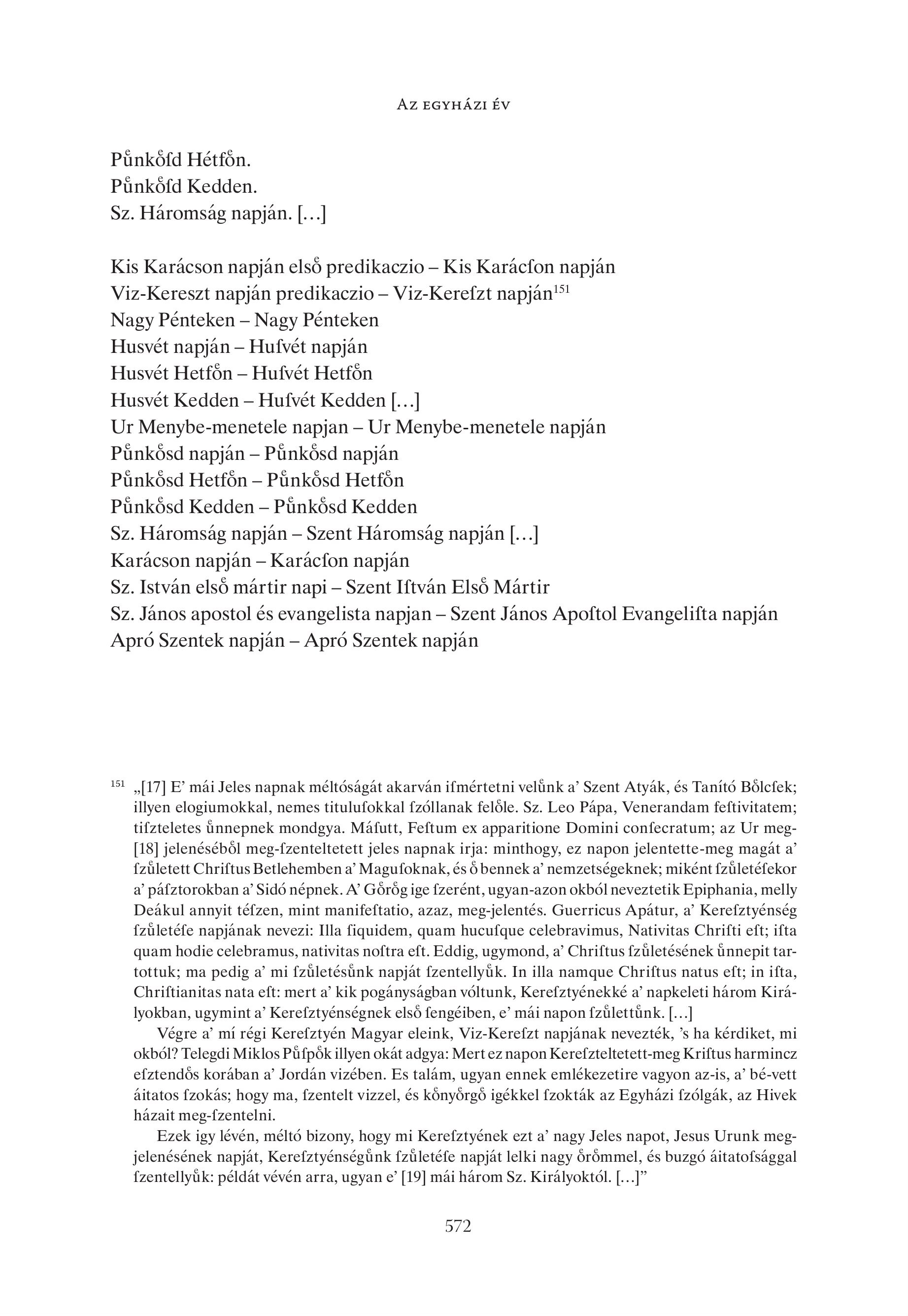 AZ EGYHÁZI ÉV Pünköfd Hetfön. Pünköfd Kedden. Sz. Háromság napján. [...] Kis Karácson napján első predikaczio — Kis Karácfon napján Viz-Kereszt napjan predikaczio — Viz-Kerefzt napján"! Nagy Pénteken — Nagy Pénteken Husvét napján — Hufvét napján Husvét Hetfőn — Hufvét Hetfőn Husvét Kedden - Hufvét Kedden [...] Ur Menybe-menetele napjan — Ur Menybe-menetele napján Pünkösd napjan - Pűnkösd napján Pünkôsd Hetfôn — Pünkôsd Hetfôn Pünkösd Kedden - Pűnkösd Kedden Sz. Haromsag napjan — Szent Haromsag napjan [...] Karácson napján - Karácfon napján Sz. István első mártir napi — Szent Iftvan Első Mártir Sz. János apostol és evangelista napjan — Szent János Apoftol Evangelifta napjan Apró Szentek napján - Apró Szentek napján 151 tifzteletes ünnepnek mondgya. Mäfutt, Feftum ex apparitione Domini confecratum; az Ur meglyokban, ugymint a’ Kerefztyénségnek elsé fengéiben, e’ mai napon fztilettiink. [...] házait meg-fzentelni. fzentellyük: példât vévén arra, ugyan e’ [19] mai harom Sz. Kirdlyoktol. [...]” 572