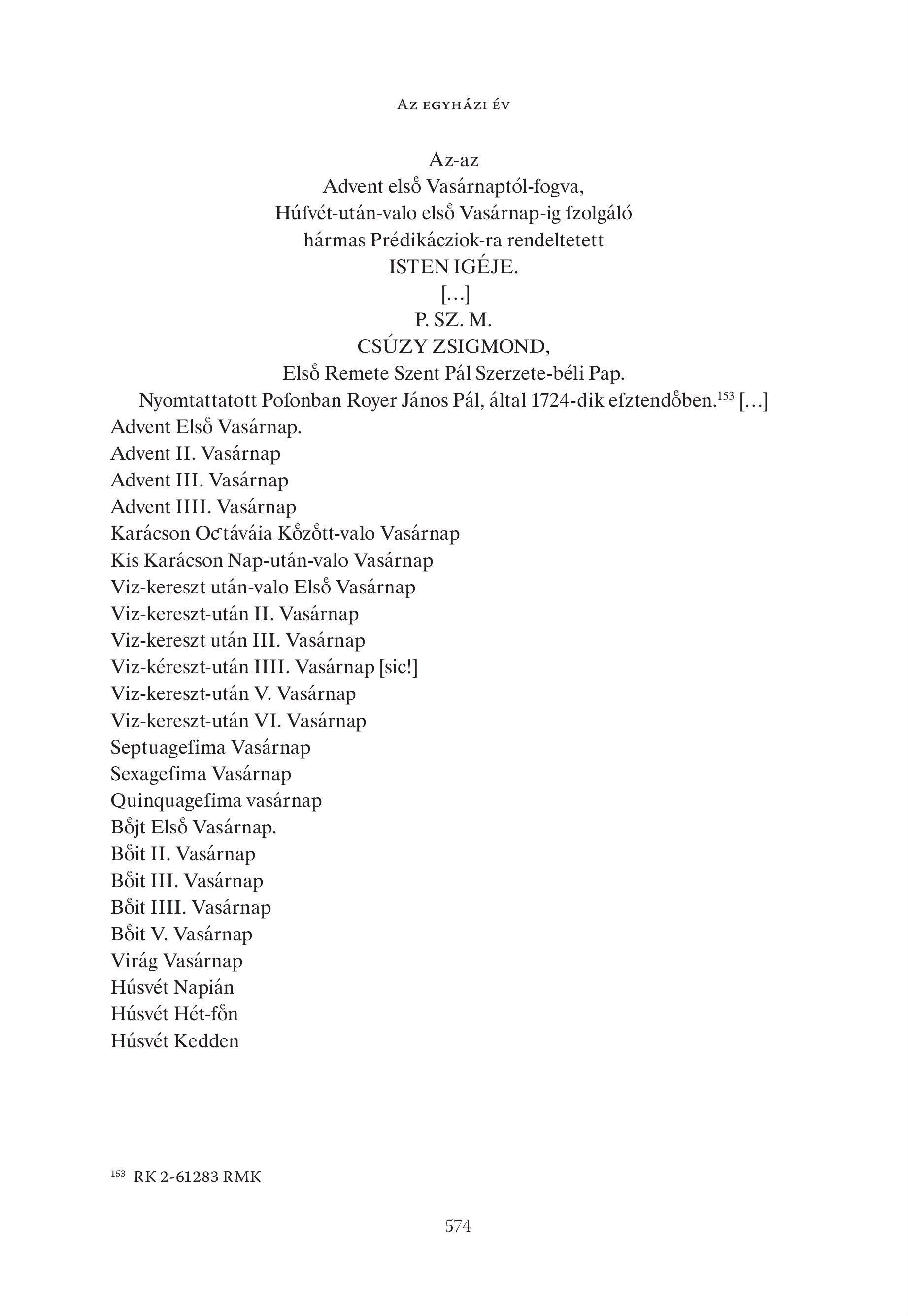 AZ EGYHÁZI ÉV Az-az Advent elsö Vasärnaptöl-fogva, Hüfvet-utän-valo elsö Vasärnap-ig fzolgal6 hármas Prédikácziok-ra rendeltetett ISTEN IGÉJE. [---] P.SZ.M. CSÚZY ZSIGMOND, Első Remete Szent Pál Szerzete-béli Pap. Nyomtattatott Pofonban Royer Janos Päl, ältal 1724-dik efztendöben.'? [...] Advent Első Vasárnap. Advent II. Vasárnap Advent III. Vasárnap Advent IIII. Vasárnap Karácson Octavaia K6z6tt-valo Vasárnap Kis Karácson Nap-után-valo Vasárnap Viz-kereszt után-valo Első Vasárnap Viz-kereszt-után II. Vasárnap Viz-kereszt után III. Vasárnap Viz-kéreszt-után IIII. Vasárnap [sic!] Viz-kereszt-után V. Vasárnap Viz-kereszt-után VI. Vasárnap Septuagefima Vasárnap Sexagefima Vasárnap Ouinguagefima vasárnap Bőjt Első Vasárnap. Bőit II. Vasárnap Bőit III. Vasárnap Bőit IIII. Vasárnap Bőit V. Vasárnap Virág Vasárnap Húsvét Napián Húsvét Het-fön Húsvét Kedden 153 RK 2-61283 RMK