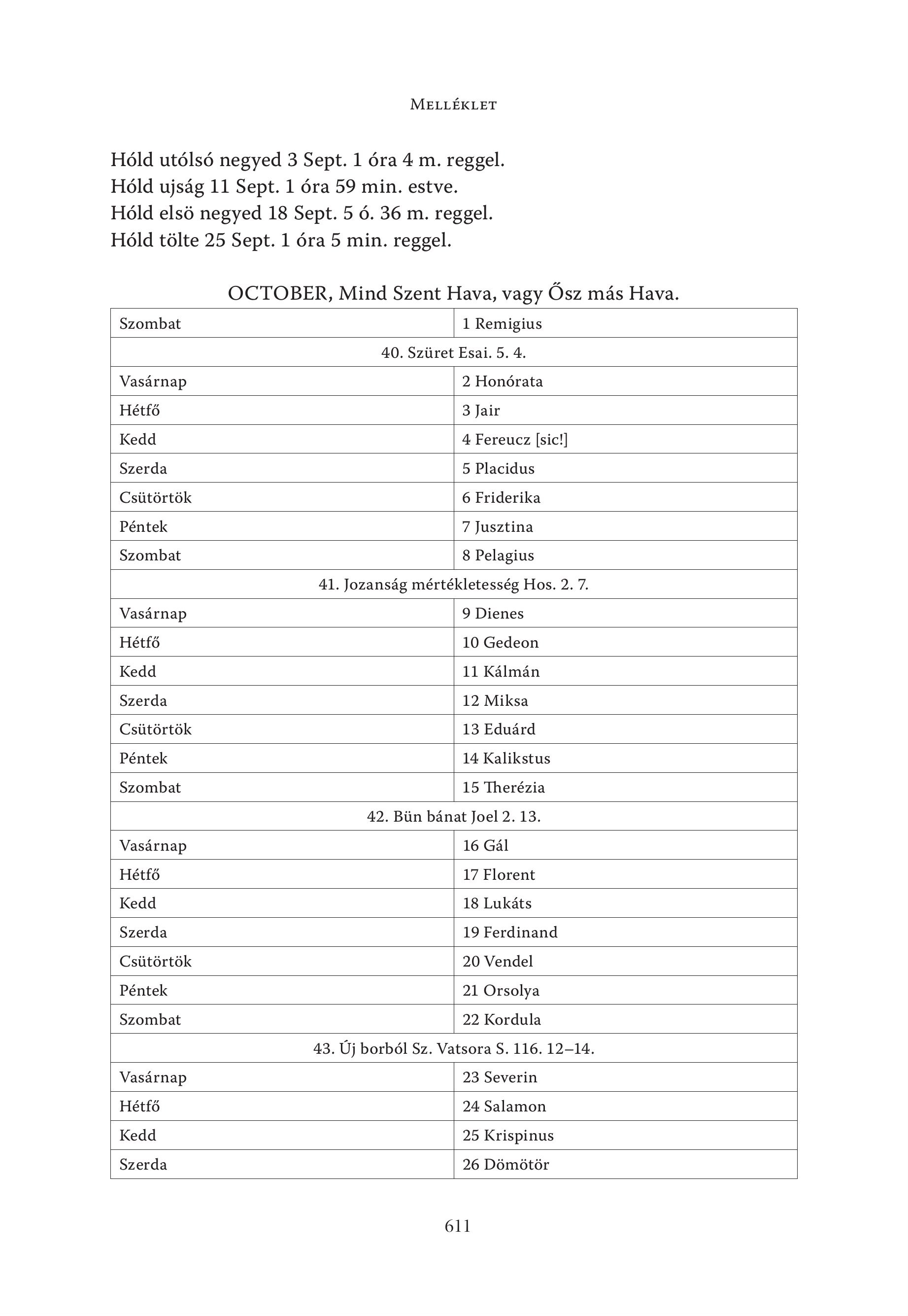 Szombat 1 Remigius 40. Szüret Esai. 5. 4. Vasärnap 2 Honörata Hetfö 3 Jair Kedd 4 Fereucz [sic!] Szerda 5 Placidus Csütörtök 6 Friderika Péntek 7 Jusztina Szombat 8 Pelagius 41. Jozanság mértékletesség Hos. 2. 7. Vasárnap 9 Dienes Hétfő 10 Gedeon Kedd 11 Kálmán Szerda 12 Miksa Csütörtök 13 Eduárd Péntek 14 Kalikstus Szombat 15 Therézia 42. Bün bánat Joel 2. 13. Vasárnap 16 Gál Hétfő 17 Florent Kedd 18 Lukáts Szerda 19 Ferdinand Csütörtök 20 Vendel Péntek 21 Orsolya Szombat 22 Kordula 43. Uj borbdl Sz. Vatsora S. 116. 12-14. Vasárnap 23 Severin Hétfő 24 Salamon Kedd 25 Krispinus Szerda 26 Dömötör 611