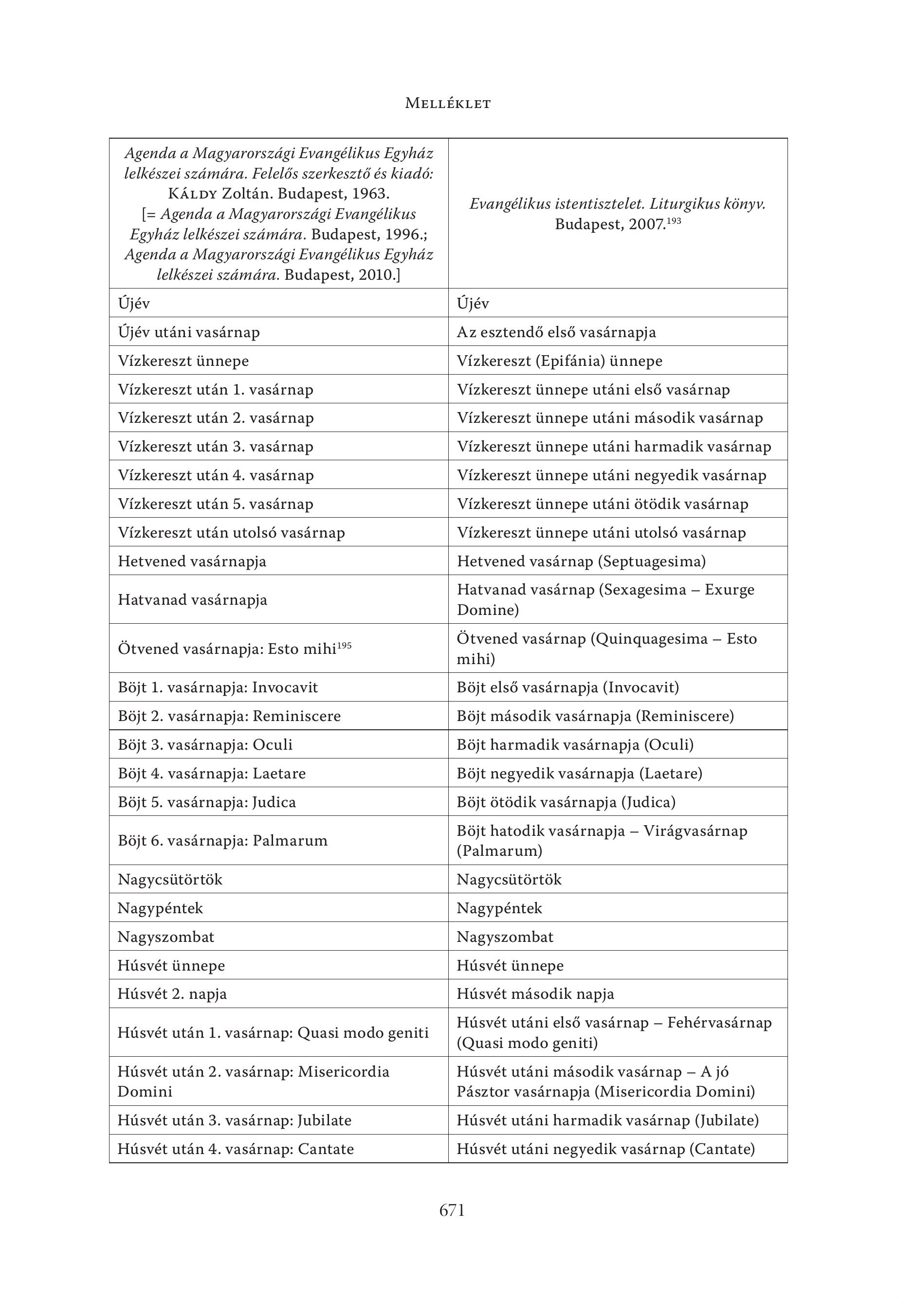 Agenda a Magyarországi Evangélikus Egyház lelkészei számára. Felelős szerkesztő és kiadó: KA.py Zoltan. Budapest, 1963. [= Agenda a Magyarországi Evangélikus Egyház lelkészei számára. Budapest, 1996.; Agenda a Magyarországi Evangélikus Egyház lelkészei számára. Budapest, 2010.] Evangélikus istentisztelet. Liturgikus könyv. Budapest, 2007." Újév Újév Ujév utáni vasárnap Az esztendő első vasárnapja Vízkereszt ünnepe Vízkereszt (Epifánia) ünnepe Vízkereszt után 1. vasárnap Vízkereszt ünnepe utáni első vasárnap Vízkereszt után 2. vasárnap Vízkereszt ünnepe utáni második vasárnap Vízkereszt után 3. vasárnap Vízkereszt ünnepe utáni harmadik vasárnap Vízkereszt után 4. vasárnap Vízkereszt ünnepe utáni negyedik vasárnap Vízkereszt után 5. vasárnap Vízkereszt ünnepe utáni ötödik vasárnap Vízkereszt után utolsó vasárnap Vízkereszt ünnepe utáni utolsó vasárnap Hetvened vasárnapja Hetvened vasárnap (Septuagesima) Hatvanad vasárnapja Hatvanad vasárnap (Sexagesima — Exurge Domine) Otvened vasdrnapja: Esto mihi! Otvened vasárnap (Quinquagesima — Esto mihi) Böjt 1. vasárnapja: Invocavit Böjt első vasárnapja (Invocavit) Böjt 2. vasárnapja: Reminiscere Böjt második vasárnapja (Reminiscere) Böjt 3. vasárnapja: Oculi Böjt harmadik vasárnapja (Oculi) Böjt 4. vasárnapja: Laetare Böjt negyedik vasárnapja (Laetare) Böjt 5. vasárnapja: Judica Böjt ötödik vasárnapja (Judica) Böjt 6. vasárnapja: Palmarum Böjt hatodik vasárnapja — Virágvasárnap (Palmarum) Nagycsütörtök Nagycsütörtök Nagypéntek Nagypéntek Nagyszombat Nagyszombat Húsvét ünnepe Húsvét ünnepe Húsvét 2. napja Húsvét második napja Husvét utan 1. vasarnap: Quasi modo geniti Húsvét utáni első vasárnap — Fehérvasárnap (Quasi modo geniti) Húsvét után 2. vasárnap: Misericordia Domini Húsvét utáni második vasárnap — A jó Pásztor vasárnapja (Misericordia Domini) Húsvét után 3. vasárnap: Jubilate Húsvét utáni harmadik vasárnap (Jubilate) Húsvét után 4. vasárnap: Cantate Húsvét utáni negyedik vasárnap (Cantate)