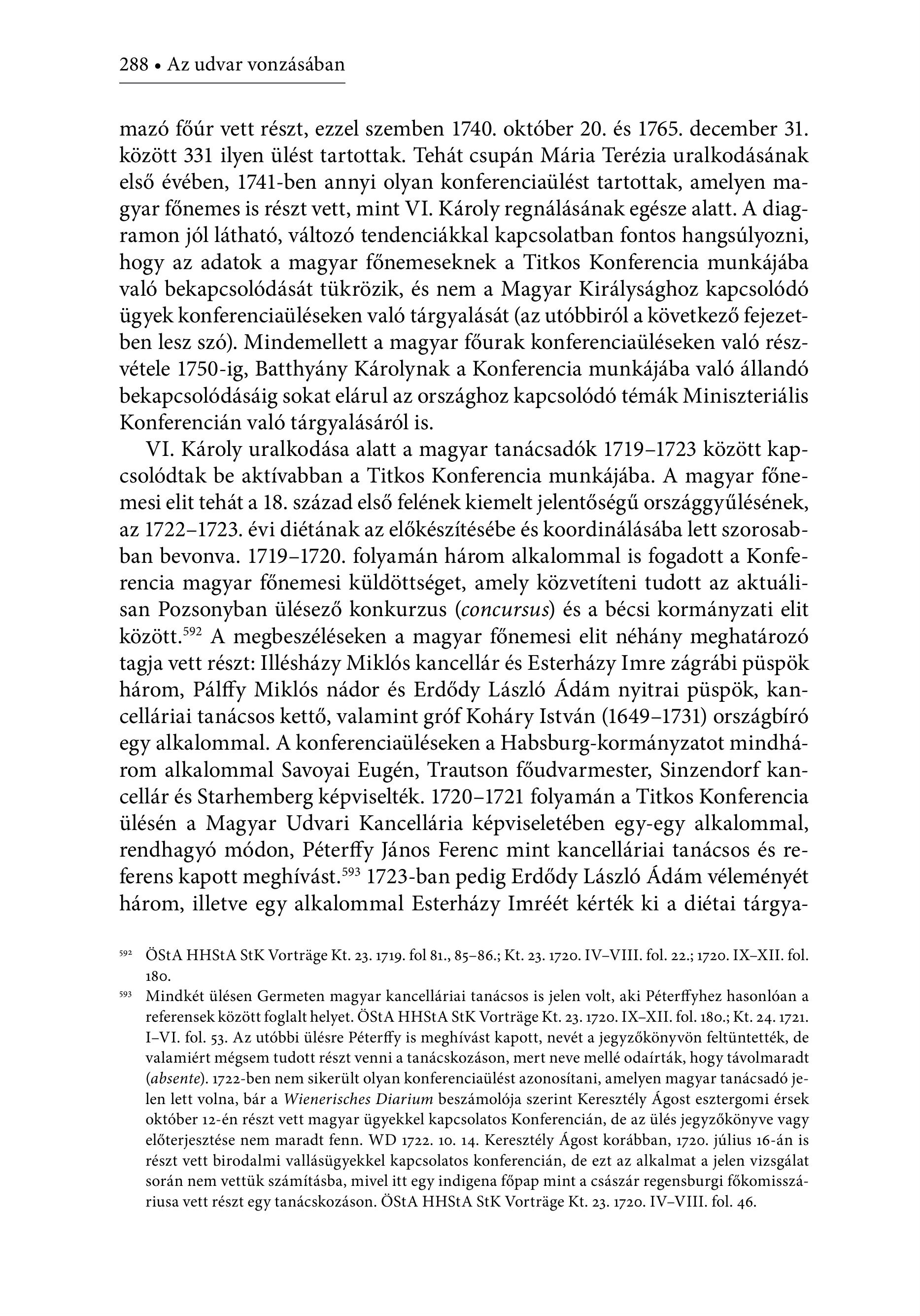 288 « Az udvar vonzäsäban mazó főúr vett részt, ezzel szemben 1740. október 20. és 1765. december 31. között 331 ilyen ülést tartottak. Tehát csupán Mária Terézia uralkodásának első évében, 1741-ben annyi olyan konferenciaülést tartottak, amelyen magyar főnemes is részt vett, mint VI. Károly regnálásának egésze alatt. A diagramon jól látható, változó tendenciákkal kapcsolatban fontos hangsúlyozni, hogy az adatok a magyar főnemeseknek a Titkos Konferencia munkájába való bekapcsolódását tükrözik, és nem a Magyar Királysághoz kapcsolódó ügyek konferenciaüléseken való tárgyalását (az utóbbiról a következő fejezetben lesz szó). Mindemellett a magyar főurak konferenciaüléseken való részvétele 1750-ig, Batthyány Károlynak a Konferencia munkájába való állandó bekapcsolódásáig sokat elárul az országhoz kapcsolódó témák Miniszteriális Konferencián való tárgyalásáról is. VI. Károly uralkodása alatt a magyar tanácsadók 1719-1723 között kapcsolódtak be aktívabban a Titkos Konferencia munkájába. A magyar főnemesi elit tehát a 18. század első felének kiemelt jelentőségű országgyűlésének, az 1722-1723. évi diétának az előkészítésébe és koordinálásába lett szorosabban bevonva. 1719-1720. folyamán három alkalommal is fogadott a Konferencia magyar főnemesi küldöttséget, amely közvetíteni tudott az aktuálisan Pozsonyban ülésező konkurzus (concursus) és a bécsi kormányzati elit között."? A megbeszéléseken a magyar főnemesi elit néhány meghatározó tagja vett részt: Illésházy Miklós kancellár és Esterházy Imre zágrábi püspök három, Pálffy Miklós nádor és Erdődy László Ádám nyitrai püspök, kancelláriai tanácsos kettő, valamint gróf Koháry István (1649-1731) országbíró egy alkalommal. A konferenciaüléseken a Habsburg-kormányzatot mindhárom alkalommal Savoyai Eugén, Trautson főudvarmester, Sinzendorf kancellár és Starhemberg képviselték. 1720-1721 folyamán a Titkos Konferencia ülésén a Magyar Udvari Kancellária képviseletében egy-egy alkalommal, rendhagyó módon, Péterffy János Ferenc mint kancelláriai tanácsos és referens kapott meghívást." 1723-ban pedig Erdődy László Ádám véleményét három, illetve egy alkalommal Esterházy Imréét kérték ki a diétai tárgya= ÖStA HHStA StK Vorträge Kt. 23. 1719. fol 81., 85-86.; Kt. 23. 1720. IV-VIII. fol. 22.; 1720. IX-XII. fol. 180. 53 "Mindkét ülésen Germeten magyar kancelláriai tanácsos is jelen volt, aki Péterffyhez hasonlóan a referensek között foglalt helyet. OStA HHStA StK Vortrage Kt. 23. 1720. IX-XII. fol. 180.; Kt. 24. 1721. I-VI. fol. 53. Az utóbbi ülésre Péterffy is meghívást kapott, nevét a jegyzőkönyvön feltüntették, de valamiért mégsem tudott részt venni a tanácskozáson, mert neve mellé odaírták, hogy távolmaradt (absente). 1722-ben nem sikerült olyan konferenciaülést azonosítani, amelyen magyar tanácsadó jelen lett volna, bár a Wienerisches Diarium beszámolója szerint Keresztély Ágost esztergomi érsek október 12-én részt vett magyar ügyekkel kapcsolatos Konferencián, de az ülés jegyzőkönyve vagy előterjesztése nem maradt fenn. WD 1722. 10. 14. Keresztély Ágost korábban, 1720. július 16-án is részt vett birodalmi vallásügyekkel kapcsolatos konferencián, de ezt az alkalmat a jelen vizsgálat során nem vettük számításba, mivel itt egy indigena főpap mint a császár regensburgi főkomisszáriusa vett részt egy tanácskozáson. ÖStA HHStA StK Vortráge Kt. 23. 1720. IV-VIII. fol. 46.