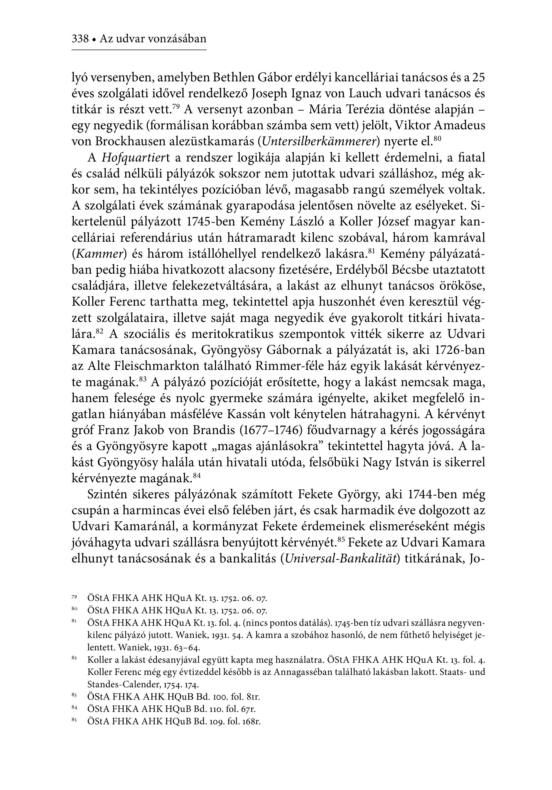 338 e Az udvar vonzásában lyó versenyben, amelyben Bethlen Gábor erdélyi kancelláriai tanácsos és a 25 éves szolgálati idővel rendelkező Joseph Ignaz von Lauch udvari tanácsos és titkár is részt vett." A versenyt azonban - Mária Terézia döntése alapján -— egy negyedik (formálisan korábban számba sem vett) jelölt, Viktor Amadeus von Brockhausen alezüstkamarás (Untersilberkdmmerer) nyerte el.*° A Hofguartiert a rendszer logikája alapján ki kellett érdemelni, a fiatal és család nélküli pályázók sokszor nem jutottak udvari szálláshoz, még akkor sem, ha tekintélyes pozícióban lévő, magasabb rangú személyek voltak. A szolgálati évek számának gyarapodása jelentősen növelte az esélyeket. Sikertelenül pályázott 1745-ben Kemény László a Koller József magyar kancelláriai referendárius után hátramaradt kilenc szobával, három kamrával (Kammer) és három istállóhellyel rendelkező lakásra." Kemény pályázatában pedig hiába hivatkozott alacsony fizetésére, Erdélyből Bécsbe utaztatott családjára, illetve felekezetváltására, a lakást az elhunyt tanácsos örököse, Koller Ferenc tarthatta meg, tekintettel apja huszonhét éven keresztül végzett szolgálataira, illetve saját maga negyedik éve gyakorolt titkári hivatalara.°” A szociális és meritokratikus szempontok vitték sikerre az Udvari Kamara tanácsosának, Gyöngyösy Gábornak a pályázatát is, aki 1726-ban az Alte Fleischmarkton található Rimmer-féle ház egyik lakását kérvényezte magának." A pályázó pozícióját erősítette, hogy a lakást nemcsak maga, hanem felesége és nyolc gyermeke számára igényelte, akiket megfelelő ingatlan hiányában másféléve Kassán volt kénytelen hátrahagyni. A kérvényt gróf Franz Jakob von Brandis (1677-1746) főudvarnagy a kérés jogosságára és a Gyöngyösyre kapott , magas ajánlásokra" tekintettel hagyta jóvá. A lakást Gyöngyösy halála után hivatali utóda, felsőbüki Nagy István is sikerrel kérvényezte magának." Szintén sikeres pályázónak számított Fekete György, aki 1744-ben még csupán a harmincas évei első felében járt, és csak harmadik éve dolgozott az Udvari Kamaránál, a kormányzat Fekete érdemeinek elismeréseként mégis jóváhagyta udvari szállásra benyújtott kérvényét." Fekete az Udvari Kamara elhunyt tanäcsosänak és a bankalitäs (Universal-Bankalität) titkäränak, Jo7 OStA FHKA AHK HQuA Kt. 13. 1752. 06. 07. 80 ÖStA FHKA AHK HQuA Kt. 13. 1752. 06. 07. s: ÖStA FHKA AHK HQuA Kt. 13. fol. 4. (nincs pontos datäläs). 1745-ben tíz udvari szállásra negyvenkilenc pályázó jutott. Waniek, 1931. 54. A kamra a szobához hasonló, de nem fűthető helyiséget jelentett. Waniek, 1931. 63-64. ® Koller a lakást édesanyjával együtt kapta meg használatra. ÖStA FHKA AHK HOUA Kt. 13. fol. 4. Koller Ferenc még egy évtizeddel később is az Annagasséban található lakásban lakott. Staats- und Standes-Calender, 1754. 174. *% OStA FHKA AHK HQuB Bad. too. fol. 81r. 84 OStA FHKA AHK HQuB Bd. 110. fol. 67r. 8 OStA FHKA AHK HQuB Bd. 109. fol. 168r.