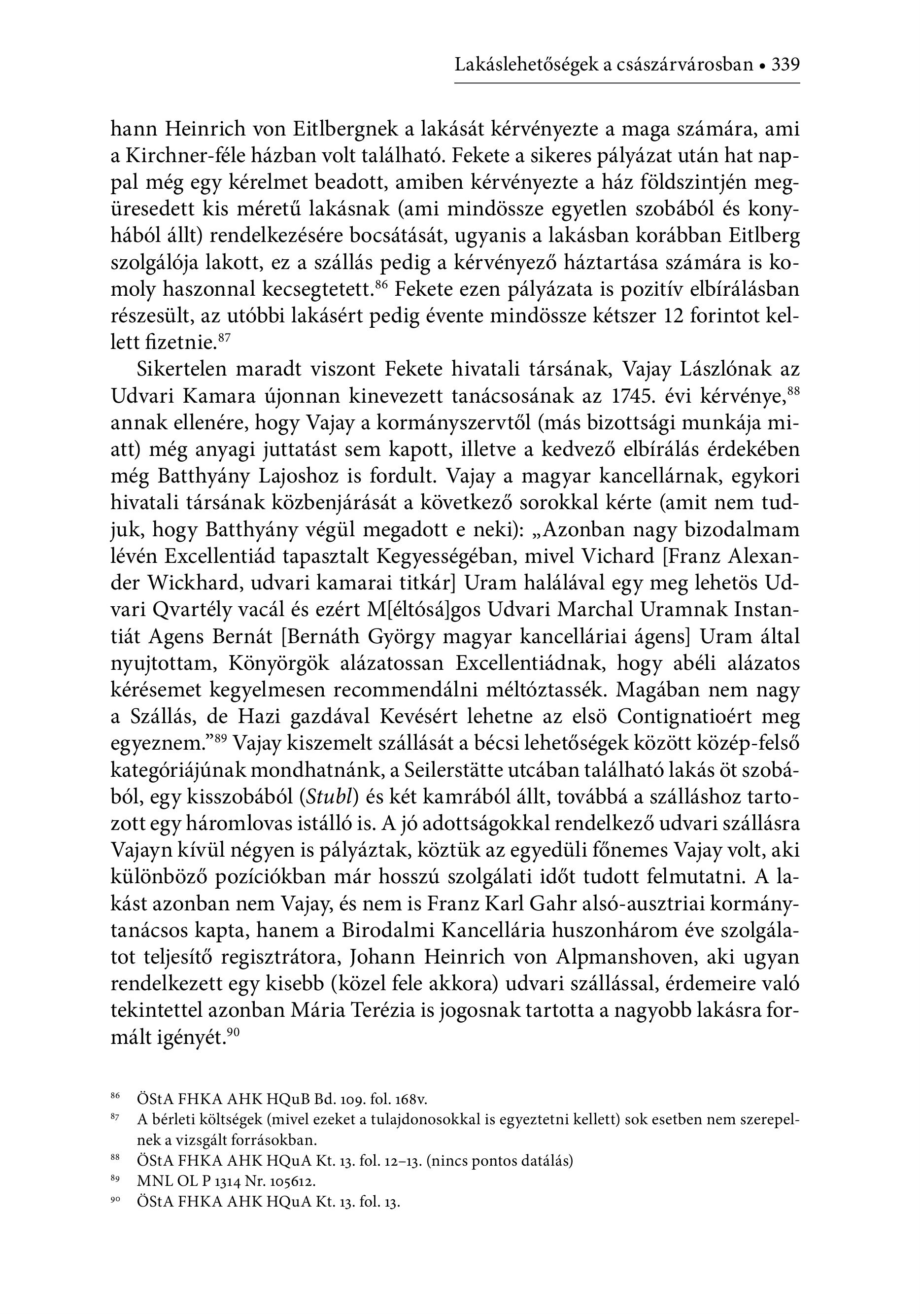 Lakáslehetőségek a császárvárosban s 339 hann Heinrich von Eitlbergnek a lakását kérvényezte a maga számára, ami a Kirchner-féle házban volt található. Fekete a sikeres pályázat után hat nappal még egy kérelmet beadott, amiben kérvényezte a ház földszintjén megüresedett kis méretű lakásnak (ami mindössze egyetlen szobából és konyhából állt) rendelkezésére bocsátását, ugyanis a lakásban korábban Eitlberg szolgálója lakott, ez a szállás pedig a kérvényező háztartása számára is komoly haszonnal kecsegtetett." Fekete ezen pályázata is pozitív elbírálásban részesült, az utóbbi lakásért pedig évente mindössze kétszer 12 forintot kellett fizetnie." Sikertelen maradt viszont Fekete hivatali társának, Vajay Lászlónak az Udvari Kamara újonnan kinevezett tanácsosának az 1745. évi kérvénye," annak ellenére, hogy Vajay a kormányszervtől (más bizottsági munkája miatt) még anyagi juttatást sem kapott, illetve a kedvező elbírálás érdekében még Batthyány Lajoshoz is fordult. Vajay a magyar kancellárnak, egykori hivatali társának közbenjárását a következő sorokkal kérte (amit nem tudjuk, hogy Batthyány végül megadott e neki): , Azonban nagy bizodalmam lévén Excellentiád tapasztalt Kegyességéban, mivel Vichard [Franz Alexander Wickhard, udvari kamarai titkár] Uram halálával egy meg lehetös Udvari Qvartély vacäl és ezért Mféltésä]gos Udvari Marchal Uramnak Instantiát Agens Bernát [Bernáth György magyar kancelláriai ágens] Uram által nyujtottam, Könyörgök alázatossan Excellentiádnak, hogy abéli alázatos kérésemet kegyelmesen recommendálni méltóztassék. Magában nem nagy a Szállás, de Hazi gazdával Kevésért lehetne az elsö Contignatioért meg egyeznem."" Vajay kiszemelt szállását a bécsi lehetőségek között közép-felső kategóriájúnak mondhatnánk, a Seilerstátte utcában található lakás öt szobából, egy kisszobából (Stubl) és két kamrából állt, továbbá a szálláshoz tartozott egy háromlovas istálló is. A jó adottságokkal rendelkező udvari szállásra Vajayn kívül négyen is pályáztak, köztük az egyedüli főnemes Vajay volt, aki különböző pozíciókban már hosszú szolgálati időt tudott felmutatni. A lakást azonban nem Vajay, és nem is Franz Karl Gahr alsó-ausztriai kormánytanácsos kapta, hanem a Birodalmi Kancellária huszonhárom éve szolgálatot teljesítő regisztrátora, Johann Heinrich von Alpmanshoven, aki ugyan rendelkezett egy kisebb (közel fele akkora) udvari szállással, érdemeire való tekintettel azonban Mária Terézia is jogosnak tartotta a nagyobb lakásra formált igényét." 8° OStA FHKA AHK HQuB Bd. 109. fol. 168v. §7 A bérleti költségek (mivel ezeket a tulajdonosokkal is egyeztetni kellett) sok esetben nem szerepelnek a vizsgált forrásokban. 88 OStA FHKA AHK HQuA Kt. 13. fol. 12-13. (nincs pontos datäläs) 9 MNL OL P 1314 Nr. 105612. » ÖStA FHKA AHK HQuA Kt. 13. fol. 13.