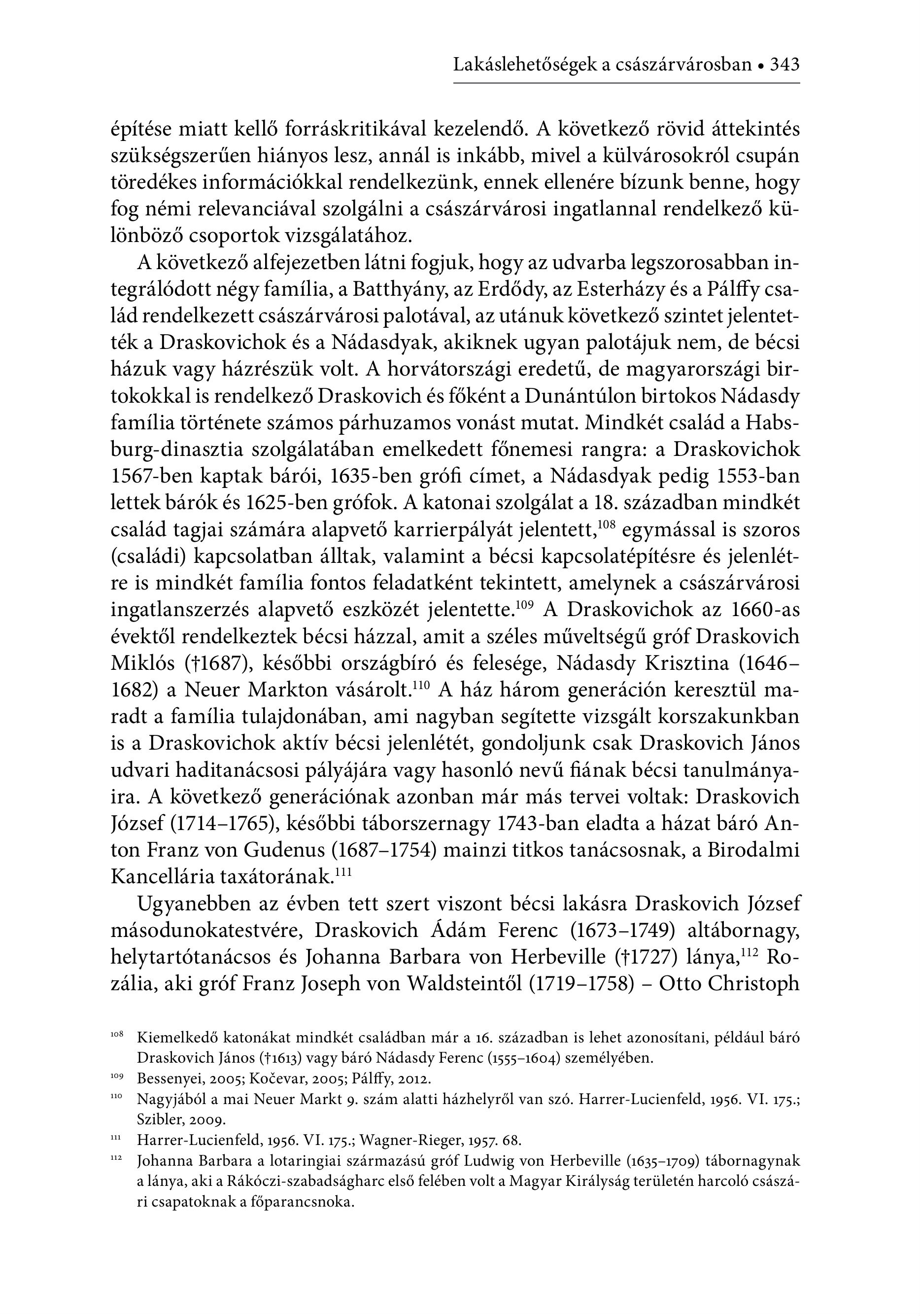Lakáslehetőségek a császárvárosban s 343 építése miatt kellő forráskritikával kezelendő. A következő rövid áttekintés szükségszerűen hiányos lesz, annál is inkább, mivel a külvárosokról csupán töredékes információkkal rendelkezünk, ennek ellenére bízunk benne, hogy fog némi relevanciával szolgálni a császárvárosi ingatlannal rendelkező különböző csoportok vizsgálatához. A következő alfejezetben látni fogjuk, hogy az udvarba legszorosabban integrálódott négy família, a Batthyány, az Erdődy, az Esterházy és a Pálffy család rendelkezett császárvárosi palotával, az utánuk következő szintet jelentették a Draskovichok és a Nádasdyak, akiknek ugyan palotájuk nem, de bécsi házuk vagy házrészük volt. A horvátországi eredetű, de magyarországi birtokokkal is rendelkező Draskovich és főként a Dunántúlon birtokos Nádasdy família története számos párhuzamos vonást mutat. Mindkét család a Habsburg-dinasztia szolgálatában emelkedett főnemesi rangra: a Draskovichok 1567-ben kaptak bárói, 1635-ben grófi címet, a Nádasdyak pedig 1553-ban lettek bárók és 1625-ben grófok. A katonai szolgálat a 18. században mindkét család tagjai számára alapvető karrierpályát jelentett, "" egymással is szoros (családi) kapcsolatban álltak, valamint a bécsi kapcsolatépítésre és jelenlétre is mindkét família fontos feladatként tekintett, amelynek a császárvárosi ingatlanszerzés alapvető eszközét jelentette." A Draskovichok az 1660-as évektől rendelkeztek bécsi házzal, amit a széles műveltségű gróf Draskovich Miklös (11687), későbbi országbíró és felesége, Nádasdy Krisztina (16461682) a Neuer Markton vásárolt. A ház három generáción keresztül maradt a família tulajdonában, ami nagyban segítette vizsgált korszakunkban is a Draskovichok aktív bécsi jelenlétét, gondoljunk csak Draskovich János udvari haditanácsosi pályájára vagy hasonló nevű fiának bécsi tanulmányaira. A következő generációnak azonban már más tervei voltak: Draskovich József (1714-1765), későbbi táborszernagy 1743-ban eladta a házat báró Anton Franz von Gudenus (1687-1754) mainzi titkos tanácsosnak, a Birodalmi Kancellária taxátorának."" Ugyanebben az évben tett szert viszont bécsi lakásra Draskovich József másodunokatestvére, Draskovich Ádám Ferenc (1673-1749) altábornagy, helytartétanacsos és Johanna Barbara von Herbeville (+1727) lanya,' Rozalia, aki grof Franz Joseph von Waldsteint6l (1719-1758) - Otto Christoph 108 Kiemelkedő katonákat mindkét családban már a 16. században is lehet azonosítani, például báró Draskovich János (71613) vagy báró Nádasdy Ferenc (1555-1604) személyében. 9 Bessenyei, 2005; Kocevar, 2005; Pälffy, 2012. "o "Nagyjából a mai Neuer Markt 9. szäm alatti häzhelyröl van szö. Harrer-Lucienfeld, 1956. VI. 175.; Szibler, 2009. m Harrer-Lucienfeld, 1956. VI. 175.; Wagner-Rieger, 1957. 68. Johanna Barbara a lotaringiai származású gróf Ludwig von Herbeville (1635-1709) täbornagynak a lánya, aki a Rákóczi-szabadságharc első felében volt a Magyar Királyság területén harcoló császári csapatoknak a főparancsnoka.