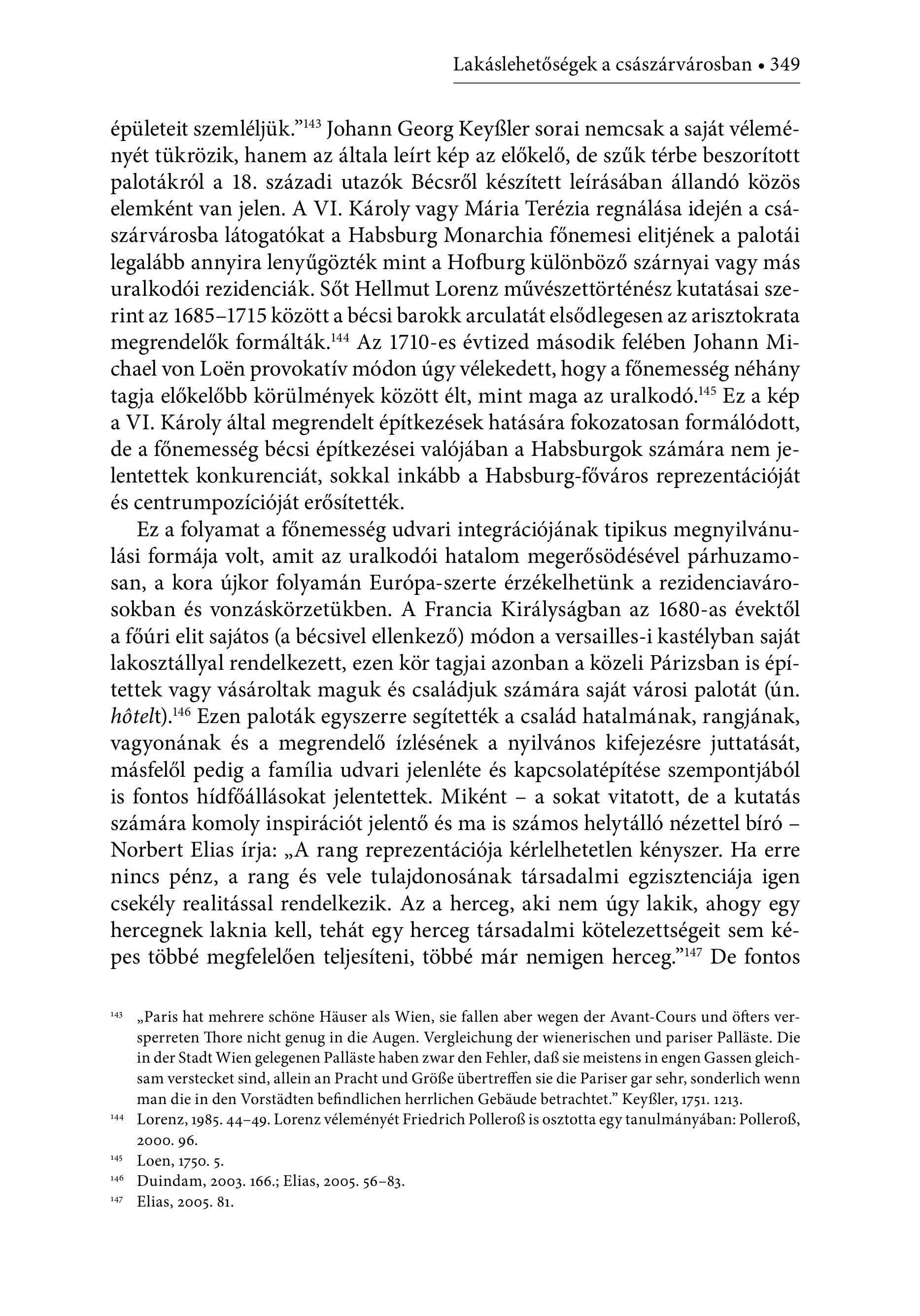 Lakáslehetőségek a császárvárosban « 349 épületeit szemléljük." Johann Georg Keyßler sorai nemcsak a saját véleményét tükrözik, hanem az általa leírt kép az előkelő, de szűk térbe beszorított palotákról a 18. századi utazók Bécsről készített leírásában állandó közös elemként van jelen. A VI. Károly vagy Mária Terézia regnálása idején a császárvárosba látogatókat a Habsburg Monarchia főnemesi elitjének a palotái legalább annyira lenyűgözték mint a Hofburg különböző szárnyai vagy más uralkodói rezidenciák. Sőt Hellmut Lorenz művészettörténész kutatásai szerint az 1685-1715 között a bécsi barokk arculatát elsődlegesen az arisztokrata megrendelők formálták." Az 1710-es évtized második felében Johann Michael von Loén provokatív módon úgy vélekedett, hogy a főnemesség néhány tagja előkelőbb körülmények között élt, mint maga az uralkodó." Ez a kép a VI. Károly által megrendelt építkezések hatására fokozatosan formálódott, de a főnemesség bécsi építkezései valójában a Habsburgok számára nem jelentettek konkurenciát, sokkal inkább a Habsburg-főváros reprezentációját és centrumpozícióját erősítették. Ez a folyamat a főnemesség udvari integrációjának tipikus megnyilvánulási formája volt, amit az uralkodói hatalom megerősödésével párhuzamosan, a kora újkor folyamán Európa-szerte érzékelhetünk a rezidenciavárosokban és vonzáskörzetükben. A Francia Királyságban az 1680-as évektől a főúri elit sajátos (a bécsivel ellenkező) módon a versailles-i kastélyban saját lakosztállyal rendelkezett, ezen kör tagjai azonban a közeli Párizsban is építettek vagy vásároltak maguk és családjuk számára saját városi palotát (ún. hőtelt)."§ Ezen paloták egyszerre segítették a család hatalmának, rangjának, vagyonának és a megrendelő ízlésének a nyilvános kifejezésre juttatását, másfelől pedig a família udvari jelenléte és kapcsolatépítése szempontjából is fontos hídfőállásokat jelentettek. Miként - a sokat vitatott, de a kutatás számára komoly inspirációt jelentő és ma is számos helytálló nézettel bíró — Norbert Elias írja: , A rang reprezentációja kérlelhetetlen kényszer. Ha erre nincs pénz, a rang és vele tulajdonosának társadalmi egzisztenciája igen csekély realitással rendelkezik. Az a herceg, aki nem úgy lakik, ahogy egy hercegnek laknia kell, tehát egy herceg társadalmi kötelezettségeit sem képes többé megfelelően teljesíteni, többé már nemigen herceg."" De fontos “8 „Paris hat mehrere schöne Häuser als Wien, sie fallen aber wegen der Avant-Cours und öfters versperreten Thore nicht genug in die Augen. Vergleichung der wienerischen und pariser Palläste. Die in der Stadt Wien gelegenen Palläste haben zwar den Fehler, daß sie meistens in engen Gassen gleichsam verstecket sind, allein an Pracht und Größe übertreffen sie die Pariser gar sehr, sonderlich wenn man die in den Vorstädten befindlichen herrlichen Gebäude betrachtet.” Keyßler, 1751. 1213. “44 Lorenz, 1985. 44-49. Lorenz velemenyet Friedrich Polleroß is osztotta egy tanulmänyäban: Polleroß, 2000. 96. 45 Loen, 1750. 5. 45 Duindam, 2003. 166.; Elias, 2005. 56-83. 47 Elias, 2005. 81.