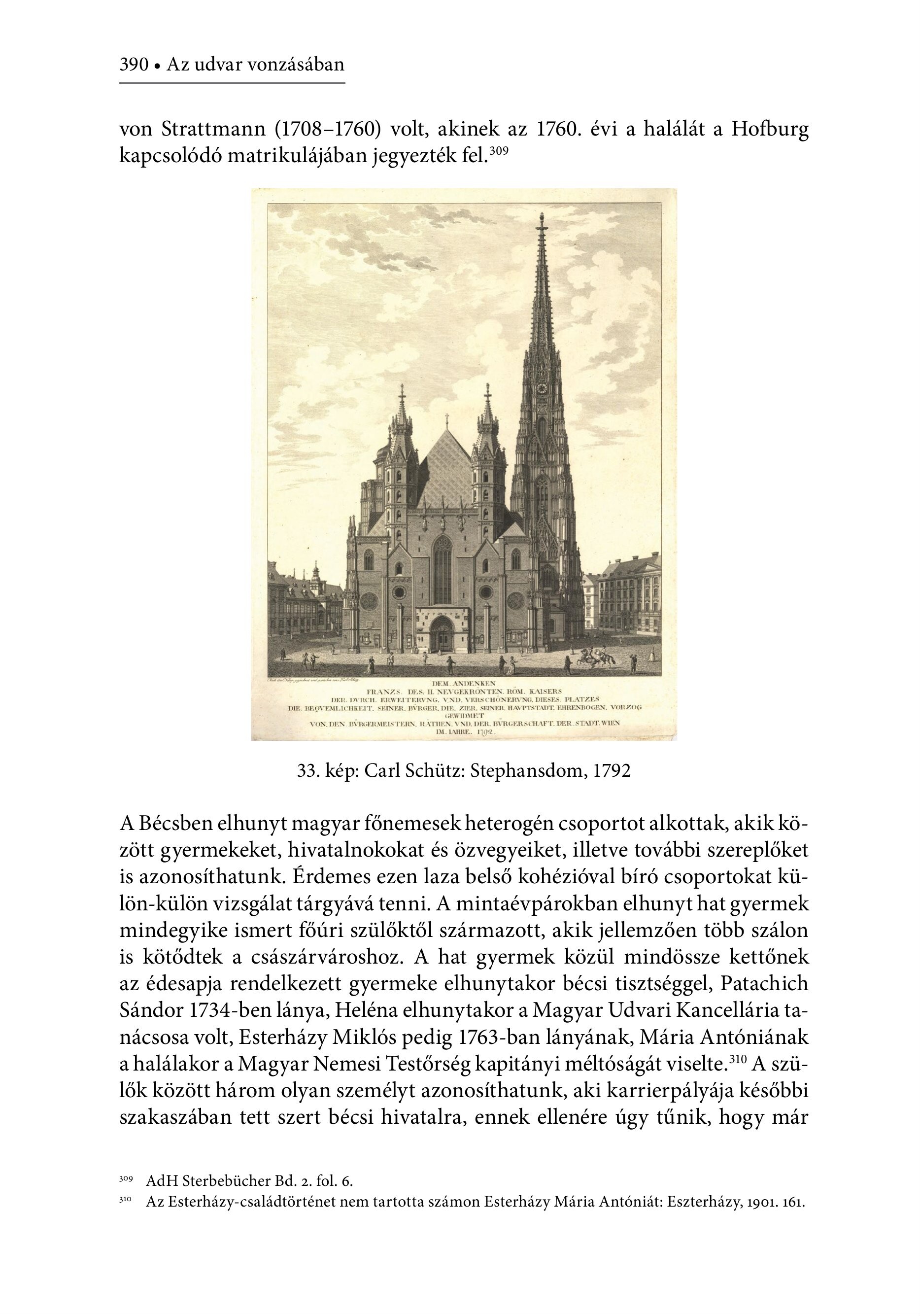 390 s Az udvar vonzásában von Strattmann (1708-1760) volt, akinek az 1760. évi a halálát a Hofburg kapcsolódó matrikulájában jegyezték fel." a eT 33. kep: Carl Schütz: Stephansdom, 1792 A Bécsben elhunyt magyar főnemesek heterogén csoportot alkottak, akik között gyermekeket, hivatalnokokat és özvegyeiket, illetve további szereplőket is azonosíthatunk. Érdemes ezen laza belső kohézióval bíró csoportokat külön-külön vizsgálat tárgyává tenni. A mintaévpárokban elhunyt hat gyermek mindegyike ismert főúri szülőktől származott, akik jellemzően több szálon is kötődtek a császárvároshoz. A hat gyermek közül mindössze kettőnek az édesapja rendelkezett gyermeke elhunytakor bécsi tisztséggel, Patachich Sándor 1734-ben lánya, Heléna elhunytakor a Magyar Udvari Kancellária tanácsosa volt, Esterházy Miklós pedig 1763-ban lányának, Mária Antóniának a halálakor a Magyar Nemesi Testőrség kapitányi méltóságát viselte." A szülők között három olyan személyt azonosíthatunk, aki karrierpályája későbbi szakaszában tett szert bécsi hivatalra, ennek ellenére úgy tűnik, hogy már 309 AdH Sterbebücher Bd. 2. fol. 6. so Az Esterházy-családtörténet nem tartotta számon Esterházy Mária Antóniát: Eszterházy, 1901. 161.