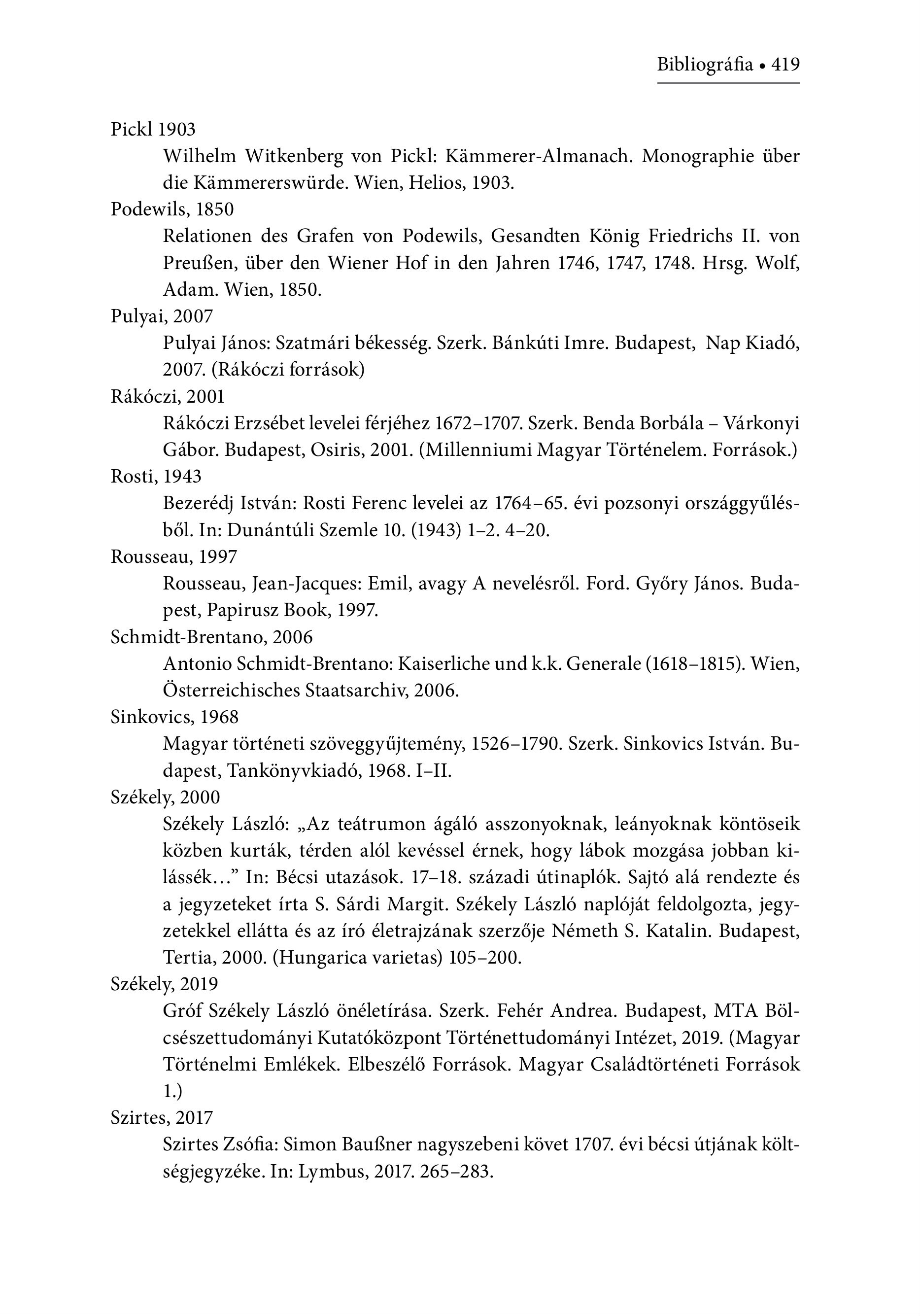 Bibliográfia + 419 Pickl 1903 Wilhelm Witkenberg von Pickl: Kämmerer-Almanach. Monographie über die Kammererswiirde. Wien, Helios, 1903. Podewils, 1850 Relationen des Grafen von Podewils, Gesandten König Friedrichs I. von Preußen, über den Wiener Hof in den Jahren 1746, 1747, 1748. Hrsg. Wolf, Adam. Wien, 1850. Pulyai, 2007 Pulyai János: Szatmári békesség. Szerk. Bánkúti Imre. Budapest, Nap Kiadó, 2007. (Rákóczi források) Rákóczi, 2001 Rákóczi Erzsébet levelei férjéhez 1672-1707. Szerk. Benda Borbála - Várkonyi Gábor. Budapest, Osiris, 2001. (Millenniumi Magyar Történelem. Források.) Rosti, 1943 Bezerédj István: Rosti Ferenc levelei az 1764-65. évi pozsonyi országgyűlésből. In: Dunántúli Szemle 10. (1943) 1-2. 4-20. Rousseau, 1997 Rousseau, Jean-Jacgues: Emil, avagy A nevelésről. Ford. Győry János. Budapest, Papirusz Book, 1997. Schmidt-Brentano, 2006 Antonio Schmidt-Brentano: Kaiserliche und k.k. Generale (1618-1815). Wien, Österreichisches Staatsarchiv, 2006. Sinkovics, 1968 Magyar történeti szöveggyűjtemény, 1526-1790. Szerk. Sinkovics István. Budapest, Tankönyvkiadó, 1968. I-II. Székely, 2000 Székely László: , Az teátrumon ágáló asszonyoknak, leányoknak köntöseik közben kurták, térden alól kevéssel érnek, hogy lábok mozgása jobban kilássék..." In: Bécsi utazások. 17-18. századi útinaplók. Sajtó alá rendezte és a jegyzeteket írta S. Sárdi Margit. Székely László naplóját feldolgozta, jegyzetekkel ellátta és az író életrajzának szerzője Németh S. Katalin. Budapest, Tertia, 2000. (Hungarica varietas) 105-200. Székely, 2019 Gróf Székely László önéletírása. Szerk. Fehér Andrea. Budapest, MTA Bölcsészettudományi Kutatóközpont Történettudományi Intézet, 2019. (Magyar Történelmi Emlékek. Elbeszélő Források. Magyar Családtörténeti Források 1.) Szirtes, 2017 Szirtes Zsófia: Simon BauBner nagyszebeni követ 1707. évi bécsi útjának költsegjegyzeke. In: Lymbus, 2017. 265-283.