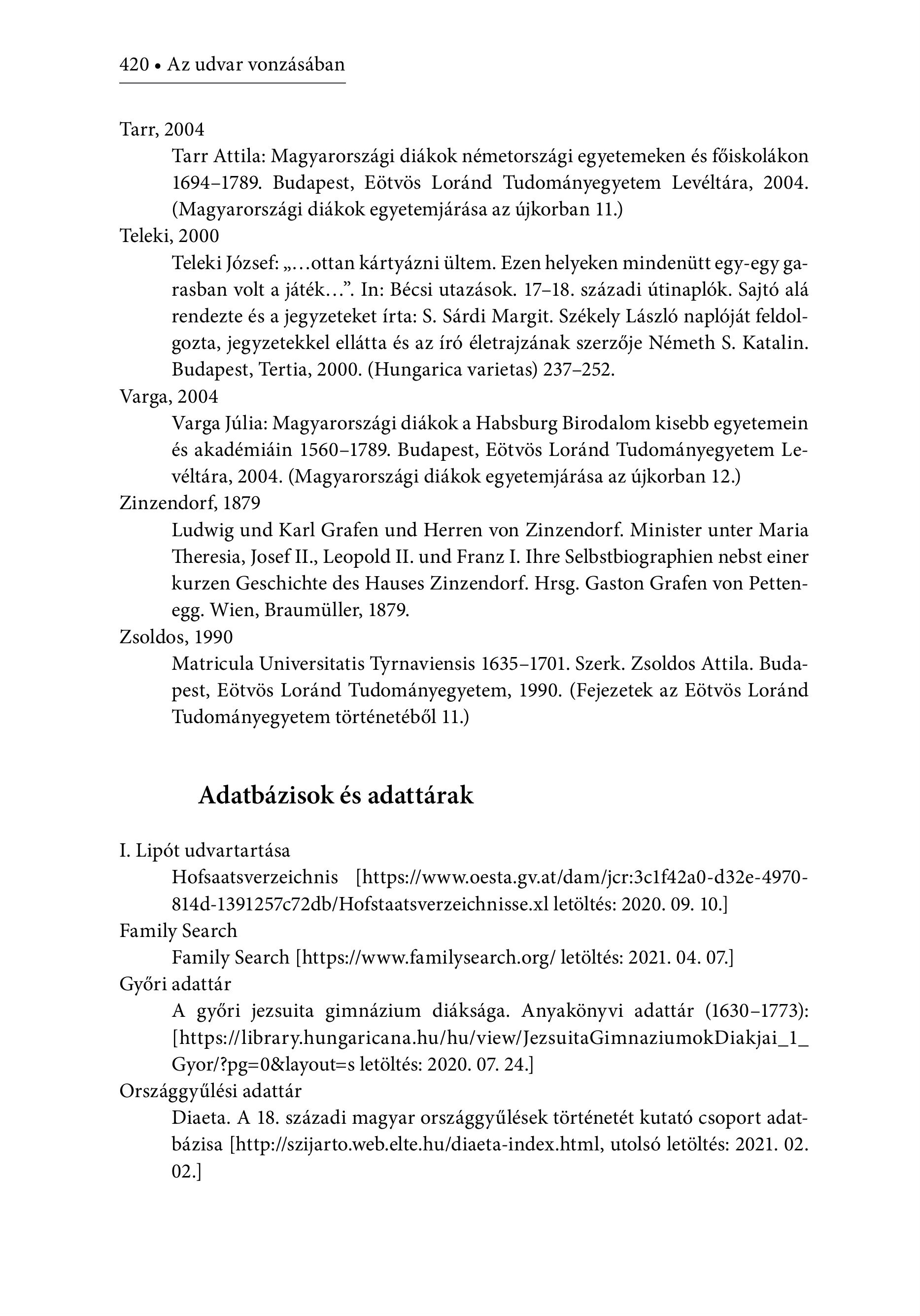420 e Az udvar vonzásában Tarr, 2004 Tarr Attila: Magyarországi diákok németországi egyetemeken és főiskolákon 1694-1789. Budapest, Eötvös Loránd Tudományegyetem Levéltára, 2004. (Magyarországi diákok egyetemjárása az újkorban 11.) Teleki, 2000 Teleki Jozsef: ,,...ottan kartyazni ültem. Ezen helyeken mindenütt egy-egy garasban volt a jatek...”. In: Bécsi utazások. 17-18. századi útinaplók. Sajtó alá rendezte és a jegyzeteket írta: S. Sárdi Margit. Székely László naplóját feldolgozta, jegyzetekkel ellátta és az író életrajzának szerzője Németh S. Katalin. Budapest, Tertia, 2000. (Hungarica varietas) 237-252. Varga, 2004 Varga Júlia: Magyarországi diákok a Habsburg Birodalom kisebb egyetemein és akadémiáin 1560-1789. Budapest, Eötvös Loránd Tudományegyetem Levéltára, 2004. (Magyarországi diákok egyetemjárása az újkorban 12.) Zinzendorf, 1879 Ludwig und Karl Grafen und Herren von Zinzendorf. Minister unter Maria Theresia, Josef II., Leopold II. und Franz I. Ihre Selbstbiographien nebst einer kurzen Geschichte des Hauses Zinzendorf. Hrsg. Gaston Grafen von Pettenegg. Wien, Braumüller, 1879. Zsoldos, 1990 Matricula Universitatis Tyrnaviensis 1635-1701. Szerk. Zsoldos Attila. Budapest, Eötvös Loránd Tudományegyetem, 1990. (Fejezetek az Eötvös Loránd Tudományegyetem történetéből 11.) Adatbázisok és adattárak I. Lipót udvartartása Hofsaatsverzeichnis [https://www.oesta.gv.at/dam/jcr:3c1f42a0-d32e-4970814d-1391257c72db/Hofstaatsverzeichnisse.xl letöltes: 2020. 09. 10.] Family Search Family Search [https://www.familysearch.org/ letöltes: 2021. 04. 07.] Győri adattár A győri jezsuita gimnázium diáksága. Anyakönyvi adattár (1630-1773): [https://library.hungaricana.hu/hu/view/JezsuitaGimnaziumokDiakjai_1_ Gyor/?pg=0&layout=s letdltés: 2020. 07. 24.] Országgyűlési adattár Diaeta. A 18. századi magyar országgyűlések történetét kutató csoport adatbázisa [http://szijarto.web.elte.hu/diaeta-index.html, utolsó letöltés: 2021. 02. 02.]