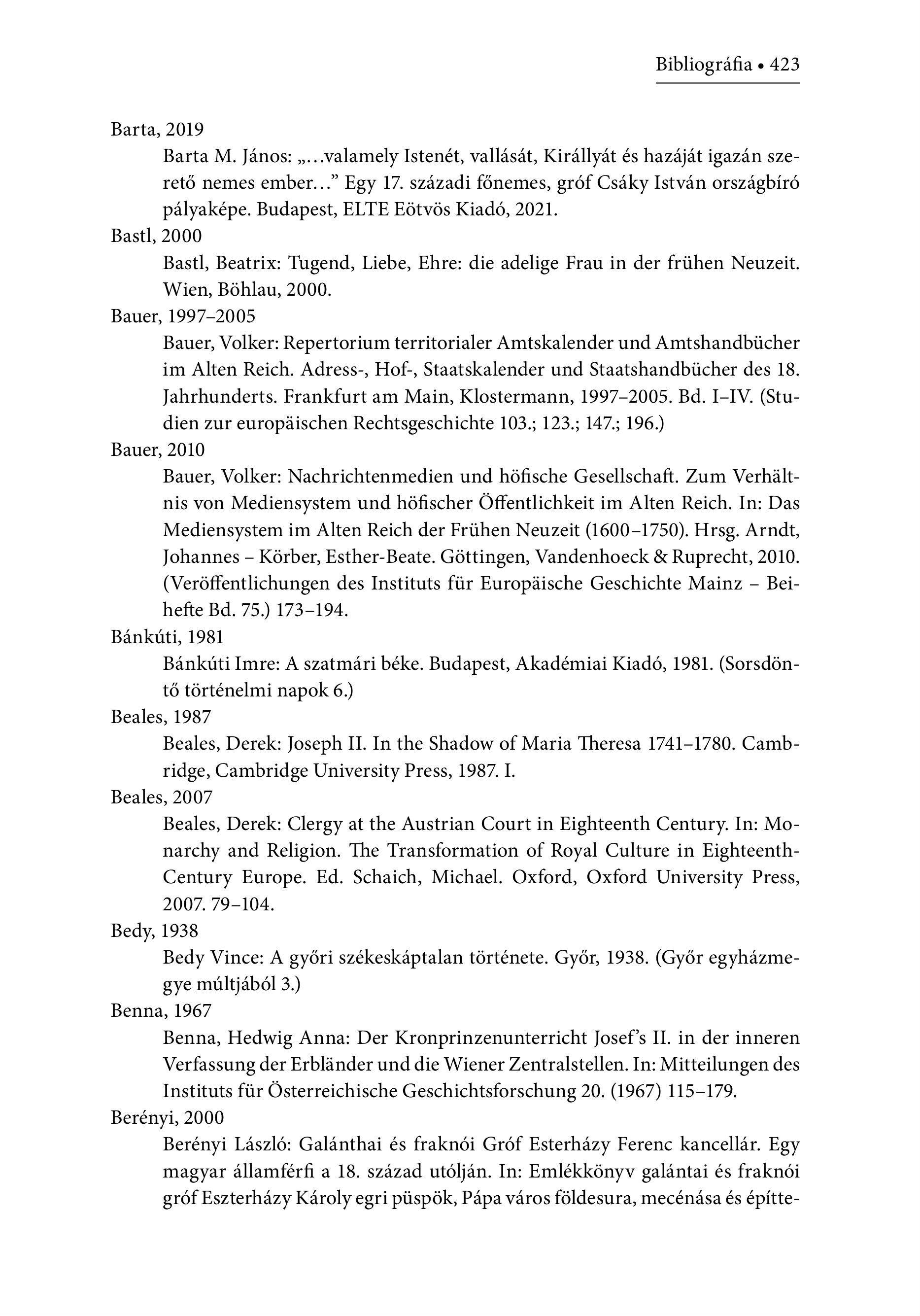 Bibliográfia e 423 Barta, 2019 Barta M. János: ,,. . valamely Istenét, vallását, Királlyát és hazáját igazán szerető nemes ember..." Egy 17. századi főnemes, gróf Csáky István országbíró pályaképe. Budapest, ELTE Eötvös Kiadó, 2021. Bastl, 2000 Bastl, Beatrix: Tugend, Liebe, Ehre: die adelige Frau in der frühen Neuzeit. Wien, Böhlau, 2000. Bauer, 1997-2005 Bauer, Volker: Repertorium territorialer Amtskalender und Amtshandbücher im Alten Reich. Adress-, Hof-, Staatskalender und Staatshandbücher des 18. Jahrhunderts. Frankfurt am Main, Klostermann, 1997-2005. Bd. I-IV. (Studien zur europäischen Rechtsgeschichte 103.; 123.; 147.; 196.) Bauer, 2010 Bauer, Volker: Nachrichtenmedien und höfische Gesellschaft. Zum Verhältnis von Mediensystem und höfischer Öffentlichkeit im Alten Reich. In: Das Mediensystem im Alten Reich der Frühen Neuzeit (1600-1750). Hrsg. Arndt, Johannes - Körber, Esther-Beate. Göttingen, Vandenhoeck & Ruprecht, 2010. (Veröffentlichungen des Instituts für Europäische Geschichte Mainz - Beihefte Bd. 75.) 173-194. Bänküti, 1981 Bánkúti Imre: A szatmári béke. Budapest, Akadémiai Kiadó, 1981. (Sorsdöntő történelmi napok 6.) Beales, 1987 Beales, Derek: Joseph II. In the Shadow of Maria Theresa 1741-1780. Cambridge, Cambridge University Press, 1987. I. Beales, 2007 Beales, Derek: Clergy at the Austrian Court in Eighteenth Century. In: Monarchy and Religion. The Transformation of Royal Culture in EighteenthCentury Europe. Ed. Schaich, Michael. Oxford, Oxford University Press, 2007. 79-104. Bedy, 1938 Bedy Vince: A győri székeskáptalan története. Győr, 1938. (Győr egyhazmegye múltjából 3.) Benna, 1967 Benna, Hedwig Anna: Der Kronprinzenunterricht Josef’s I. in der inneren Verfassung der Erbländer und die Wiener Zentralstellen. In: Mitteilungen des Instituts für Österreichische Geschichtsforschung 20. (1967) 115-179. Berenyi, 2000 Berényi László: Galánthai és fraknói Gróf Esterházy Ferenc kancellár. Egy magyar államférfi a 18. század utólján. In: Emlékkönyv galántai és fraknói gróf Eszterházy Károly egri püspök, Pápa város földesura, mecénása és építte