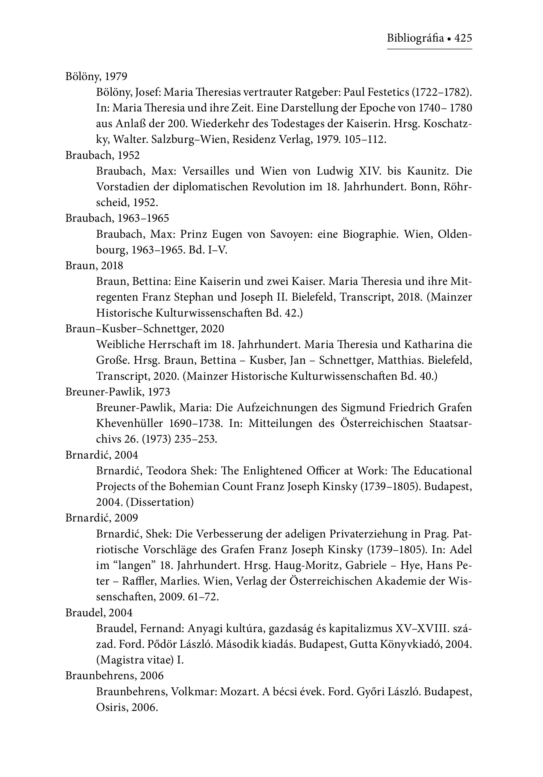 Bibliográfia e 425 Bölöny, 1979 Bölöny, Josef: Maria Iheresias vertrauter Ratgeber: Paul Festetics (1722-1782). In: Maria Theresia und ihre Zeit. Eine Darstellung der Epoche von 1740- 1780 aus Anlaf der 200. Wiederkehr des Todestages der Kaiserin. Hrsg. Koschatzky, Walter. Salzburg-Wien, Residenz Verlag, 1979. 105-112. Braubach, 1952 Braubach, Max: Versailles und Wien von Ludwig XIV. bis Kaunitz. Die Vorstadien der diplomatischen Revolution im 18. Jahrhundert. Bonn, Röhrscheid, 1952. Braubach, 1963-1965 Braubach, Max: Prinz Eugen von Savoyen: eine Biographie. Wien, Oldenbourg, 1963-1965. Bd. I-V. Braun, 2018 Braun, Bettina: Eine Kaiserin und zwei Kaiser. Maria Theresia und ihre Mitregenten Franz Stephan und Joseph II. Bielefeld, Transcript, 2018. (Mainzer Historische Kulturwissenschaften Bd. 42.) Braun-Kusber-Schnettger, 2020 Weibliche Herrschaft im 18. Jahrhundert. Maria Theresia und Katharina die Große. Hrsg. Braun, Bettina - Kusber, Jan - Schnettger, Matthias. Bielefeld, Transcript, 2020. (Mainzer Historische Kulturwissenschaften Bd. 40.) Breuner-Pawlik, 1973 Breuner-Pawlik, Maria: Die Aufzeichnungen des Sigmund Friedrich Grafen Khevenhüller 1690-1738. In: Mitteilungen des Österreichischen Staatsarchivs 26. (1973) 235-253. Brnardic, 2004 Brnardic, Teodora Shek: The Enlightened Officer at Work: The Educational Projects of the Bohemian Count Franz Joseph Kinsky (1739-1805). Budapest, 2004. (Dissertation) Brnardic, 2009 Brnardic, Shek: Die Verbesserung der adeligen Privaterziehung in Prag. Patriotische Vorschläge des Grafen Franz Joseph Kinsky (1739-1805). In: Adel im “langen” 18. Jahrhundert. Hrsg. Haug-Moritz, Gabriele - Hye, Hans Peter - Raffler, Marlies. Wien, Verlag der Österreichischen Akademie der Wissenschaften, 2009. 61-72. Braudel, 2004 Braudel, Fernand: Anyagi kultúra, gazdaság és kapitalizmus XV-XVIII. század. Ford. Pődör László. Második kiadás. Budapest, Gutta Könyvkiadó, 2004. (Magistra vitae) I. Braunbehrens, 2006 Braunbehrens, Volkmar: Mozart. A bécsi évek. Ford. Győri László. Budapest, Osiris, 2006.