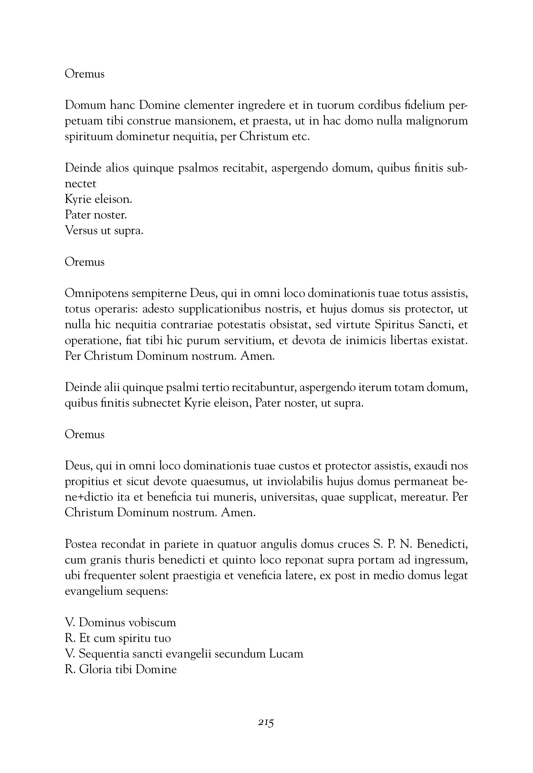 Oremus Domum hanc Domine clementer ingredere et in tuorum cordibus fidelium per petuam tibi construe mansionem, et praesta, ut in hac domo nulla malignorum spirituum dominetur nequitia, per Christum etc. Deinde alios quinque psalmos recitabit, aspergendo domum, quibus finitis subnectet Kyrie eleison. Pater noster. Versus ut supra. Oremus Omnipotens sempiterne Deus, qui in omni loco dominationis tuae totus assistis, totus operaris: adesto supplicationibus nostris, et hujus domus sis protector, ut nulla hic nequitia contrariae potestatis obsistat, sed virtute Spiritus Sancti, et operatione, fiat tibi hic purum servitium, et devota de inimicis libertas existat. Per Christum Dominum nostrum. Amen. Deinde alii quinque psalmi tertio recitabuntur, aspergendo iterum totam domum, quibus finitis subnectet Kyrie eleison, Pater noster, ut supra. Oremus Deus, qui in omni loco dominationis tuae custos et protector assistis, exaudi nos propitius et sicut devote quaesumus, ut inviolabilis hujus domus permaneat benetdictio ita et beneficia tui muneris, universitas, quae supplicat, mereatur. Per Christum Dominum nostrum. Amen. Postea recondat in pariete in quatuor angulis domus cruces S. P. N. Benedicti, cum granis thuris benedicti et quinto loco reponat supra portam ad ingressum, ubi frequenter solent praestigia et veneficia latere, ex post in medio domus legat evangelium sequens: V. Dominus vobiscum R. Et cum spiritu tuo V. Sequentia sancti evangelii secundum Lucam R. Gloria tibi Domine 215