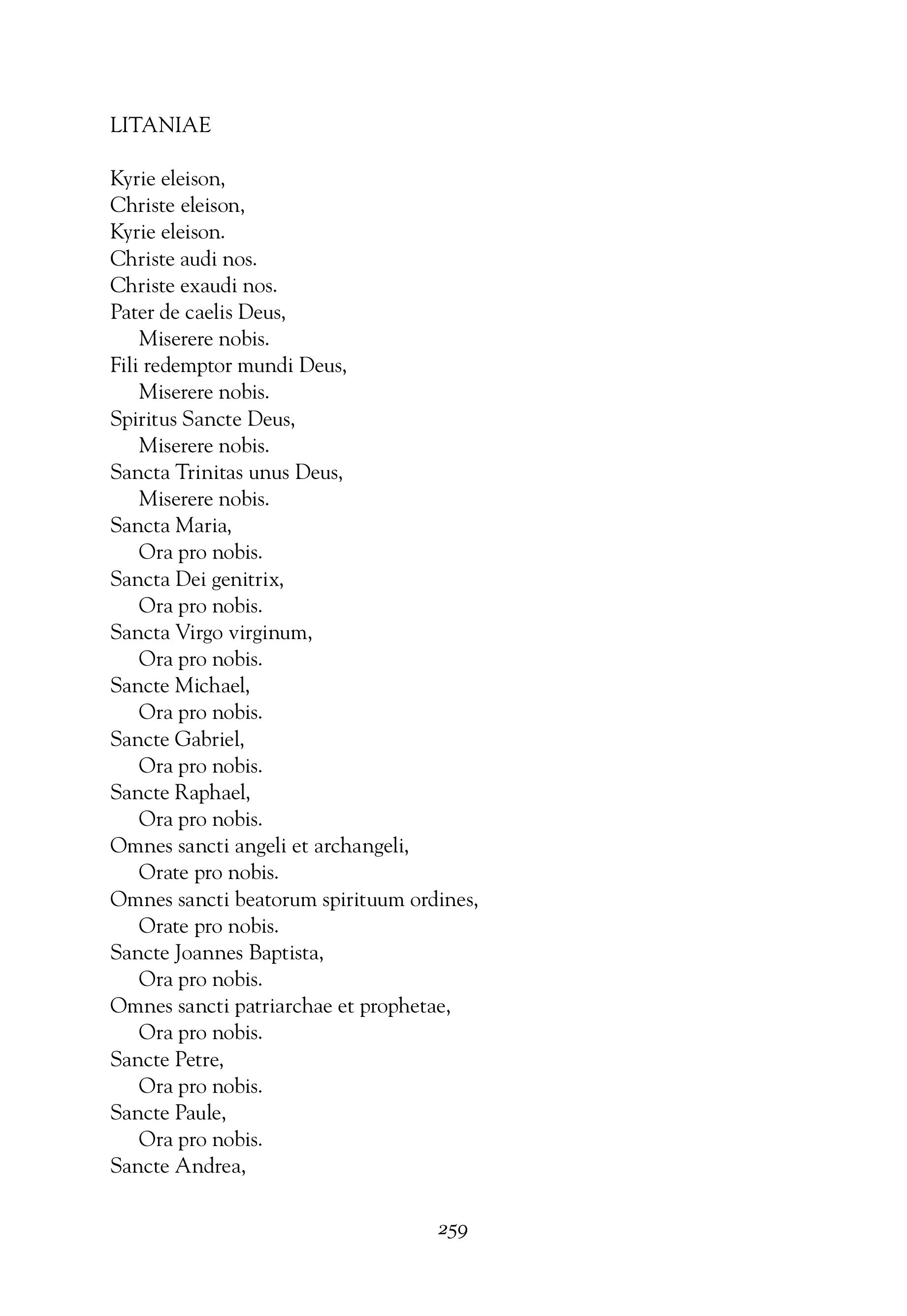 LITANIAE Kyrie eleison, Christe eleison, Kyrie eleison. Christe audi nos. Christe exaudi nos. Pater de caelis Deus, Miserere nobis. Fili redemptor mundi Deus, Miserere nobis. Spiritus Sancte Deus, Miserere nobis. Sancta Trinitas unus Deus, Miserere nobis. Sancta Maria, Ora pro nobis. Sancta Dei genitrix, Ora pro nobis. Sancta Virgo virginum, Ora pro nobis. Sancte Michael, Ora pro nobis. Sancte Gabriel, Ora pro nobis. Sancte Raphael, Ora pro nobis. Omnes sancti angeli et archangeli, Orate pro nobis. Omnes sancti beatorum spirituum ordines, Orate pro nobis. Sancte Joannes Baptista, Ora pro nobis. Omnes sancti patriarchae et prophetae, Ora pro nobis. Sancte Petre, Ora pro nobis. Sancte Paule, Ora pro nobis. Sancte Andrea, 259