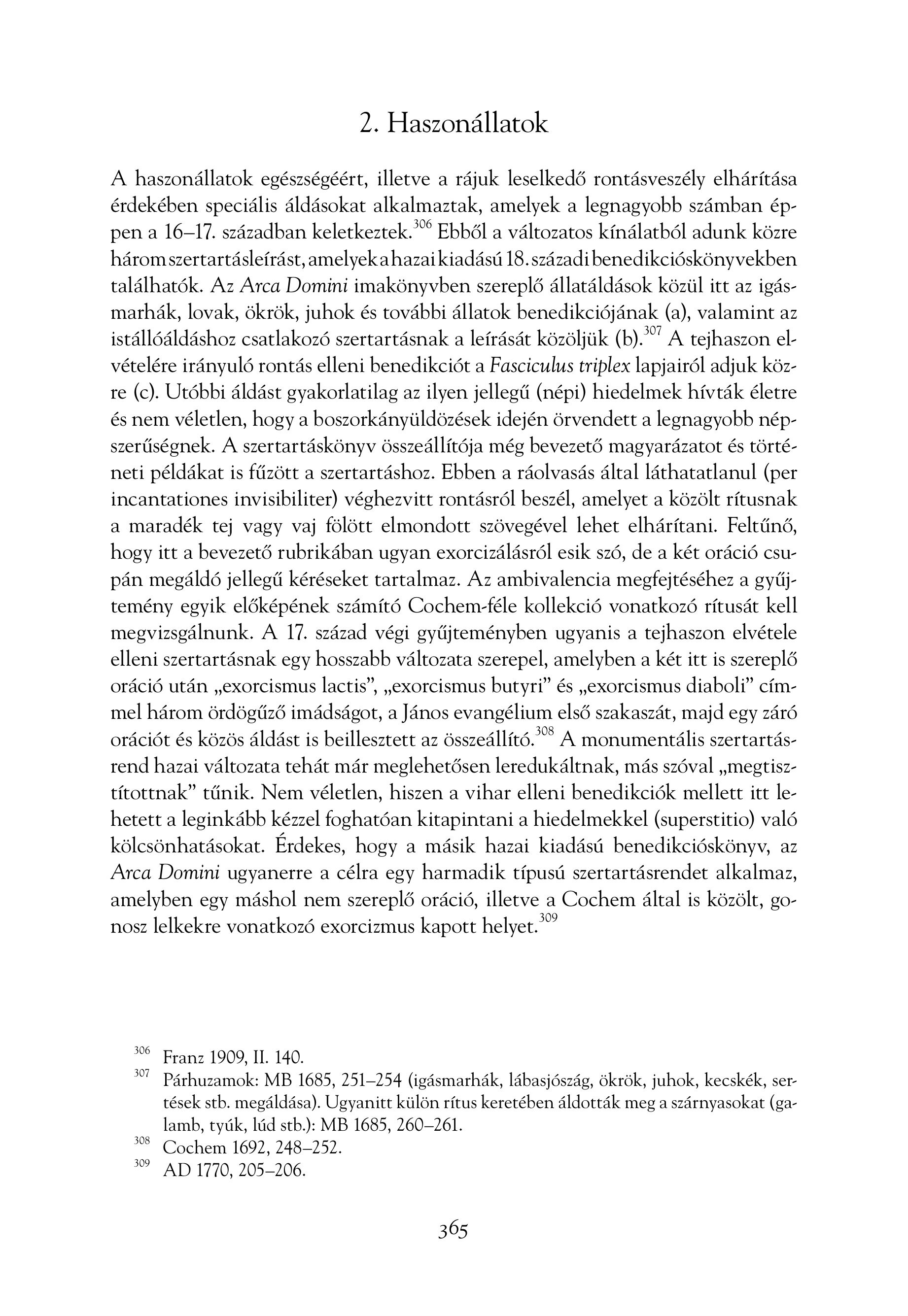 2. Haszonállatok A haszonállatok egészségéért, illetve a rájuk leselkedő rontásveszély elhárítása érdekében speciális áldásokat alkalmaztak, amelyek a legnagyobb számban éppen a 16-17. században keletkeztek." Ebből a változatos kínálatból adunk közre három szertartásleírást, amelyekahazai kiadású 18. századi benedikcióskönyvekben találhatók. Az Arca Domini imakönyvben szereplő állatáldások közül itt az igásmarhák, lovak, ökrök, juhok és további állatok benedikciójának (a), valamint az istállóáldáshoz csatlakozó szertartásnak a leírását közöljük (b)." A tejhaszon el vételére irányuló rontás elleni benedikciót a Fasciculus triplex lapjairól adjuk közre (c). Utóbbi áldást gyakorlatilag az ilyen jellegű (népi) hiedelmek hívták életre és nem véletlen, hogy a boszorkányüldözések idején örvendett a legnagyobb népszerűségnek. A szertartáskönyv összeállítója még bevezető magyarázatot és történeti példákat is fűzött a szertartáshoz. Ebben a ráolvasás által láthatatlanul (per incantationes invisibiliter) véghezvitt rontásról beszél, amelyet a közölt rítusnak a maradék tej vagy vaj fölött elmondott szövegével lehet elhárítani. Feltűnő, hogy itt a bevezető rubrikában ugyan exorcizálásról esik szó, de a két oráció csupán megáldó jellegű kéréseket tartalmaz. Az ambivalencia megfejtéséhez a gyűjtemény egyik előképének számító Cochem-féle kollekció vonatkozó rítusát kell megvizsgálnunk. A 17. század végi gyűjteményben ugyanis a tejhaszon elvétele elleni szertartásnak egy hosszabb változata szerepel, amelyben a kért itt is szereplő oráció után , exorcismus lactis", , exorcismus butyri" és , exorcismus diaboli” cimmel három ördögűző imádságot, a János evangélium első szakaszát, majd egy záró orációt és közös áldást is beillesztett az összeállító." A monumentális szertartásrend hazai változata tehát már meglehetősen leredukáltnak, más szóval , megtisztítottnak" tűnik. Nem véletlen, hiszen a vihar elleni benedikciók mellett itt lehetett a leginkább kézzel foghatóan kitapintani a hiedelmekkel (superstitio) való kölcsönhatásokat. Érdekes, hogy a másik hazai kiadású benedikcióskönyv, az Arca Domini ugyanerre a célra egy harmadik típusú szertartásrendet alkalmaz, amelyben egy máshol nem szereplő oráció, illetve a Cochem által is közölt, gonosz lelkekre vonatkozó exorcizmus kapott helyet." Franz 1909, II. 140. 7° Pérhuzamok: MB 1685, 251-254 (igäsmarhäk, läbasjöszäg, ökrök, juhok, kecskek, sertések stb. megáldása). Ugyanitt külön rítus keretében áldották meg a szárnyasokat (galamb, tyúk, lúd stb.): MB 1685, 260-261. 5 Cochem 1692, 248-252. 99 AD 1770, 205-206. 365