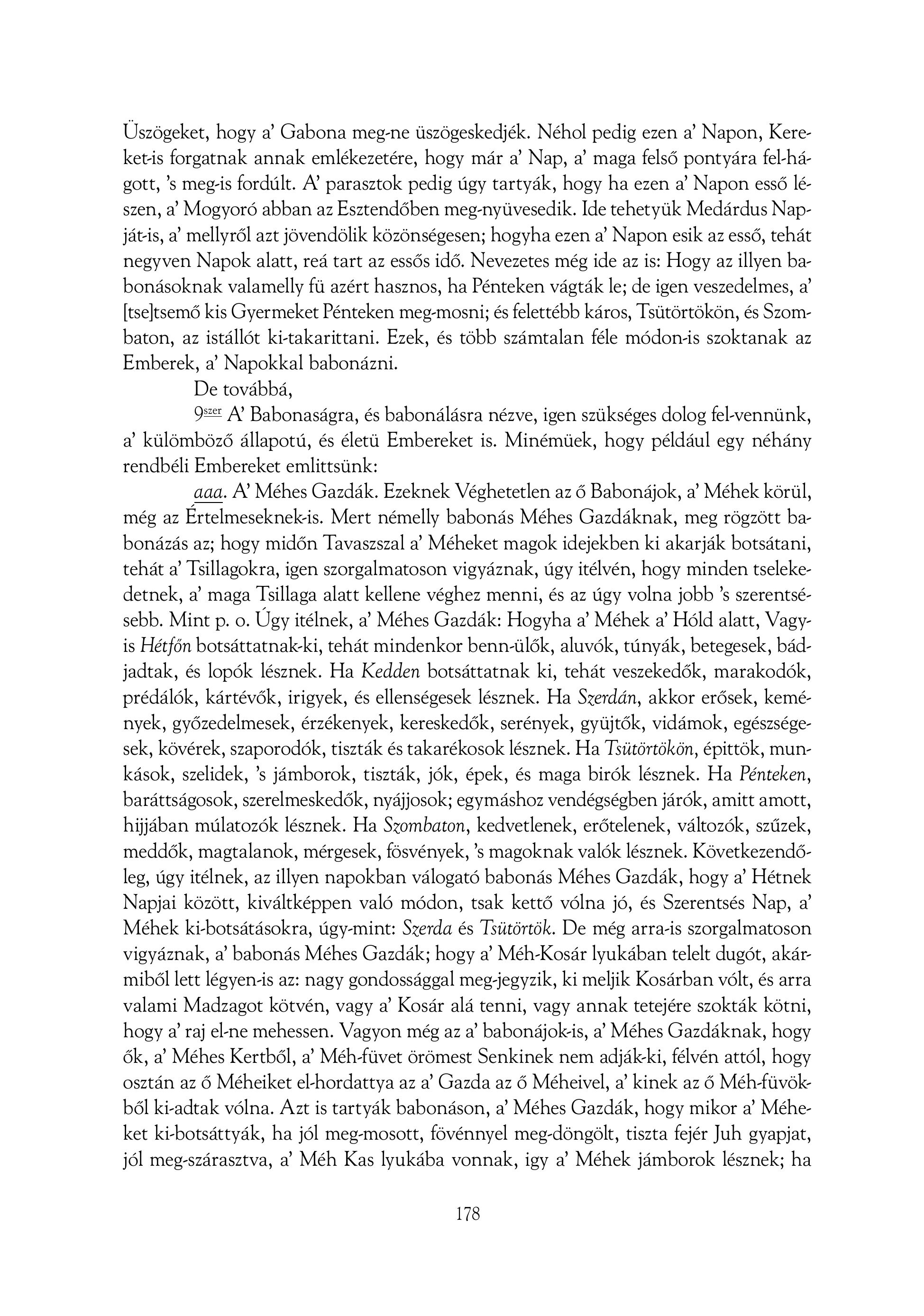 Uszögeket, hogy a Gabona meg-ne üszögeskedjék. Néhol pedig ezen a" Napon, Kereketis forgatnak annak emlékezetére, hogy már a" Nap, a" maga felső pontyára fel-hágott, ’s meg-is fordult. A’ parasztok pedig ugy tartyak, hogy ha ezen a" Napon esső lészen, a Mogyoró abban az Esztendöben meg-nyüvesedik. Ide tehetyük Medärdus Napjät-is, a mellyről azt jövendölik közönségesen; hogyha ezen a" Napon esik az esső, tehát negyven Napok alatt, reá tart az essős idő. Nevezetes még ide az is: Hogy az illyen babonásoknak valamelly fü azért hasznos, ha Pénteken vágták le; de igen veszedelmes, a [tseltsemő kis Gyermeket Pénteken meg-mosni; és felettébb káros, Tsütörtökön, és Szombaton, az istállót kirtakarittani. Ezek, és több számtalan féle módonis szoktanak az Emberek, a" Napokkal babonázni. De továbbá, 95zr A! Babonaságra, és babonálásra nézve, igen szükséges dolog felvennünk, a" külömböző állapotú, és életü Embereket is. Minémüek, hogy például egy néhány rendbéli Embereket emlittsünk: aaa. A Méhes Gazdák. Ezeknek Véghetetlen az ő Babonájok, a Méhek körül, még az Értelmeseknekis. Mert némelly babonás Méhes Gazdäknak, meg rögzött babonázás az; hogy midőn Tavaszszal a Méheket magok idejekben ki akarják botsátani, tehát a" Tsillagokra, igen szorgalmatoson vigyáznak, úgy itélvén, hogy minden tselekedetnek, a’ maga Tsillaga alatt kellene véghez menni, és az úgy volna jobb ’s szerentsésebb. Mint p. o. Úgy itélnek, a Méhes Gazdák: Hogyha a" Méhek a’ Hóld alatt, Vagyis Hétfőn botsáttatnak-ki, tehát mindenkor benn-ülők, aluvók, túnyák, betegesek, bádjadtak, és lopók lésznek. Ha Kedden botsáttatnak ki, tehát veszekedők, marakodók, prédálók, kártévők, irigyek, és ellenségesek lésznek. Ha Szerdán, akkor erősek, kemények, győzedelmesek, érzékenyek, kereskedők, serények, gyüjtők, vidámok, egészségesek, kövérek, szaporodók, tiszták és takarékosok lésznek. Ha Tsütörtökön, épittök, munkások, szelidek, s jámborok, tiszták, jók, épek, és maga birók lésznek. Ha Pénteken, baráttságosok, szerelmeskedők, nyájjosok; egymáshoz vendégségben járók, amitt amott, hijjában múlatozók lésznek. Ha Szombaton, kedvetlenek, erőtelenek, változók, szűzek, meddők, magtalanok, mérgesek, fösvények, s magoknak valók lésznek. Következendőleg, úgy itélnek, az illyen napokban válogató babonás Méhes Gazdák, hogy a" Hétnek Napjai között, kiváltképpen való módon, tsak kettő vólna jó, és Szerentsés Nap, a’ Méhek ki-botsátásokra, úgy-mint: Szerda és Tsütörtök. De még arra-is szorgalmatoson vigyáznak, a" babonás Méhes Gazdák; hogy a’ Meh-Kosär Iyukäban telelt dugöt, akärmibdl lett légyen-is az: nagy gondossdggal meg-jegyzik, ki meljik Kosarban volt, és arra valami Madzagot kötven, vagy a’ Kosar ala tenni, vagy annak tetejére szokták kötni, hogy a! raj el-ne mehessen. Vagyon még az a" babonájokis, a Méhes Gazdáknak, hogy ők, a Méhes Kertből, a Méh-füvet örömest Senkinek nem adjákki, félvén attól, hogy osztán az 6 Méheiket el-hordattya az a’ Gazda az 6 Méheivel, a" kinek az ő Meh-füvökből ki-adtak vólna. Azt is tartyák babonáson, a" Méhes Gazdák, hogy mikor a" Méheket ki-botsáttyák, ha jól meg-mosott, fövénnyel meg-döngölt, tiszta fejér Juh gyapjat, jól meg-szárasztva, a Méh Kas lyukába vonnak, igy a Méhek jámborok lésznek; ha 178