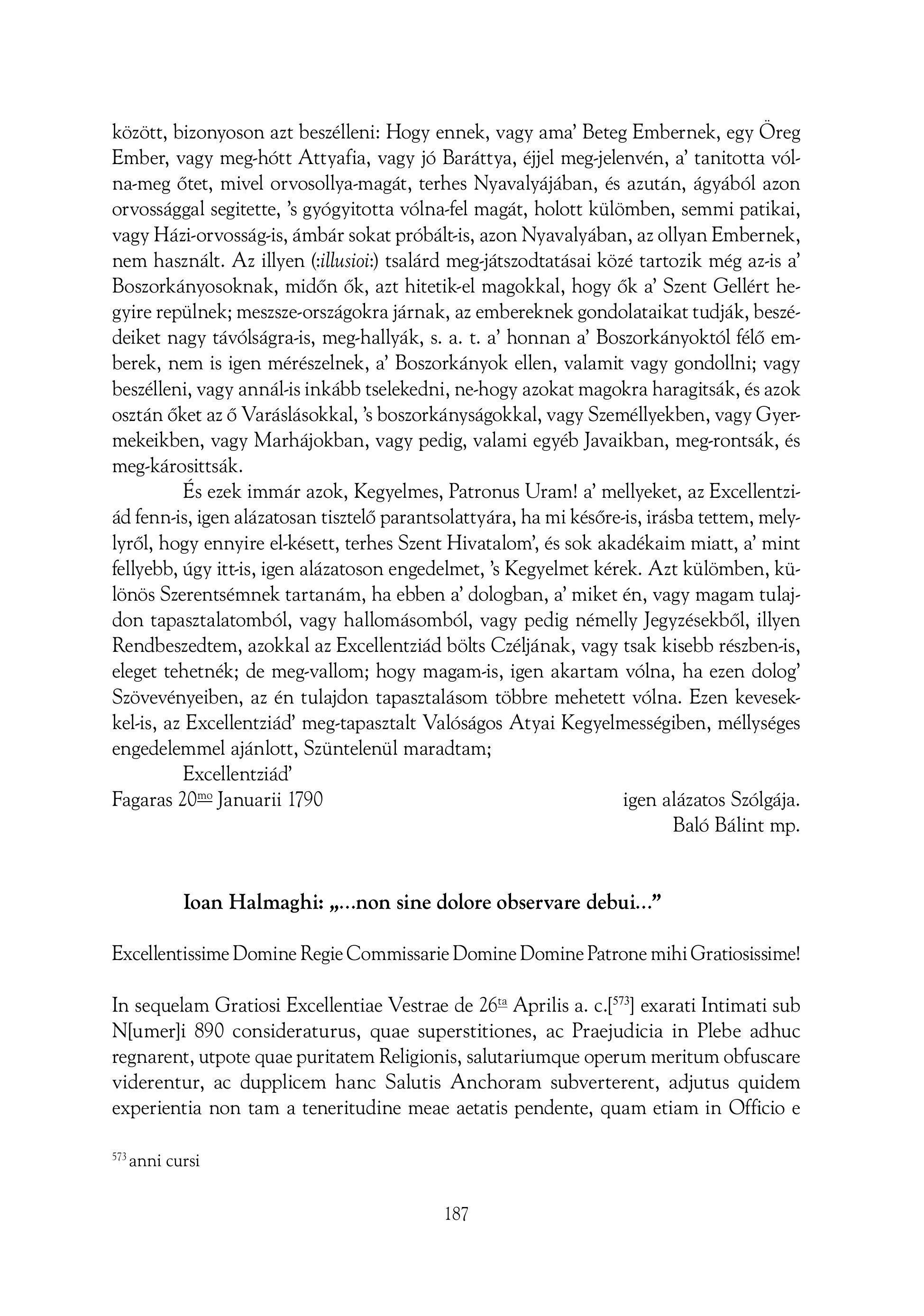 között, bizonyoson azt beszélleni: Hogy ennek, vagy ama? Beteg Embernek, egy Öreg Ember, vagy meg-hott Attyafia, vagy j6 Baráttya, éjjel megjelenvén, a" tanitotta vól na-meg őtet, mivel orvosollya-magát, terhes Nyavalyájában, és azután, ágyából azon orvossággal segitette, s gyógyitotta vólna-fel magát, holott külömben, semmi patikai, vagy Häzi-orvossäg-is, ämbär sokat pröbält-is, azon Nyavalyäban, az ollyan Embernek, nem használt. Az illyen (illusioi:) tsalárd megjátszodtatásai közé tartozik még azis a Boszorkányosoknak, midőn ők, azt hitetik-el magokkal, hogy ők a" Szent Gellért hegyire repülnek; meszsze-országokra járnak, az embereknek gondolataikat tudják, beszédeiket nagy távólságra-is, meg-hallyák, s. a. t. a honnan a" Boszorkányoktól félő emberek, nem is igen mereszelnek, a’ Boszorkänyok ellen, valamit vagy gondollni; vagy beszelleni, vagy annäl-is inkäbb tselekedni, ne-hogy azokat magokra haragitsäk, és azok osztán őket az 6 Varäsläsokkal, ’s boszorkänysägokkal, vagy Szemellyekben, vagy Gyermekeikben, vagy Marhäjokban, vagy pedig, valami egyéb Javaikban, meg-rontsäk, és meg-kärosittsäk. És ezek immár azok, Kegyelmes, Patronus Uram! a’ mellyeket, az Excellentziäd fenn-is, igen aläzatosan tisztelö parantsolattyära, ha mi kesöreiis, iräsba tettem, melylyról, hogy ennyire el-késett, terhes Szent Hivatalom, és sok akadékaim miatt, a" mint fellyebb, úgy ittis, igen alázatoson engedelmet, s Kegyelmet kérek. Azt külömben, különös Szerentsemnek tartanám, ha ebben a! dologban, a" miket én, vagy magam tulajdon tapasztalatomból, vagy hallomásomból, vagy pedig némelly Jegyzésekből, illyen Rendbeszedtem, azokkal az Excellentziád bölts Czéljának, vagy tsak kisebb részben-is, eleget tehetnék; de meg-vallom; hogy magamis, igen akartam vólna, ha ezen dolog? Szövevényeiben, az én tulajdon tapasztalásom többre mehetett vólna. Ezen kevesekkel-is, az Excellentziäd’ meg-tapasztalt Valösägos Atyai Kegyelmessegiben, mellyseges engedelemmel ajänlott, Szüntelenül maradtam; Excellentziäd’ Fagaras 202 Januarii 1790 igen alázatos Szólgája. Baló Bálint mp. Ioan Halmaghi: ,,...non sine dolore observare debui...” Excellentissime Domine Regie Commissarie Domine Domine Patrone mihi Gratiosissime! In sequelam Gratiosi Excellentiae Vestrae de 26" Aprilis a. c.[’”] exarati Intimati sub Nfumerli 890 consideraturus, quae superstitiones, ac Praejudicia in Plebe adhuc regnarent, utpote quae puritatem Religionis, salutariumque operum meritum obfuscare viderentur, ac dupplicem hanc Salutis Anchoram subverterent, adjutus quidem experientia non tam a teneritudine meae aetatis pendente, quam etiam in Officio e 53 anni cursi 187