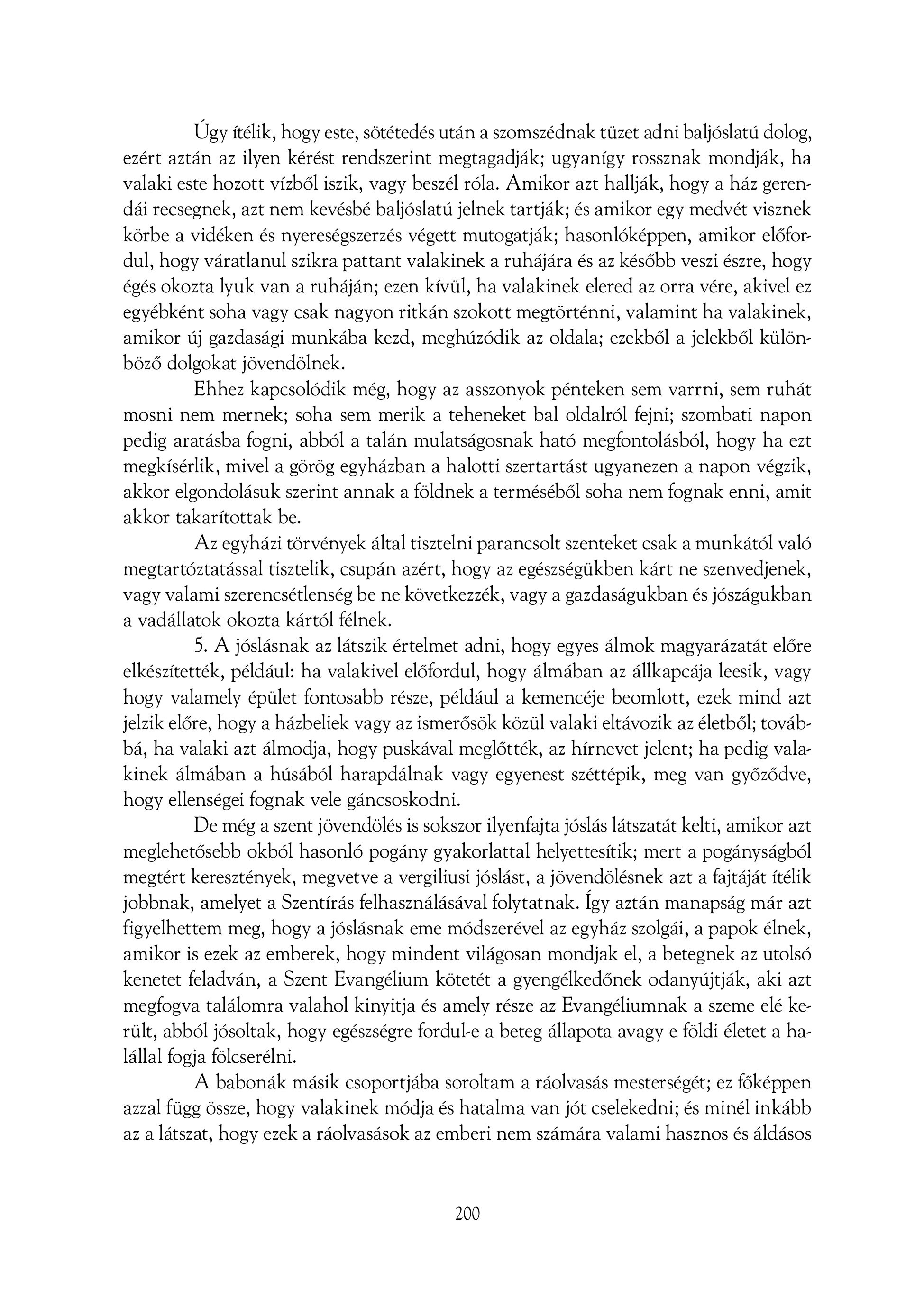 Úgy ítélik, hogy este, sötétedés után a szomszédnak tüzet adni baljóslatú dolog, ezért aztán az ilyen kérést rendszerint megtagadják; ugyanígy rossznak mondják, ha valaki este hozott vízből iszik, vagy beszél róla. Amikor azt hallják, hogy a ház gerendái recsegnek, azt nem kevésbé baljóslatú jelnek tartják; és amikor egy medvét visznek körbe a vidéken és nyereségszerzés végett mutogatják; hasonlóképpen, amikor előfordul, hogy váratlanul szikra pattant valakinek a ruhájára és az később veszi észre, hogy égés okozta lyuk van a ruháján; ezen kívül, ha valakinek elered az orra vére, akivel ez egyébként soha vagy csak nagyon ritkán szokott megtörténni, valamint ha valakinek, amikor új gazdasági munkába kezd, meghúzódik az oldala; ezekből a jelekből különböző dolgokat jövendölnek. Ehhez kapcsolódik még, hogy az asszonyok pénteken sem varrni, sem ruhát mosni nem mernek; soha sem merik a teheneket bal oldalról fejni; szombati napon pedig aratásba fogni, abból a talán mulatságosnak ható megfontolásból, hogy ha ezt megkísérlik, mivel a görög egyházban a halotti szertartást ugyanezen a napon végzik, akkor elgondolásuk szerint annak a földnek a terméséből soha nem fognak enni, amit akkor takarítottak be. Az egyházi törvények által tisztelni parancsolt szenteket csak a munkától való megtartóztatással tisztelik, csupán azért, hogy az egészségükben kárt ne szenvedjenek, vagy valami szerencsétlenség be ne következzék, vagy a gazdaságukban és jószágukban a vadállatok okozta kártól félnek. 5. A jóslásnak az látszik értelmet adni, hogy egyes álmok magyarázatát előre elkészítették, például: ha valakivel előfordul, hogy álmában az állkapcája leesik, vagy hogy valamely épület fontosabb része, például a kemencéje beomlott, ezek mind azt jelzik előre, hogy a házbeliek vagy az ismerősök közül valaki eltávozik az életből; továbbá, ha valaki azt álmodja, hogy puskával meglőtték, az hírnevet jelent; ha pedig valakinek álmában a húsából harapdálnak vagy egyenest széttépik, meg van győződve, hogy ellenségei fognak vele gáncsoskodni. De még a szent jövendölés is sokszor ilyenfajta jóslás látszatát kelti, amikor azt meglehetősebb okból hasonló pogány gyakorlattal helyettesítik; mert a pogányságból megtért keresztények, megvetve a vergiliusi jóslást, a jövendölésnek azt a fajtáját ítélik jobbnak, amelyet a Szentírás felhasználásával folytatnak. Így aztán manapság már azt figyelhettem meg, hogy a jóslásnak eme módszerével az egyház szolgái, a papok élnek, amikor is ezek az emberek, hogy mindent világosan mondjak el, a betegnek az utolsó kenetet feladván, a Szent Evangélium kötetét a gyengélkedőnek odanyújtják, aki azt megfogva találomra valahol kinyitja és amely része az Evangéliumnak a szeme elé került, abból jósoltak, hogy egészségre fordule a beteg állapota avagy e földi életet a halállal fogja fölcserélni. A babonák másik csoportjába soroltam a ráolvasás mesterségét; ez főképpen azzal függ össze, hogy valakinek módja és hatalma van jót cselekedni; és minél inkább az a látszat, hogy ezek a ráolvasások az emberi nem számára valami hasznos és áldásos 200