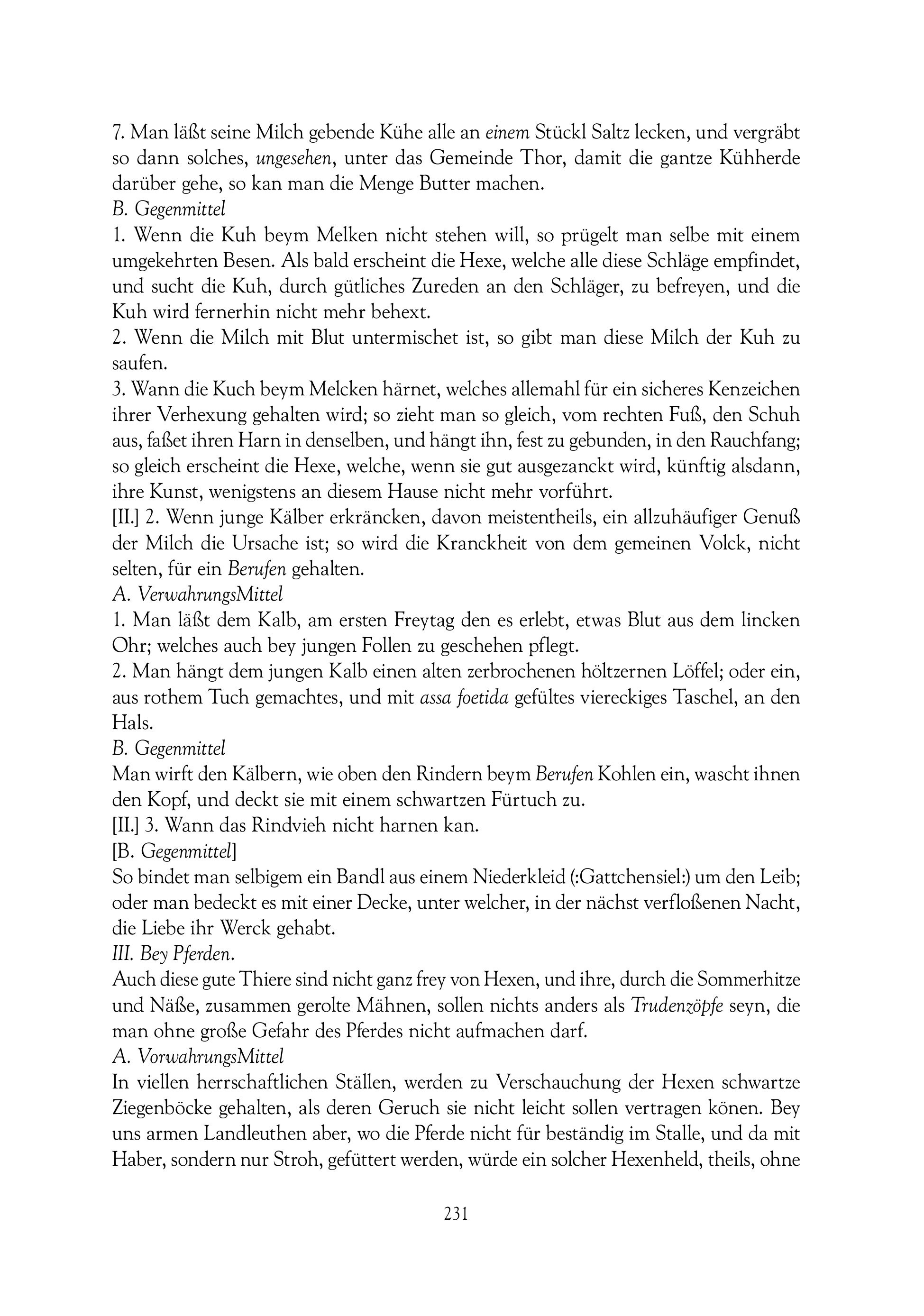 7. Man läßt seine Milch gebende Kühe alle an einem Stückl Saltz lecken, und vergräbt so dann solches, ungesehen, unter das Gemeinde Thor, damit die gantze Kühherde darüber gehe, so kan man die Menge Butter machen. B. Gegenmittel 1. Wenn die Kuh beym Melken nicht stehen will, so prügelt man selbe mit einem umgekehrten Besen. Als bald erscheint die Hexe, welche alle diese Schläge empfindet, und sucht die Kuh, durch gütliches Zureden an den Schläger, zu befreyen, und die Kuh wird fernerhin nicht mehr behext. 2. Wenn die Milch mit Blut untermischet ist, so gibt man diese Milch der Kuh zu saufen. 3. Wann die Kuch beym Melcken härnet, welches allemahl für ein sicheres Kenzeichen ihrer Verhexung gehalten wird; so zieht man so gleich, vom rechten Fuß, den Schuh aus, faßet ihren Harn in denselben, und hängt ihn, fest zu gebunden, in den Rauchfang; so gleich erscheint die Hexe, welche, wenn sie gut ausgezanckt wird, künftig alsdann, ihre Kunst, wenigstens an diesem Hause nicht mehr vorführt. [IL] 2. Wenn junge Kälber erkräncken, davon meistentheils, ein allzuhäufiger Genuß der Milch die Ursache ist; so wird die Kranckheit von dem gemeinen Volck, nicht selten, für ein Berufen gehalten. A. VerwahrungsMittel 1. Man läßt dem Kalb, am ersten Freytag den es erlebt, etwas Blut aus dem lincken Ohr; welches auch bey jungen Follen zu geschehen pflegt. 2. Man hängt dem jungen Kalb einen alten zerbrochenen höltzernen Löffel; oder ein, aus rothem Tuch gemachtes, und mit assa foetida gefültes viereckiges Taschel, an den Hals. B. Gegenmittel Man wirft den Kälbern, wie oben den Rindern beym Berufen Kohlen ein, wascht ihnen den Kopf, und deckt sie mit einem schwartzen Fürtuch zu. [IL] 3. Wann das Rindvieh nicht harnen kan. [B. Gegenmittel] So bindet man selbigem ein Bandl aus einem Niederkleid (:Gattchensiel:) um den Leib; oder man bedeckt es mit einer Decke, unter welcher, in der nächst verfloßenen Nacht, die Liebe ihr Werck gehabt. III. Bey Pferden. Auch diese gute Thiere sind nicht ganz frey von Hexen, und ihre, durch die Sommerhitze und Nafe, zusammen gerolte Mahnen, sollen nichts anders als Trudenzépfe seyn, die man ohne große Gefahr des Pferdes nicht aufmachen darf. A. VorwahrungsMittel In viellen herrschaftlichen Ställen, werden zu Verschauchung der Hexen schwartze Ziegenböcke gehalten, als deren Geruch sie nicht leicht sollen vertragen könen. Bey uns armen Landleuthen aber, wo die Pferde nicht für beständig im Stalle, und da mit Haber, sondern nur Stroh, gefüttert werden, würde ein solcher Hexenheld, theils, ohne 231