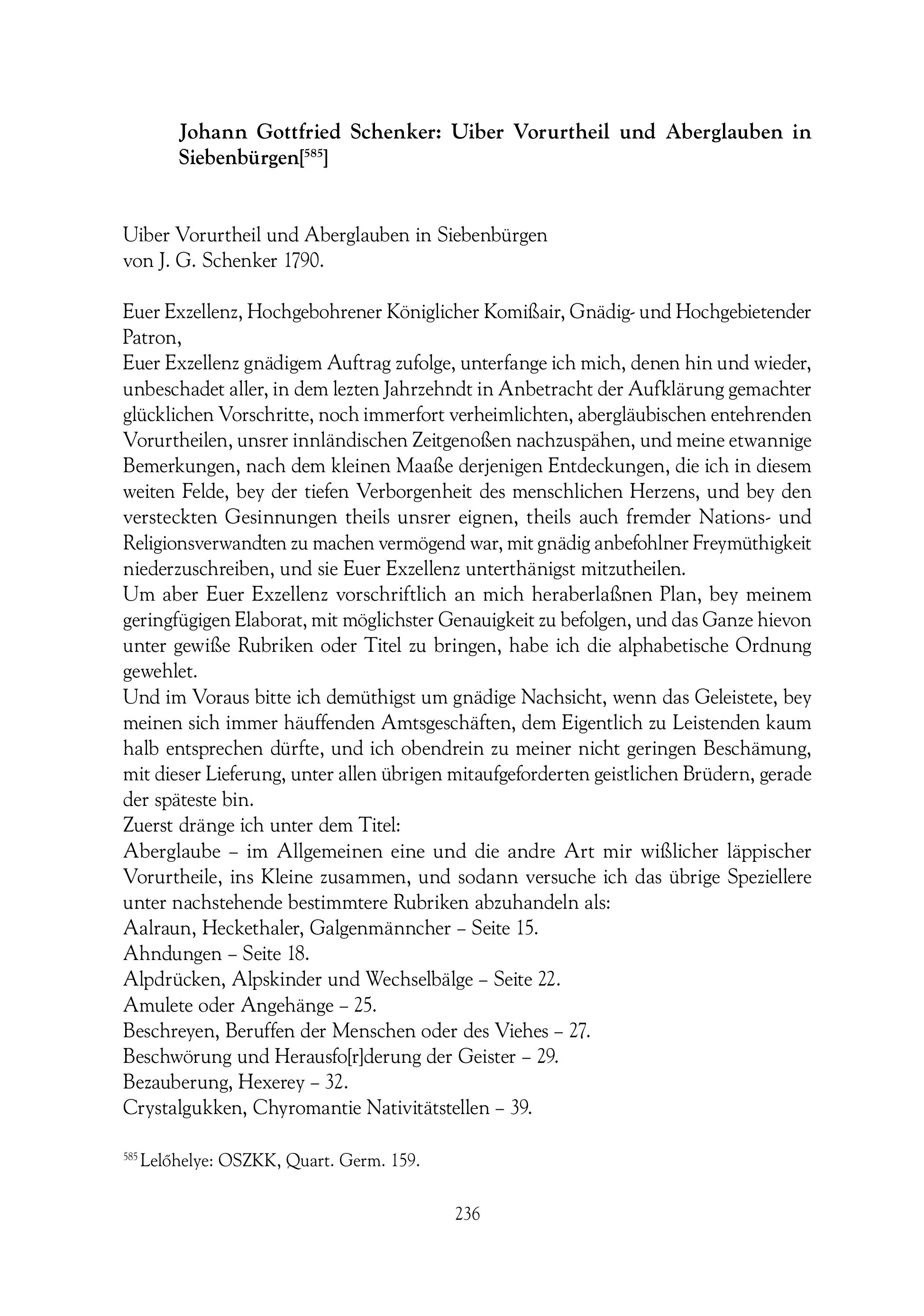 Johann Gottfried Schenker: Uiber Vorurtheil und Aberglauben in Siebenbiirgen[>*"] Uiber Vorurtheil und Aberglauben in Siebenbürgen von J. G. Schenker 1790. Euer Exzellenz, Hochgebohrener Königlicher Komißair, Gnädig- und Hochgebietender Patron, Euer Exzellenz gnädigem Auftrag zufolge, unterfange ich mich, denen hin und wieder, unbeschadet aller, in dem lezten Jahrzehndt in Anbetracht der Aufklärung gemachter glücklichen Vorschritte, noch immerfort verheimlichten, abergläubischen entehrenden Vorurtheilen, unsrer innländischen Zeitgenoßen nachzuspähen, und meine etwannige Bemerkungen, nach dem kleinen Maaße derjenigen Entdeckungen, die ich in diesem weiten Felde, bey der tiefen Verborgenheit des menschlichen Herzens, und bey den versteckten Gesinnungen theils unsrer eignen, theils auch fremder Nations- und Religionsverwandten zu machen vermögend war, mit gnädig anbefohlner Freymüthigkeit niederzuschreiben, und sie Euer Exzellenz unterthänigst mitzutheilen. Um aber Euer Exzellenz vorschriftlich an mich heraberlaßnen Plan, bey meinem geringfügigen Elaborat, mit möglichster Genauigkeit zu befolgen, und das Ganze hievon unter gewiße Rubriken oder Titel zu bringen, habe ich die alphabetische Ordnung gewehlet. Und im Voraus bitte ich demüthigst um gnädige Nachsicht, wenn das Geleistete, bey meinen sich immer häuffenden Amtsgeschäften, dem Eigentlich zu Leistenden kaum halb entsprechen dürfte, und ich obendrein zu meiner nicht geringen Beschämung, mit dieser Lieferung, unter allen übrigen mitaufgeforderten geistlichen Brüdern, gerade der späteste bin. Zuerst dränge ich unter dem Titel: Aberglaube - im Allgemeinen eine und die andre Art mir wißlicher läppischer Vorurtheile, ins Kleine zusammen, und sodann versuche ich das übrige Speziellere unter nachstehende bestimmtere Rubriken abzuhandeln als: Aalraun, Heckethaler, Galgenmänncher - Seite 15. Ahndungen - Seite 18. Alpdrücken, Alpskinder und Wechselbälge - Seite 22. Amulete oder Angehänge - 25. Beschreyen, Beruffen der Menschen oder des Viehes - 27. Beschwörung und Herausfo[r]derung der Geister - 29. Bezauberung, Hexerey - 32. Crystalgukken, Chyromantie Nativitätstellen - 39. 5 Lelöhelye: OSZKK, Quart. Germ. 159. 236