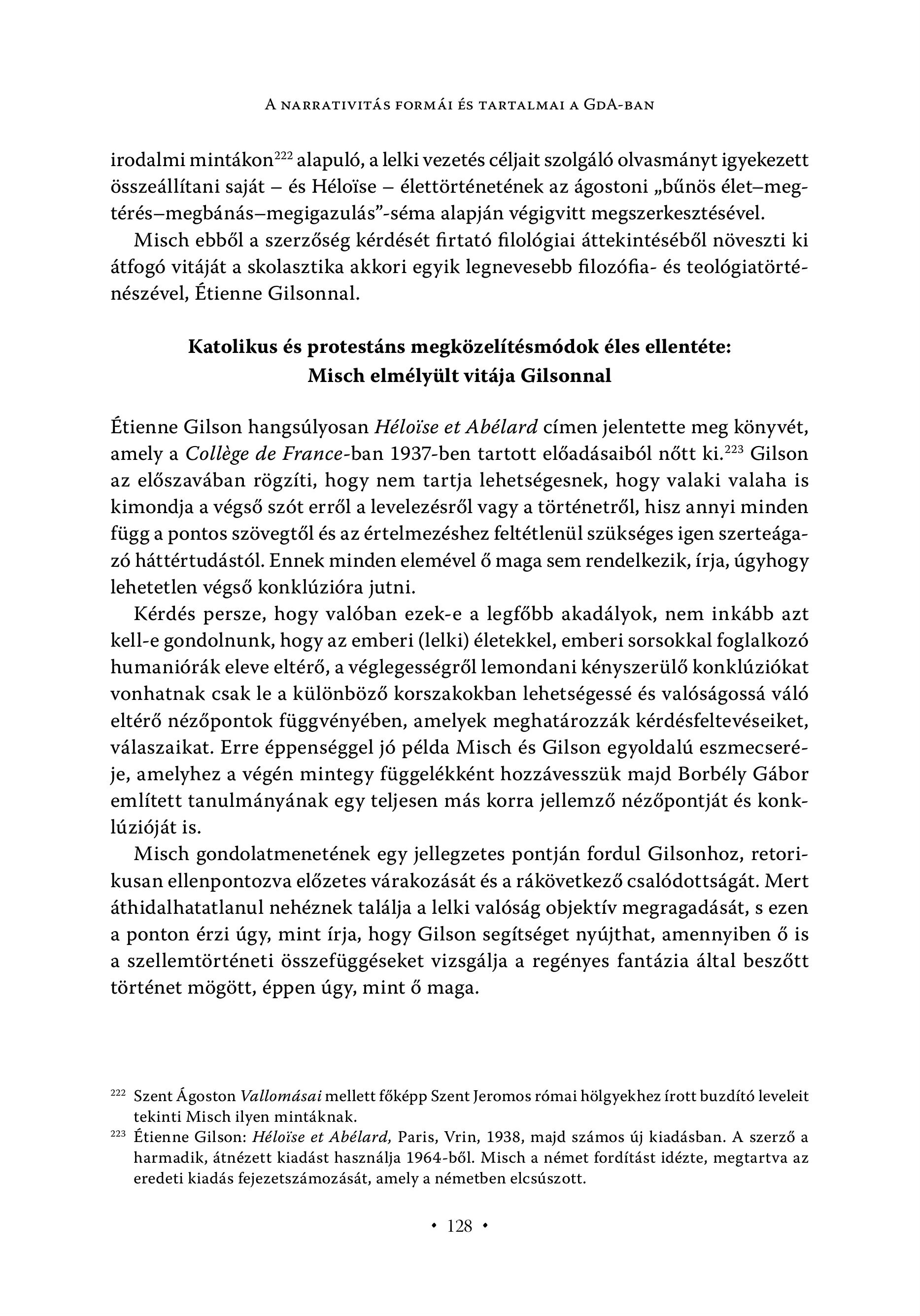 A NARRATIVITAS FORMAI ES TARTALMAI A GDA-BAN irodalmi mintákon?? alapuló, a lelki vezetés céljait szolgáló olvasmányt igyekezett összeállítani saját — és Héloise — élettörténetének az ágostoni , bűnös élet—-megtérés—megbanas—megigazulas”-séma alapjan végigvitt megszerkesztésével. Misch ebből a szerzőség kérdését firtató filológiai áttekintéséből növeszti ki átfogó vitáját a skolasztika akkori egyik legnevesebb filozófia- és teológiatörténészével, Étienne Gilsonnal. Katolikus és protestáns megközelítésmódok éles ellentéte: Misch elmélyült vitája Gilsonnal Etienne Gilson hangstilyosan Héloise et Abélard címen jelentette meg könyvét, amely a Collége de France-ban 1937-ben tartott előadásaiból nőtt ki.?? Gilson az előszavában rögzíti, hogy nem tartja lehetségesnek, hogy valaki valaha is kimondja a végső szót erről a levelezésről vagy a történetről, hisz annyi minden függ a pontos szövegtől és az értelmezéshez feltétlenül szükséges igen szerteágazó háttértudástól. Ennek minden elemével ő maga sem rendelkezik, írja, úgyhogy lehetetlen végső konklúzióra jutni. Kérdés persze, hogy valóban ezek-e a legfőbb akadályok, nem inkább azt kell-e gondolnunk, hogy az emberi (lelki) életekkel, emberi sorsokkal foglalkozó humaniórák eleve eltérő, a véglegességről lemondani kényszerülő konklúziókat vonhatnak csak le a különböző korszakokban lehetségessé és valóságossá váló eltérő nézőpontok függvényében, amelyek meghatározzák kérdésfeltevéseiket, válaszaikat. Erre éppenséggel jó példa Misch és Gilson egyoldalú eszmecseréje, amelyhez a végén mintegy függelékként hozzávesszük majd Borbély Gábor említett tanulmányának egy teljesen más korra jellemző nézőpontját és konklúzióját is. Misch gondolatmenetének egy jellegzetes pontján fordul Gilsonhoz, retorikusan ellenpontozva előzetes várakozását és a rákövetkező csalódottságát. Mert áthidalhatatlanul nehéznek találja a lelki valóság objektív megragadását, s ezen a ponton érzi úgy, mint írja, hogy Gilson segítséget nyújthat, amennyiben ő is a szellemtörténeti összefüggéseket vizsgálja a regényes fantázia által beszőtt történet mögött, éppen úgy, mint ő maga. 222 Szent Ágoston Vallomásai mellett főképp Szent Jeromos római hölgyekhez írott buzdító leveleit tekinti Misch ilyen mintáknak. 223 Etienne Gilson: Heloise et Abelard, Paris, Vrin, 1938, majd számos új kiadásban. A szerző a harmadik, átnézett kiadást használja 1964-ből. Misch a német fordítást idézte, megtartva az eredeti kiadás fejezetszámozását, amely a németben elcsúszott. e 128 +