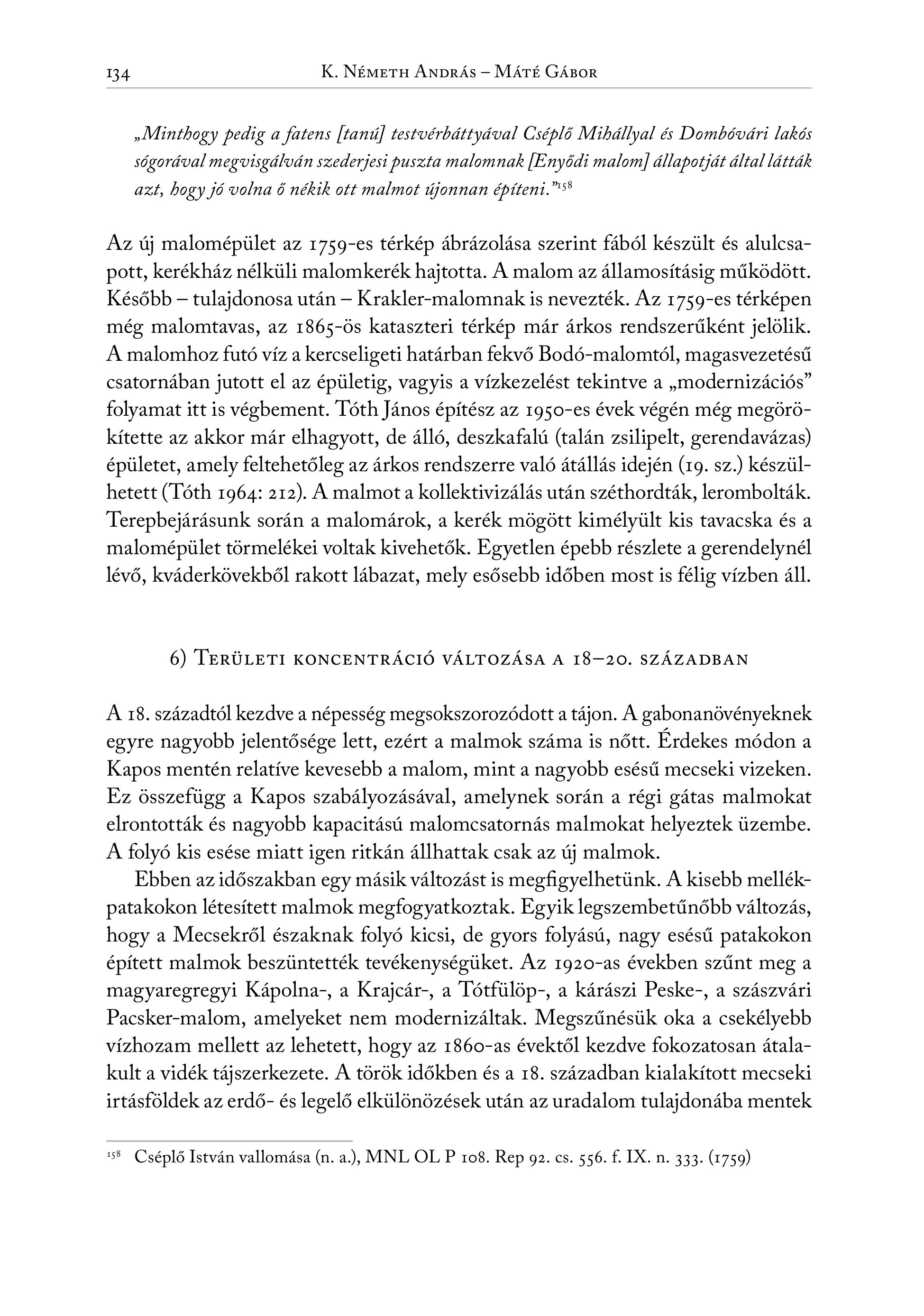 134 K. NÉMETH ANDRÁS — MÁTÉ GÁBOR , Minthogy bedig a fatens [tani] testverbättyaval Cséplő Mihállyal és Dombóvári lakós sógorával megvisgálván szederjesi puszta malomnak (Enyődi malom] állapotját által látták azt, hogy jó volna ő nékik ott malmot újonnan épiteni.”™5* Az üj malomepület az 1759-es térkép ábrázolása szerint fából készült és alulcsapott, kerékház nélküli malomkerék hajtotta. A malom az államosításig működött. Később - tulajdonosa után — Krakler-malomnak is nevezték. Az 1759-es térképen még malomtavas, az 1865-6s kataszteri térkép már árkos rendszerűként jelölik. A malomhoz futó víz a kercseligeti határban fekvő Bodó-malomtól, magasvezetésű csatornában jutott el az épületig, vagyis a vízkezelést tekintve a , modernizációs" folyamat itt is végbement. Toth Janos épitész az 1950-es évek végén még megörökítette az akkor már elhagyott, de álló, deszkafalú (talán zsilipelt, gerendavázas) épületet, amely feltehetőleg az árkos rendszerre való átállás idején (rg. sz.) készülhetett (Tóth 1964: 212). A malmot a kollektivizálás után széthordták, lerombolták. Terepbejárásunk során a malomárok, a kerék mögött kimélyült kis tavacska és a malomépület törmelékei voltak kivehetők. Egyetlen épebb részlete a gerendelynél lévő, kváderkövekből rakott lábazat, mely esősebb időben most is félig vízben áll. 6) TERÜLETI KONCENTRÁCIÓ VÁLTOZÁSA A 18—20. SZÁZADBAN A 18. szäzadtöl kezdve a nepesseg megsokszorozödott a täjon. A gabonanövenyeknek egyre nagyobb jelentősége lett, ezért a malmok száma is nőtt. Érdekes módon a Kapos mentén relatíve kevesebb a malom, mint a nagyobb esésű mecseki vizeken. Ez összefügg a Kapos szabályozásával, amelynek során a régi gátas malmokat elrontották és nagyobb kapacitású malomcsatornás malmokat helyeztek üzembe. A folyó kis esése miatt igen ritkán állhattak csak az új malmok. Ebben az időszakban egy másik változást is megfigyelhetünk. A kisebb mellékpatakokon létesített malmok megfogyatkoztak. Egyik legszembetűnőbb változás, hogy a Mecsekről északnak folyó kicsi, de gyors folyású, nagy esésű patakokon épített malmok beszüntették tevékenységüket. Az 1920-as években szűnt meg a magyaregregyi Kápolna-, a Krajcár-, a Tótfülöp-, a kárászi Peske-, a szászvári Pacsker-malom, amelyeket nem modernizáltak. Megszűnésük oka a csekélyebb vízhozam mellett az lehetett, hogy az 1860-as évektől kezdve fokozatosan átalakult a vidék tájszerkezete. A török időkben és a 18. században kialakított mecseki irtásföldek az erdő- és legelő elkülönözések után az uradalom tulajdonába mentek 15 Cséplő István vallomása (n. a.) MNL OL P 108. Rep 92. cs. 556. f. IX. n. 333. (1759)