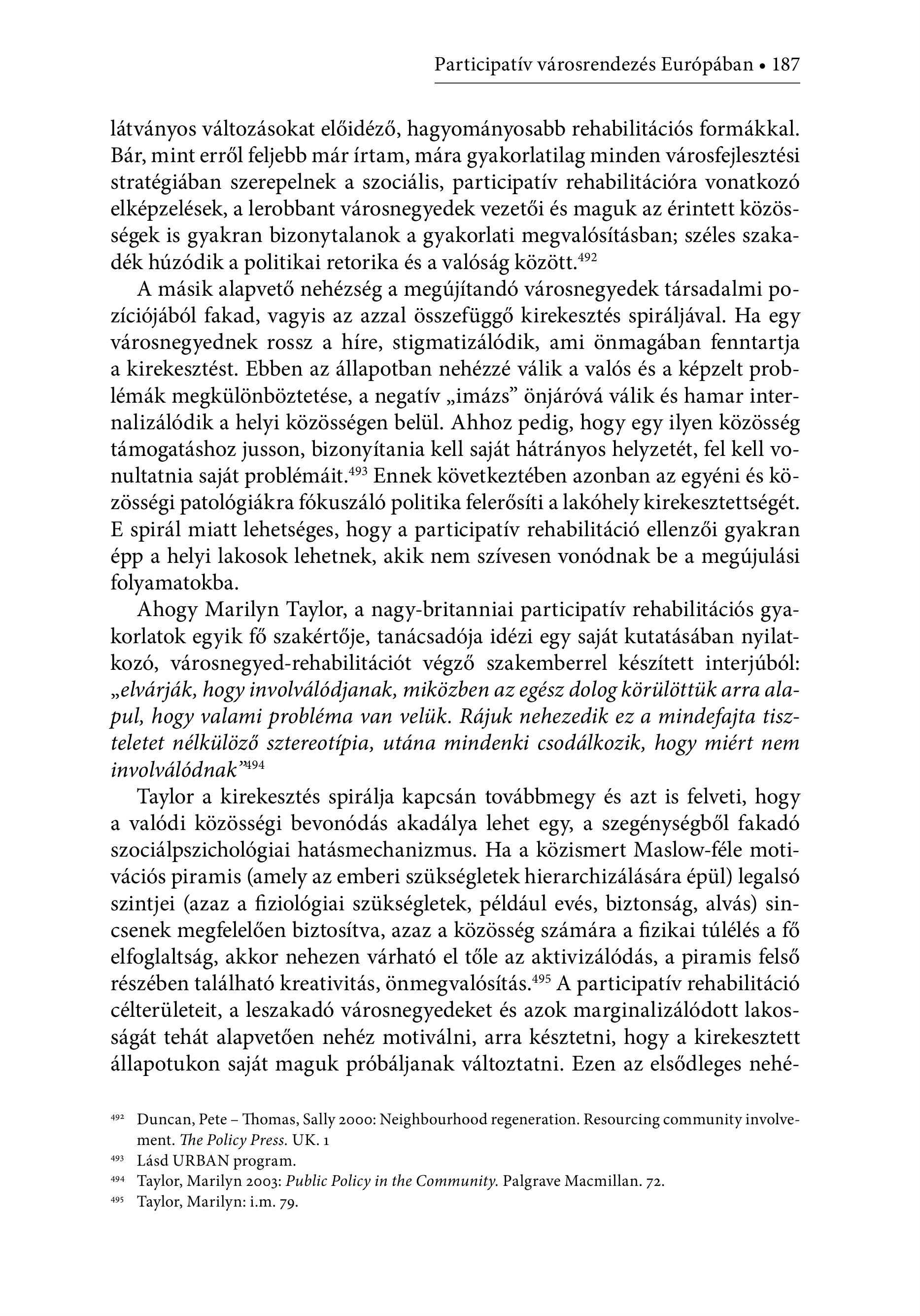 Participatív városrendezés Európában + 187 látványos változásokat előidéző, hagyományosabb rehabilitációs formákkal. Bár, mint erről feljebb már írtam, mára gyakorlatilag minden városfejlesztési stratégiában szerepelnek a szociális, participatív rehabilitációra vonatkozó elképzelések, a lerobbant városnegyedek vezetői és maguk az érintett közösségek is gyakran bizonytalanok a gyakorlati megvalósításban; széles szakadék húzódik a politikai retorika és a valóság között."? A másik alapvető nehézség a megújítandó városnegyedek társadalmi pozíciójából fakad, vagyis az azzal összefüggő kirekesztés spiráljával. Ha egy városnegyednek rossz a híre, stigmatizálódik, ami önmagában fenntartja a kirekesztést. Ebben az állapotban nehézzé válik a valós és a képzelt problémák megkülönböztetése, a negatív , imázs" önjáróvá válik és hamar internalizálódik a helyi közösségen belül. Ahhoz pedig, hogy egy ilyen közösség támogatáshoz jusson, bizonyítania kell saját hátrányos helyzetét, fel kell vonultatnia saját problémáit." Ennek következtében azonban az egyéni és közösségi patológiákra fókuszáló politika felerősíti a lakóhely kirekesztettségét. E spirál miatt lehetséges, hogy a participatív rehabilitáció ellenzői gyakran épp a helyi lakosok lehetnek, akik nem szívesen vonódnak be a megújulási folyamatokba. Ahogy Marilyn Taylor, a nagy-britanniai participatív rehabilitációs gyakorlatok egyik fő szakértője, tanácsadója idézi egy saját kutatásában nyilatkozó, városnegyed-rehabilitációt végző szakemberrel készített interjúból: s elvárják, hogy involválódjanak, miközben az egész dolog körülöttük arra alapul, hogy valami probléma van velük. Rájuk nehezedik ez a mindefajta tiszteletet nélkülöző sztereotípia, utána mindenki csodálkozik, hogy miért nem involvalödnak””* Taylor a kirekesztés spirälja kapcsán továbbmegy és azt is felveti, hogy a valódi közösségi bevonódás akadálya lehet egy, a szegénységből fakadó szociálpszichológiai hatásmechanizmus. Ha a közismert Maslow-féle motivációs piramis (amely az emberi szükségletek hierarchizálására épül) legalsó szintjei (azaz a fiziológiai szükségletek, például evés, biztonság, alvás) sincsenek megfelelően biztosítva, azaz a közösség számára a fizikai túlélés a fő elfoglaltság, akkor nehezen várható el tőle az aktivizálódás, a piramis felső részében található kreativitás, önmegvalósítás." A participatív rehabilitáció célterületeit, a leszakadó városnegyedeket és azok marginalizálódott lakosságát tehát alapvetően nehéz motiválni, arra késztetni, hogy a kirekesztett állapotukon saját maguk próbáljanak változtatni. Ezen az elsődleges nehé#2 Duncan, Pete - Thomas, Sally 2000: Neighbourhood regeneration. Resourcing community involvement. The Policy Press. UK.1 #3 Läsd URBAN program. 494 Taylor, Marilyn 2003: Public Policy in the Community. Palgrave Macmillan. 72. #5 Taylor, Marilyn: i.m. 79.