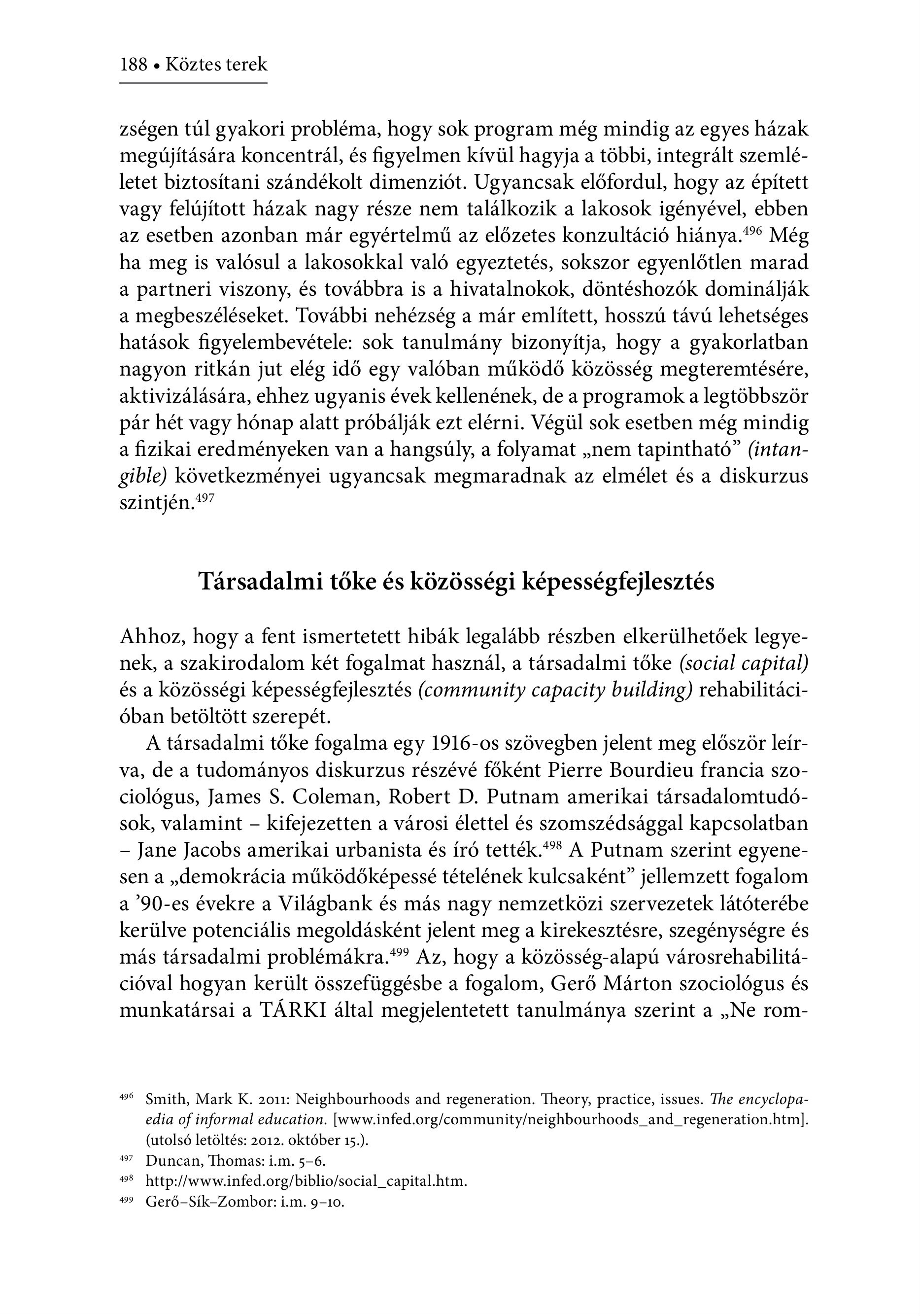 188 e Köztes terek zségen túl gyakori probléma, hogy sok program még mindig az egyes házak megújítására koncentrál, és figyelmen kívül hagyja a többi, integrált szemléletet biztosítani szándékolt dimenziót. Ugyancsak előfordul, hogy az épített vagy felújított házak nagy része nem találkozik a lakosok igényével, ebben az esetben azonban már egyértelmű az előzetes konzultáció hiánya."" Még ha meg is valósul a lakosokkal való egyeztetés, sokszor egyenlőtlen marad a partneri viszony, és továbbra is a hivatalnokok, döntéshozók dominálják a megbeszéléseket. További nehézség a már említett, hosszú távú lehetséges hatások figyelembevétele: sok tanulmány bizonyítja, hogy a gyakorlatban nagyon ritkán jut elég idő egy valóban működő közösség megteremtésére, pár hét vagy hónap alatt próbálják ezt elérni. Végül sok esetben még mindig a fizikai eredményeken van a hangsúly, a folyamat , nem tapintható? (intangible) következményei ugyancsak megmaradnak az elmélet és a diskurzus szintjén.*”” Társadalmi tőke és közösségi képességfejlesztés Ahhoz, hogy a fent ismertetett hibák legalább részben elkerülhetőek legyenek, a szakirodalom két fogalmat használ, a társadalmi tőke (social capital) és a közösségi képességfejlesztés (community capacity building) rehabilitációban betöltött szerepét. A társadalmi tőke fogalma egy 1916-os szövegben jelent meg először leírva, de a tudományos diskurzus részévé főként Pierre Bourdieu francia szociológus, James S. Coleman, Robert D. Putnam amerikai társadalomtudósok, valamint - kifejezetten a városi élettel és szomszédsággal kapcsolatban - Jane Jacobs amerikai urbanista és író tették." A Putnam szerint egyenesen a , emokrácia működőképessé tételének kulcsaként” jellemzett fogalom a 90-es évekre a Világbank és más nagy nemzetközi szervezetek látóterébe kerülve potenciális megoldásként jelent meg a kirekesztésre, szegénységre és más társadalmi problémákra."" Az, hogy a közösség-alapú városrehabilitációval hogyan került összefüggésbe a fogalom, Gerő Márton szociológus és munkatársai a TÁRKI által megjelentetett tanulmánya szerint a , Ne rom#6 Smith, Mark K. 2011: Neighbourhoods and regeneration. Theory, practice, issues. The encyclopaedia of informal education. [www.infed.org/community/neighbourhoods_and_regeneration.htm]. (utolsó letöltés: 2012. október 15.). #7 Duncan, Thomas: i.m. 5-6. #8 http://www.infed.org/biblio/social_capital.htm. #9 Gerö-Sik-Zombor: i.m. 9-10.