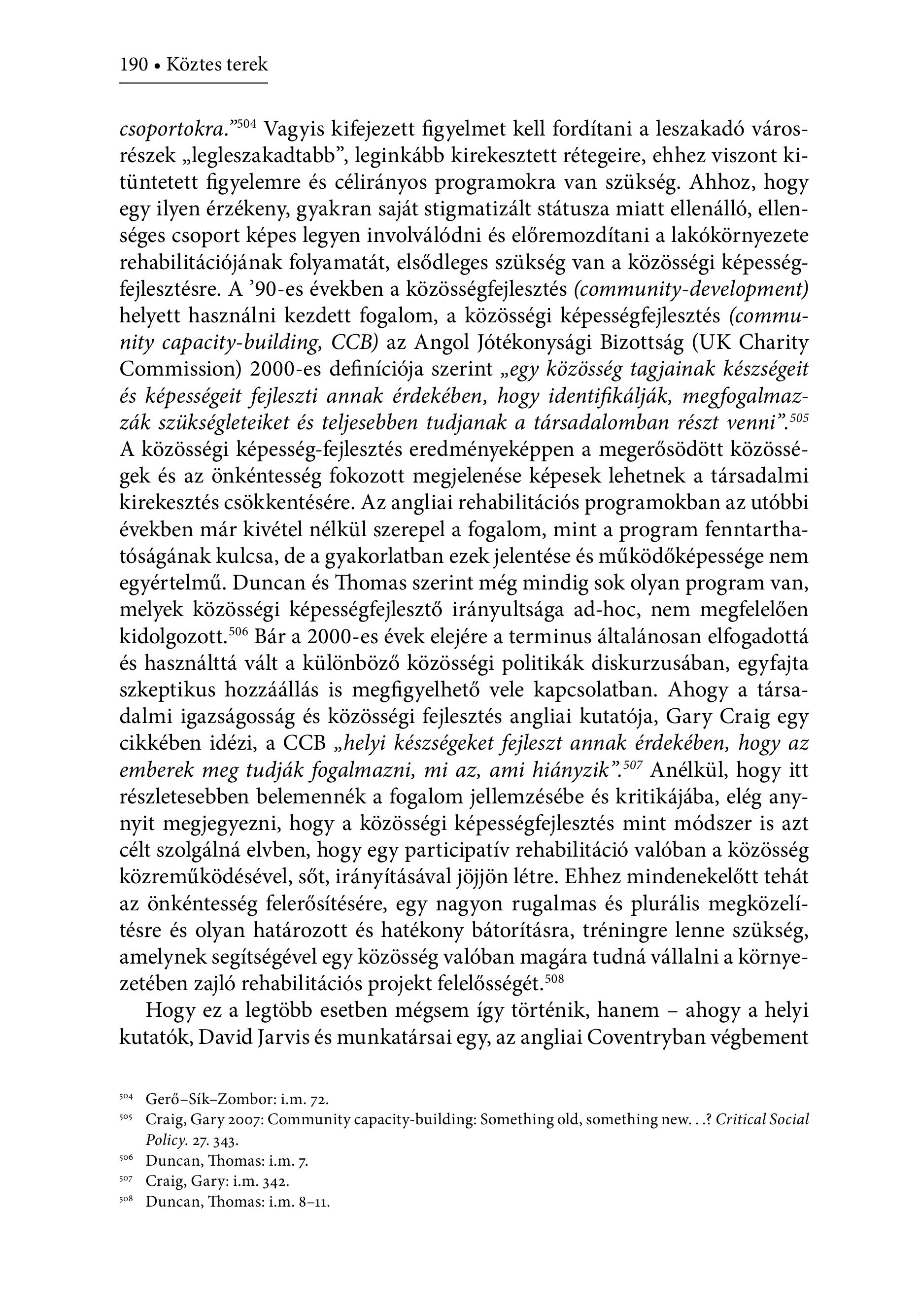 190 e Köztes terek csoportokra.""" Vagyis kifejezett figyelmet kell fordítani a leszakadó városrészek , legleszakadtabb", leginkább kirekesztett rétegeire, ehhez viszont kitüntetett figyelemre és célirányos programokra van szükség. Ahhoz, hogy egy ilyen érzékeny, gyakran saját stigmatizált státusza miatt ellenálló, ellenséges csoport képes legyen involválódni és előremozdítani a lakókörnyezete rehabilitációjának folyamatát, elsődleges szükség van a közösségi képességfejlesztésre. A 90-es években a közösségfejlesztés (community-development) helyett használni kezdett fogalom, a közösségi képességfejlesztés (community capacity-building, CCB) az Angol Jótékonysági Bizottság (UK Charity Commission) 2000-es definíciója szerint , egy közösség tagjainak készségeit és képességeit fejleszti annak érdekében, hogy identifikálják, megfogalmazzák szükségleteiket és teljesebben tudjanak a társadalomban részt venni?" A közösségi képesség-fejlesztés eredményeképpen a megerősödött közösségek és az önkéntesség fokozott megjelenése képesek lehetnek a társadalmi kirekesztés csökkentésére. Az angliai rehabilitációs programokban az utóbbi években már kivétel nélkül szerepel a fogalom, mint a program fenntarthatóságának kulcsa, de a gyakorlatban ezek jelentése és működőképessége nem egyértelmű. Duncan és Ihomas szerint még mindig sok olyan program van, melyek közösségi képességfejlesztő irányultsága ad-hoc, nem megfelelően kidolgozott." Bár a 2000-es évek elejére a terminus általánosan elfogadottá és használttá vált a különböző közösségi politikák diskurzusában, egyfajta szkeptikus hozzáállás is megfigyelhető vele kapcsolatban. Ahogy a társadalmi igazságosság és közösségi fejlesztés angliai kutatója, Gary Craig egy cikkében idézi, a CCB , helyi készségeket fejleszt annak érdekében, hogy az emberek meg tudják fogalmazni, mi az, ami hiányzik"."" Anélkül, hogy itt részletesebben belemennék a fogalom jellemzésébe és kritikájába, elég anynyit megjegyezni, hogy a közösségi képességfejlesztés mint módszer is azt célt szolgálná elvben, hogy egy participatív rehabilitáció valóban a közösség közreműködésével, sőt, irányításával jöjjön létre. Ehhez mindenekelőtt tehát az önkéntesség felerősítésére, egy nagyon rugalmas és plurális megközelítésre és olyan határozott és hatékony bátorításra, tréningre lenne szükség, amelynek segítségével egy közösség valóban magára tudná vállalni a környezetében zajló rehabilitációs projekt felelősségét." Hogy ez a legtöbb esetben mégsem így történik, hanem - ahogy a helyi kutatók, David Jarvis és munkatársai egy, az angliai Coventryban végbement 5% Ger6-Sik-Zombor: i.m. 72. 505 Craig, Gary 2007: Community capacity-building: Something old, something new. . .? Critical Social Policy. 27. 343. 5% Duncan, Thomas: i.m. 7. 57 Craig, Gary: i.m. 342. 58 Duncan, Ihomas: i.m. 8-11.