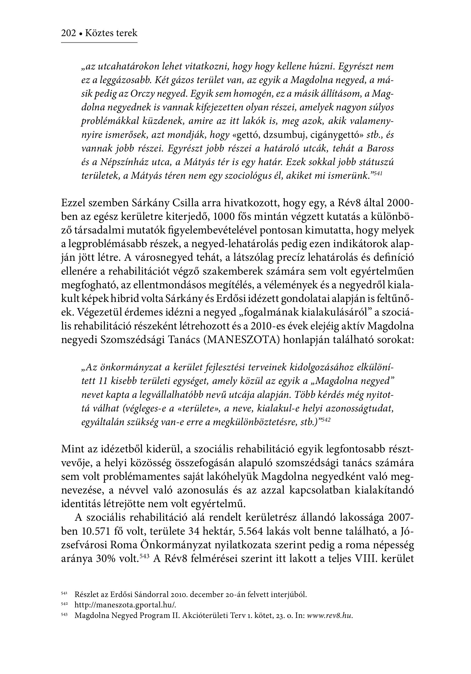 202 e Köztes terek , az utcahatárokon lehet vitatkozni, hogy hogy kellene húzni. Egyrészt nem ez a leggázosabb. Két gázos terület van, az egyik a Magdolna negyed, a másik pedig az Orczy negyed. Egyik sem homogén, ez a másik állításom, a Magdolna negyednek is vannak kifejezetten olyan részei, amelyek nagyon súlyos problémákkal küzdenek, amire az itt lakók is, meg azok, akik valamenynyire ismerősek, azt mondjdk, hogy «gettd, dzsumbuj, ciganygettd» stb., és vannak jobb részei. Egyrészt jobb részei a határoló utcák, tehát a Baross és a Népszínház utca, a Mátyás tér is egy határ. Ezek sokkal jobb státuszú területek, a Mátyás téren nem egy szociológus él, akiket mi ismerünk." Ezzel szemben Sárkány Csilla arra hivatkozott, hogy egy, a Rév8 által 2000ben az egész kerületre kiterjedő, 1000 fős mintán végzett kutatás a különböző társadalmi mutatók figyelembevételével pontosan kimutatta, hogy melyek a legproblémásabb részek, a negyed-lehatárolás pedig ezen indikátorok alapján jött létre. A városnegyed tehát, a látszólag precíz lehatárolás és definíció ellenére a rehabilitációt végző szakemberek számára sem volt egyértelműen megfogható, az ellentmondásos megítélés, a vélemények és a negyedről kialakult képek hibrid volta Sárkány és Erdősi idézett gondolatai alapján is feltűnőek. Végezetül érdemes idézni a negyed , fogalmának kialakulásáról? a szociális rehabilitáció részeként létrehozott és a 2010-es évek elejéig aktív Magdolna negyedi Szomszédsági Tanács (MANESZOTA,) honlapján található sorokat: , Az önkormányzat a kerület fejlesztési terveinek kidolgozásához elkülöníitett 11 kisebb területi egységet, amely közül az egyik a , Magdolna negyed" nevet kapta a legvállalhatóbb nevű utcája alapján. Több kérdés még nyitotta valhat (végleges-e a «teriilete», a neve, kialakul-e helyi azonossdgtudat, egyáltalán szükség van-e erre a megkülönböztetésre, stb.) "? Mint az idézetből kiderül, a szociális rehabilitáció egyik legfontosabb résztvevője, a helyi közösség összefogásán alapuló szomszédsági tanács számára sem volt problémamentes saját lakóhelyük Magdolna negyedként való megnevezése, a névvel való azonosulás és az azzal kapcsolatban kialakítandó identitás létrejötte nem volt egyértelmű. A szociális rehabilitáció alá rendelt kerületrész állandó lakossága 2007ben 10.571 fő volt, területe 34 hektár, 5.564 lakás volt benne található, a Józsefvárosi Roma Önkormányzat nyilatkozata szerint pedig a roma népesség aránya 3096 volt."9 A Rév8 felmérései szerint itt lakott a teljes VIII. kerület 5" Részlet az Erdősi Sándorral 2010. december 20-án felvett interjúból. 5 http://maneszota.gportal.hu/. 583 Magdolna Negyed Program II. Akcidteriileti Terv 1. kötet, 23. 0. In: www.revs.hu.