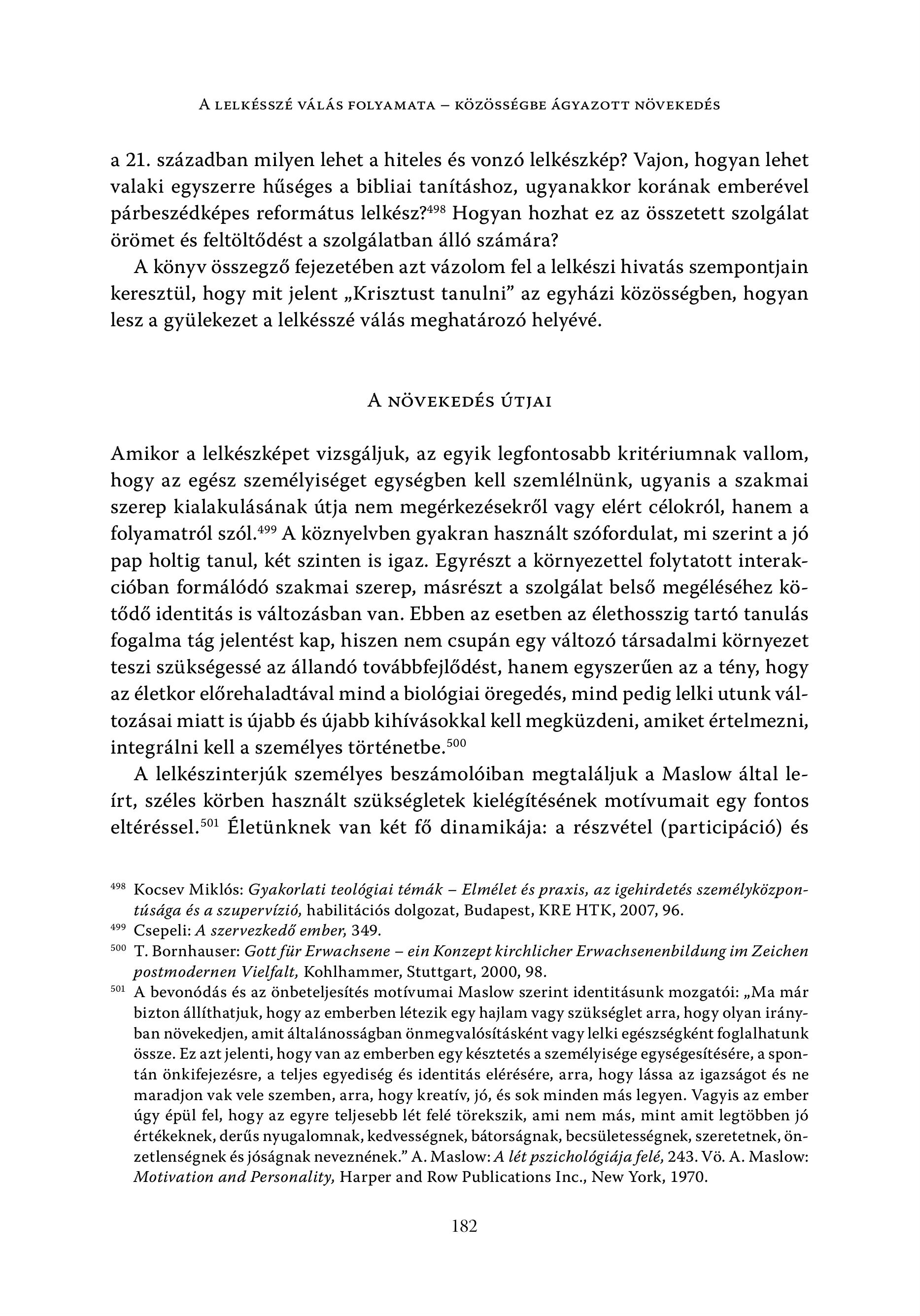 A LELKÉSSZÉ VÁLÁS FOLYAMATA — KÖZÖSSÉGBE ÁGYAZOTT NÖVEKEDÉS a 21. században milyen lehet a hiteles és vonzó lelkészkép? Vajon, hogyan lehet valaki egyszerre hűséges a bibliai tanításhoz, ugyanakkor korának emberével párbeszédképes református lelkész?" Hogyan hozhat ez az összetett szolgálat örömet és feltöltődést a szolgálatban álló számára? A könyv összegző fejezetében azt vázolom fel a lelkészi hivatás szempontjain keresztül, hogy mit jelent , Krisztust tanulni" az egyházi közösségben, hogyan lesz a gyülekezet a lelkésszé válás meghatározó helyévé. A NÖVEKEDÉS ÚTJAI Amikor a lelkészképet vizsgáljuk, az egyik legfontosabb kritériumnak vallom, hogy az egész személyiséget egységben kell szemlélnünk, ugyanis a szakmai szerep kialakulásának útja nem megérkezésekről vagy elért célokról, hanem a folyamatról szól."?" A köznyelvben gyakran használt szófordulat, mi szerint a jó pap holtig tanul, két szinten is igaz. Egyrészt a környezettel folytatott interakcióban formálódó szakmai szerep, másrészt a szolgálat belső megéléséhez kötődő identitás is változásban van. Ebben az esetben az élethosszig tartó tanulás fogalma tág jelentést kap, hiszen nem csupán egy változó társadalmi környezet teszi szükségessé az állandó továbbfejlődést, hanem egyszerűen az a tény, hogy az életkor előrehaladtával mind a biológiai öregedés, mind pedig lelki utunk változásai miatt is újabb és újabb kihívásokkal kell megküzdeni, amiket értelmezni, integrálni kell a személyes történetbe." A lelkészinterjúk személyes beszámolóiban megtaláljuk a Maslow által leírt, széles körben használt szükségletek kielégítésének motívumait egy fontos eltéréssel." Életünknek van két fő dinamikája: a részvétel (participáció) és 198 Kocsev Miklós: Gyakorlati teológiai témák - Elmélet és praxis, az igehirdetés személyközpontúsága és a szupervízió, habilitációs dolgozat, Budapest, KRE HTK, 2007, 96. Csepeli: A szervezkedő ember, 349. 500 T. Bornhauser: Gott für Erwachsene - ein Konzept kirchlicher Erwachsenenbildung im Zeichen postmodernen Vielfalt, Kohlhammer, Stuttgart, 2000, 98. 501 A bevonódás és az önbeteljesítés motívumai Maslow szerint identitásunk mozgatói: , Ma már bizton állíthatjuk, hogy az emberben létezik egy hajlam vagy szükséglet arra, hogy olyan irányban növekedjen, amit általánosságban önmegvalósításként vagy lelki egészségként foglalhatunk össze. Ez azt jelenti, hogy van az emberben egy késztetés a személyisége egységesítésére, a spon499 tán önkifejezésre, a teljes egyediség és identitás elérésére, arra, hogy lássa az igazságot és ne maradjon vak vele szemben, arra, hogy kreatív, jó, és sok minden más legyen. Vagyis az ember úgy épül fel, hogy az egyre teljesebb lét felé törekszik, ami nem más, mint amit legtöbben jó értékeknek, derűs nyugalomnak, kedvességnek, bátorságnak, becsületességnek, szeretetnek, önzetlenségnek és jóságnak neveznének." A. Maslow: A lét pszichológiája felé, 243. Vö. A. Maslow: Motivation and Personality, Harper and Row Publications Inc., New York, 1970. 182