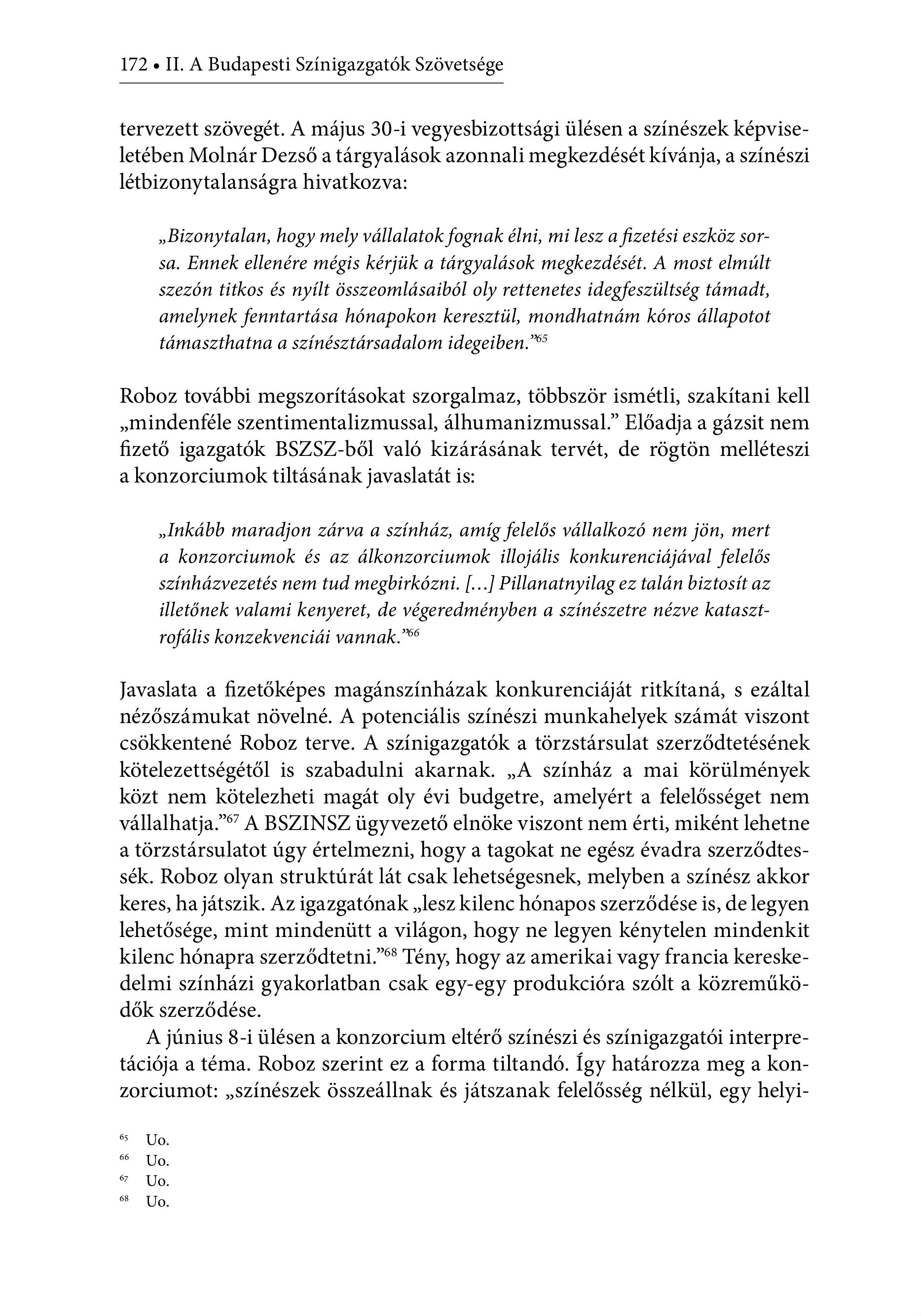 172 s II. A Budapesti Színigazgatók Szövetsége tervezett szövegét. A május 30-i vegyesbizottsági ülésen a színészek képviseletében Molnár Dezső a tárgyalások azonnali megkezdését kívánja, a színészi létbizonytalanságra hivatkozva: , Bizonytalan, hogy mely vállalatok fognak élni, mi lesz a fizetési eszköz sorsa. Ennek ellenére mégis kérjük a tárgyalások megkezdését. A most elmúlt szezón titkos és nyílt összeomlásaiból oly rettenetes idegfeszültség támadt, amelynek fenntartása hónapokon keresztül, mondhatnám kóros állapotot tamaszthatna a szinésztdrsadalom idegeiben.”” Roboz további megszorításokat szorgalmaz, többször ismétli, szakítani kell , mindenféle szentimentalizmussal, álhumanizmussal." Előadja a gázsit nem fizető igazgatók BSZSZ-ből való kizárásának tervét, de rögtön melléteszi a konzorciumok tiltásának javaslatát is: , Inkább maradjon zárva a színház, amíg felelős vállalkozó nem jön, mert a konzorciumok és az álkonzorciumok illojális konkurenciájával felelős színházvezetés nem tud megbirkózni. [...] Pillanatnyilag ez talán biztosít az illetőnek valami kenyeret, de végeredményben a színészetre nézve katasztrofális konzekvenciái vannak."§ Javaslata a fizetőképes magánszínházak konkurenciáját ritkítaná, s ezáltal nézőszámukat növelné. A potenciális színészi munkahelyek számát viszont csökkentené Roboz terve. A színigazgatók a törzstársulat szerződtetésének kötelezettségétől is szabadulni akarnak. , A színház a mai körülmények közt nem kötelezheti magát oly évi budgetre, amelyért a felelősséget nem vállalhatja." A BSZINSZ ügyvezető elnöke viszont nem érti, miként lehetne a törzstársulatot úgy értelmezni, hogy a tagokat ne egész évadra szerződtessék. Roboz olyan struktúrát lát csak lehetségesnek, melyben a színész akkor keres, ha játszik. Az igazgatónak , lesz kilenc hónapos szerződése is, de legyen lehetősége, mint mindenütt a világon, hogy ne legyen kénytelen mindenkit kilenc hónapra szerződtetni." Tény, hogy az amerikai vagy francia kereskedelmi színházi gyakorlatban csak egy-egy produkcióra szólt a közreműködők szerződése. A június 8-i ülésen a konzorcium eltérő színészi és színigazgatói interpretációja a téma. Roboz szerint ez a forma tiltandó. Így határozza meg a konzorciumot: , színészek összeállnak és játszanak felelősség nélkül, egy helyi65 Uo. 5 Uo. 4 Uo. 8 Uo.