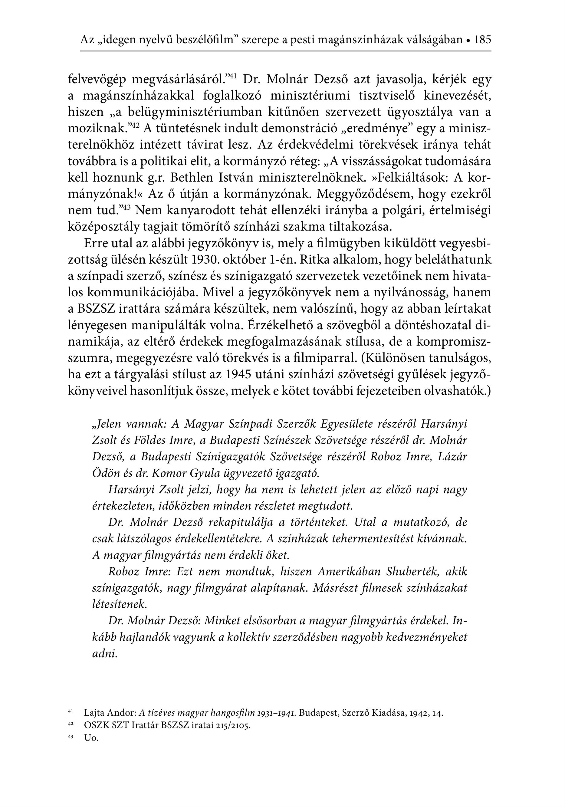 Az , idegen nyelvű beszélőfilm" szerepe a pesti magánszínházak válságában e 185 felvevőgép megvásárlásáról."" Dr. Molnár Dezső azt javasolja, kérjék egy a magánszínházakkal foglalkozó minisztériumi tisztviselő kinevezését, hiszen ,a belügyminisztériumban kitűnően szervezett ügyosztálya van a moziknak." A tüntetésnek indult demonstráció , eredménye" egy a miniszterelnökhöz intézett távirat lesz. Az érdekvédelmi törekvések iránya tehát továbbra is a politikai elit, akormányzó réteg: , A visszásságokat tudomására kell hoznunk g.r. Bethlen Istvan miniszterelndknek. »Felkialtasok: A kormanyzonak!« Az ő útján a kormányzónak. Meggyőződésem, hogy ezekről nem tud." Nem kanyarodott tehát ellenzéki irányba a polgári, értelmiségi középosztály tagjait tömörítő színházi szakma tiltakozása. Erre utal az alábbi jegyzőkönyv is, mely a filmügyben kiküldött vegyesbizottság ülésén készült 1930. október 1-én. Ritka alkalom, hogy beleláthatunk a színpadi szerző, színész és színigazgató szervezetek vezetőinek nem hivataa BSZSZ irattára számára készültek, nem valószínű, hogy az abban leírtakat lényegesen manipulálták volna. Érzékelhető a szövegből a döntéshozatal dinamikája, az eltérő érdekek megfogalmazásának stílusa, de a kompromiszszumra, megegyezésre való törekvés is a filmiparral. (Különösen tanulságos, ha ezt a tárgyalási stílust az 1945 utáni színházi szövetségi gyűlések jegyzőkönyveivel hasonlítjuk össze, melyek e kötet további fejezeteiben olvashatók.) ,Jelen vannak: A Magyar Színpadi Szerzők Egyesülete részéről Harsányi Zsolt és Földes Imre, a Budapesti Színészek Szövetsége részéről dr. Molnár Dezső, a Budapesti Színigazgatók Szövetsége részéről Roboz Imre, Lázár Ödön és dr. Komor Gyula ügyvezető igazgató. Harsányi Zsolt jelzi, hogy ha nem is lehetett jelen az előző napi nagy értekezleten, időközben minden részletet megtudott. Dr. Molnár Dezső rekapitulálja a történteket. Utal a mutatkozó, de csak látszólagos érdekellentétekre. A színházak tehermentesítést kívánnak. A magyar filmgyártás nem érdekli őket. Roboz Imre: Ezt nem mondtuk, hiszen Amerikában Shuberték, akik színigazgatók, nagy filmgyárat alapítanak. Másrészt filmesek színházakat létesítenek. Dr. Molnár Dezső: Minket elsősorban a magyar filmgyártás érdekel. Inkább hajlandók vagyunk a kollektív szerződésben nagyobb kedvezményeket adni. * Lajta Andor: A tizéves magyar hangosfilm 1931-1941. Budapest, Szerző Kiadäsa, 1942, 14. a OSZKSZT lrattár BSZSZ iratai 215/2105. #8 Uo.