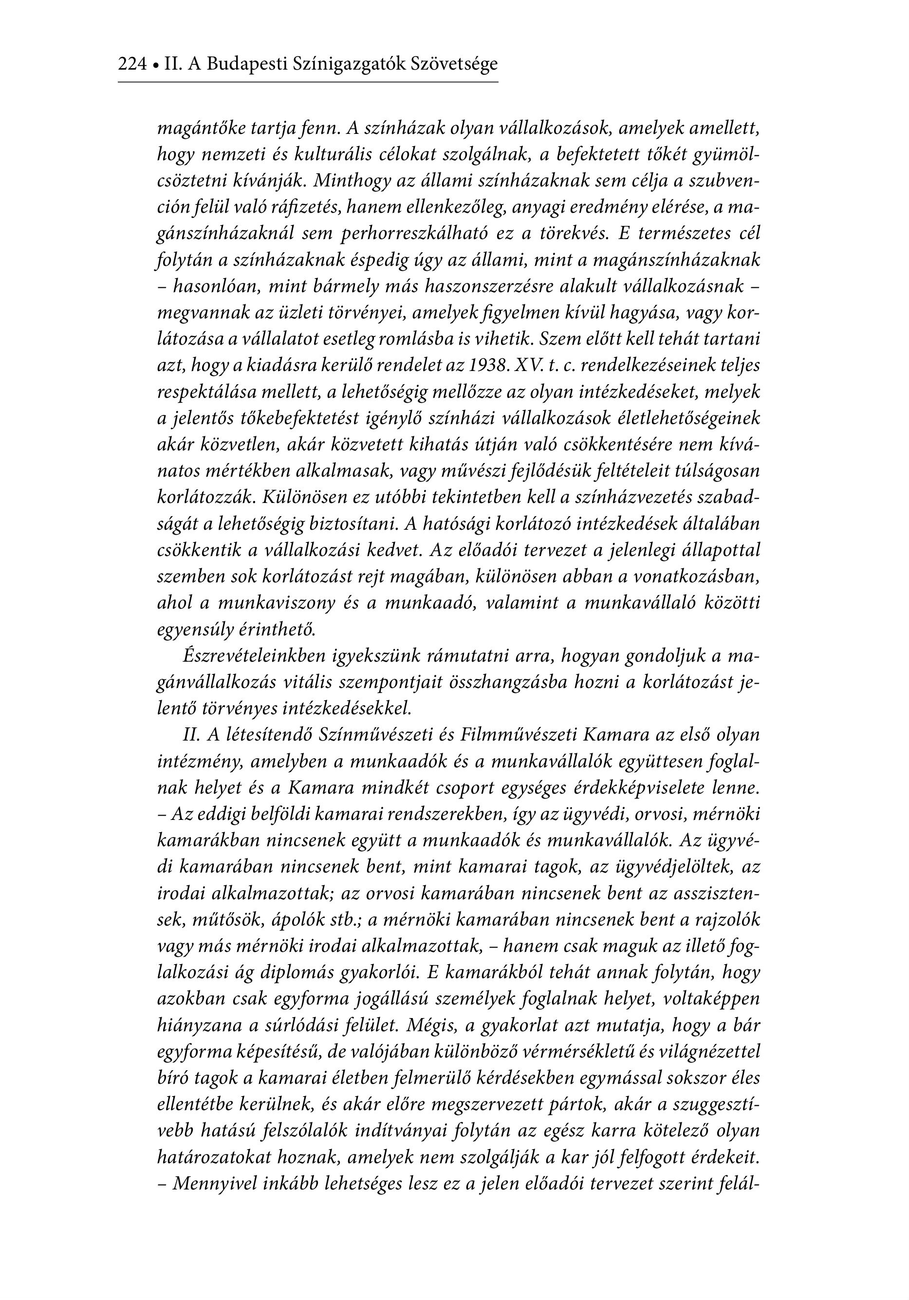224 s II. A Budapesti Színigazgatók Szövetsége magántőke tartja fenn. A színházak olyan vállalkozások, amelyek amellett, hogy nemzeti és kulturális célokat szolgálnak, a befektetett tőkét gyümölcsöztetni kívánják. Minthogy az állami színházaknak sem célja a szubvención felül való ráfizetés, hanem ellenkezőleg, anyagi eredmény elérése, a magánszínházaknál sem perhorreszkálható ez a törekvés. E természetes cél folytán a színházaknak éspedig úgy az állami, mint a magánszínházaknak - hasonlóan, mint bármely más haszonszerzésre alakult vállalkozásnak megvannak az üzleti törvényei, amelyek figyelmen kívül hagyása, vagy korlátozása a vállalatot esetleg romlásba is vihetik. Szem előtt kell tehát tartani azt, hogy a kiadásra kerülő rendelet az 1938. XV. t. c. rendelkezéseinek teljes respektálása mellett, a lehetőségig mellőzze az olyan intézkedéseket, melyek a jelentős tőkebefektetést igénylő színházi vállalkozások életlehetőségeinek akár közvetlen, akár közvetett kihatás útján való csökkentésére nem kívánatos mértékben alkalmasak, vagy művészi fejlődésük feltételeit túlságosan korlátozzák. Különösen ez utóbbi tekintetben kell a színházvezetés szabadságát a lehetőségig biztosítani. A hatósági korlátozó intézkedések általában csökkentik a vállalkozási kedvet. Az előadói tervezet a jelenlegi állapottal szemben sok korlátozást rejt magában, különösen abban a vonatkozásban, ahol a munkaviszony és a munkaadó, valamint a munkavállaló közötti egyensúly érinthető. Észrevételeinkben igyekszünk rámutatni arra, hogyan gondoljuk a magánvállalkozás vitális szempontjait összhangzásba hozni a korlátozást jelentő törvényes intézkedésekkel. II. A létesítendő Színművészeti és Filmművészeti Kamara az első olyan intézmény, amelyben a munkaadók és a munkavállalók együttesen foglalnak helyet és a Kamara mindkét csoport egységes érdekképviselete lenne. - Az eddigi belföldi kamarai rendszerekben, így az ügyvédi, orvosi, mérnöki kamarákban nincsenek együtt a munkaadók és munkavállalók. Az ügyvédi kamarában nincsenek bent, mint kamarai tagok, az ügyvédjelöltek, az irodai alkalmazottak; az orvosi kamarában nincsenek bent az asszisztensek, műtősök, ápolók stb.; a mérnöki kamarában nincsenek bent a rajzolók vagy más mérnöki irodai alkalmazottak, - hanem csak maguk az illető foglalkozási ág diplomás gyakorlói. E kamarákból tehát annak folytán, hogy azokban csak egyforma jogállású személyek foglalnak helyet, voltaképpen hiányzana a súrlódási felület. Mégis, a gyakorlat azt mutatja, hogy a bár egyforma képesítésű, de valójában különböző vérmérsékletű és világnézettel bíró tagok a kamarai életben felmerülő kérdésekben egymással sokszor éles ellentétbe kerülnek, és akár előre megszervezett pártok, akár a szuggesztívebb hatású felszólalók indítványai folytán az egész karra kötelező olyan határozatokat hoznak, amelyek nem szolgálják a kar jól felfogott érdekeit. - Mennyivel inkább lehetséges lesz ez a jelen előadói tervezet szerint felál