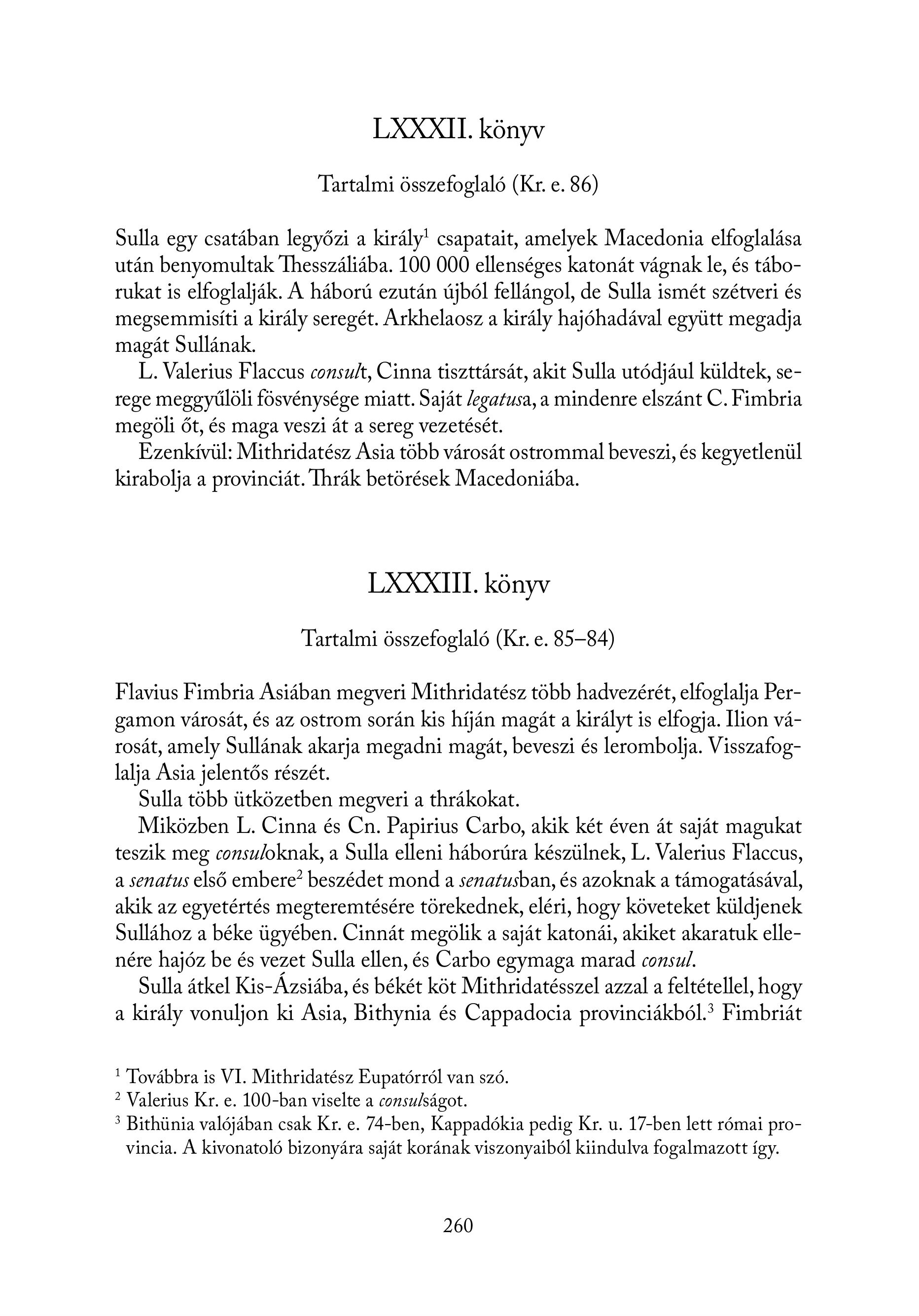 LXXXII. könyv Tartalmi összefoglaló (Kr. e. 86) Sulla egy csatában legyőzi a király" csapatait, amelyek Macedonia elfoglalása után benyomultak Ihesszáliába. 100 000 ellenséges katonát vágnak le, és táborukat is elfoglalják. A háború ezután újból fellángol, de Sulla ismét szétveri és megsemmisíti a király seregét. Arkhelaosz a király hajóhadával együtt megadja magát Sullának. L. Valerius Flaccus consult, Cinna tiszttársát, akit Sulla utódjául küldtek, serege meggyűlöli fösvénysége miatt. Saját /egafusa, a mindenre elszánt C. Fimbria megöli őt, és maga veszi át a sereg vezetését. Ezenkívül: Mithridatész Asia több városát ostrommal beveszi, és kegyetlenül kirabolja a provinciát. Ihrák betörések Macedoniába. LXXXIII. könyv Tartalmi összefoglaló (Kr. e. 8584) Flavius Fimbria Asiában megveri Mithridatész több hadvezérét, elfoglalja Pergamon városát, és az ostrom során kis híján magát a királyt is elfogja. Ilion varosát, amely Sullának akarja megadni magát, beveszi és lerombolja. Visszafoglalja Asia jelentős részét. Sulla több ütközetben megveri a thrákokat. Miközben L. Cinna és Cn. Papirius Carbo, akik két éven át saját magukat teszik meg consuloknak, a Sulla elleni háborúra készülnek, L. Valerius Flaccus, a senatus első embere? beszédet mond a senazusban, és azoknak a támogatásával, akik az egyetértés megteremtésére törekednek, eléri, hogy követeket küldjenek Sullához a béke ügyében. Cinnát megölik a saját katonái, akiket akaratuk ellenére hajóz be és vezet Sulla ellen, és Carbo egymaga marad consul. Sulla átkel Kis-Ázsiába, és békét köt Mithridatésszel azzal a feltétellel, hogy a király vonuljon ki Asia, Bithynia és Cappadocia provinciákból.? Fimbriát ! Továbbra is VI. Mithridatész Eupatórról van szó. * Valerius Kr. e. 100-ban viselte a consulsagot. 3 Bithünia valójában csak Kr. e. 74-ben, Kappadókia pedig Kr. u. 17-ben lett római provincia. A kivonatoló bizonyára saját korának viszonyaiból kiindulva fogalmazott így. 260