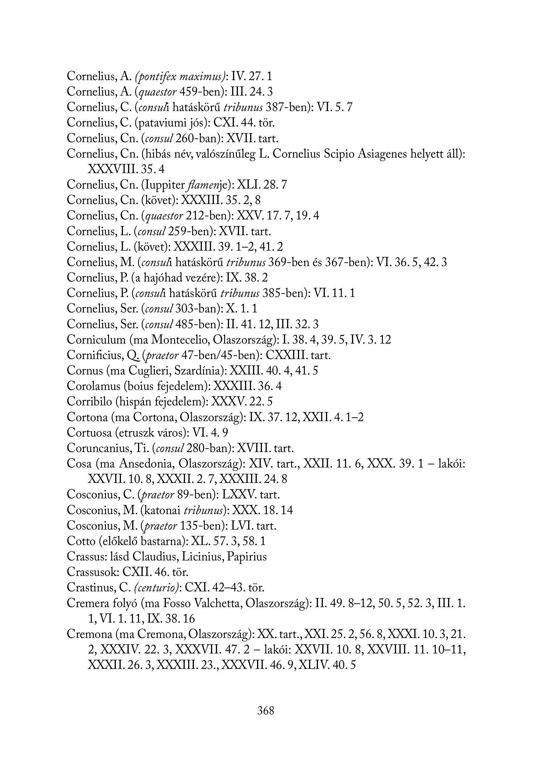 Cornelius, A. (pontifex maximus): IV. 27. 1 Cornelius, A. (guaestor 459-ben): III. 24. 3 Cornelius, C. (consuh hatäskörü tribunus 387-ben): VI. 5.7 Cornelius, C. (pataviumi jós): CXI. 44. tör. Cornelius, Cn. (consul 260-ban): XVII. tart. Cornelius, Cn. (hibás név, valószínűleg L. Cornelius Scipio Asiagenes helyett áll: XXXVIII. 35. 4 Cornelius, Cn. (Iuppiter famenje): XLI. 28.7 Cornelius, Cn. (követ): XXXIII. 35. 2, 8 Cornelius, Cn. (guaestor 212-ben): XXV. 17. 7, 19. 4 Cornelius, L. (consul 259-ben): XVII. tart. Cornelius, L. (követ): XXXIII. 39. 1-2, 41.2 Cornelius, M. (consuli hatáskörű tribunus 369-ben és 367-ben): VI. 36.5, 42.3 Cornelius, P. (a hajóhad vezére): IX. 38. 2 Cornelius, P. (consul hatäskörü zribunus 385-ben): VI. 11. 1 Cornelius, Ser. (consul 303-ban): X. 1.1 Cornelius, Ser. (consul 485-ben): II. 41. 12, III. 32. 3 Corniculum (ma Montecelio, Olaszország): I. 38. 4, 39. 5, IV. 3. 12 Cornificius, Q. (praetor 47-ben/45-ben): CXXIII. tart. Cornus (ma Cuglieri, Szardínia): XXIII. 40. 4, 41. 5 Corolamus (boius fejedelem): XXXIII. 36. 4 Corribilo (hispán fejedelem): XXXV. 22. 5 Cortona (ma Cortona, Olaszország): IX. 37. 12, XXII. 4. 1-2 Cortuosa (etruszk város): VI. 4. 9 Coruncanius, Ti. (consul 280-ban): XVIII. tart. Cosa (ma Ansedonia, Olaszország): XIV. tart., XXII. 11. 6, XXX. 39. 1 — lakói: XXVII. 10. 8, XXXII. 2. 7, XXXIII. 24. 8 Cosconius, C. (praetor 89-ben): LXXV. tart. Cosconius, M. (katonai zribunus): XXX. 18.14 Cosconius, M. (praetor 135-ben): LVI. tart. Cotto (elökelö bastarna): XL. 57.3, 58.1 Crassus: läsd Claudius, Licinius, Papirius Crassusok: CXII. 46. tör. Crastinus, C. (centurio): CXI. 42-43. tör. Cremera folyó (ma Fosso Valchetta, Olaszország): II. 49. 8-12, 50. 5, 52. 3, III. 1. 1, VI. 1. 11, IX. 38.16 Cremona (ma Cremona, Olaszország): XX. tart., XXI. 25. 2, 56. 8, XXXI. 10.3, 21. 2, XXXIV. 22. 3, XXXVII. 47. 2 - lakói: XXVII. 10. 8, XXVIII. 11. 10-11, XXXII. 26. 3, XXXIII. 23., XXXVII. 46. 9, XLIV. 40. 5 368