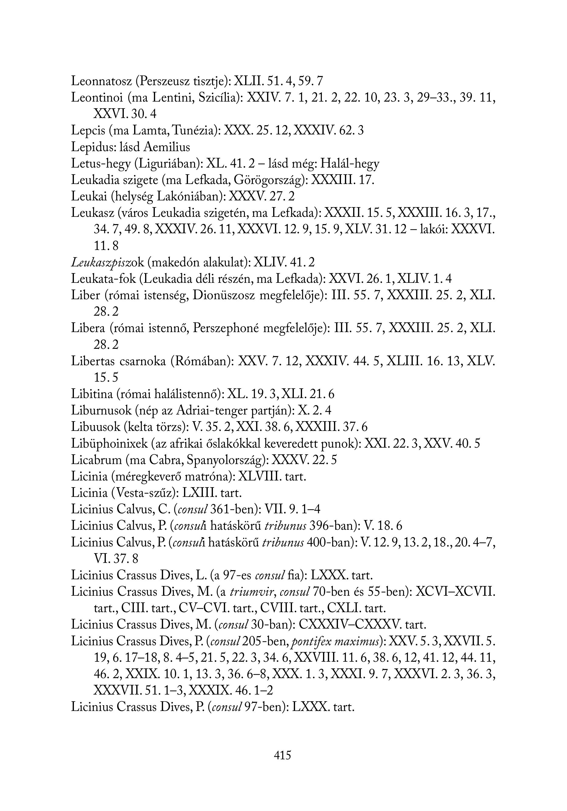 Leonnatosz (Perszeusz tisztje): XLII. 51. 4, 59. 7 Leontinoi (ma Lentini, Szicília): XXIV. 7. 1, 21. 2, 22. 10, 23. 3, 29—33., 39. 11, XXVI.30. 4 Lepcis (ma Lamta, Tunézia): XXX. 25. 12, XXXIV. 62. 3 Lepidus: lásd Aemilius Letus-hegy (Liguriában): XL. 41. 2 — lásd még: Halál-hegy Leukadia szigete (ma Lefkada, Görögország): XXXIII. 17. Leukai (helység Lakóniában): XXXV. 27. 2 Leukasz (város Leukadia szigetén, ma Lefkada): XXXII. 15. 5, XXXIII. 16. 3, 17., 34. 7, 49. 8, XXXIV. 26. 11, XXXVI. 12. 9, 15. 9, XLLV. 31. 12 — lakói: XXXVI. 11.8 Leukaszpiszok (makedón alakulat): XLIV. 41. 2 Leukata-fok (Leukadia déli részén, ma Lefkada): XXVI. 26. 1, XLIV. 1. 4 Liber (római istenség, Dionüszosz megfelelője): III. 55. 7, XXXIII. 25. 2, XLI. 28.2 Libera (római istennő, Perszephoné megfelelője): III. 55. 7, XXXIII. 25. 2, XLI. 28.2 Libertas csarnoka (Rómában): XXV. 7. 12, XXXIV. 44. 5, XLIII. 16. 13, XLV. 15.5 Libitina (római halálistennő): XL. 19. 3, XLI. 21. 6 Liburnusok (nép az Adriai-tenger partján): X. 2. 4 Libuusok (kelta törzs): V. 35. 2, XXI. 38. 6, XXXIII. 37. 6 Libüphoinixek (az afrikai őslakókkal keveredett punok): XXI. 22. 3, XXV. 40. 5 Licabrum (ma Cabra, Spanyolország): XXXV. 22. 5 Licinia (méregkeverő matróna): XLVIII. tart. Licinia ( Vesta-szűz): LXIII. tart. Licinius Calvus, C. (consul 361-ben): VII. 9. 1-4 Licinius Calvus, P. (consuA hatäskörü zribunus 396-ban): V. 18.6 Licinius Calvus, P. (consuA hatäskörü zribunus 400-ban): V.12.9, 13.2, 18.,20.4-7, VI. 37.8 Licinius Crassus Dives, L. (a 97-es consul fia): LXXX. tart. Licinius Crassus Dives, M. (a ¢riumvir, consul 70-ben és 55-ben): XCVI-XCVII. tart., CIII. tart., CV-CVI. tart., CVIII. tart., CXLI. tart. Licinius Crassus Dives, M. (consul 30-ban): CXXXIV-CXXXV. tart. Licinius Crassus Dives, P. (consul 205-ben, pontifex maximus): XXV.5.3, XXVII.5. 19, 6. 17-18, 8. 4-5, 21.5, 22. 3, 34. 6, XXVIII. 11. 6, 38. 6, 12, 41. 12, 44. 11, 46. 2, XXIX. 10. 1, 13.3, 36. 6-8, XXX. 1.3, XXXI. 9. 7, XXXVI. 2. 3, 36. 3, XXXVII. 51. 1-3, XXXIX. 46. 1-2 Licinius Crassus Dives, P. (consu/ 97-ben): LXXX. tart. 415
