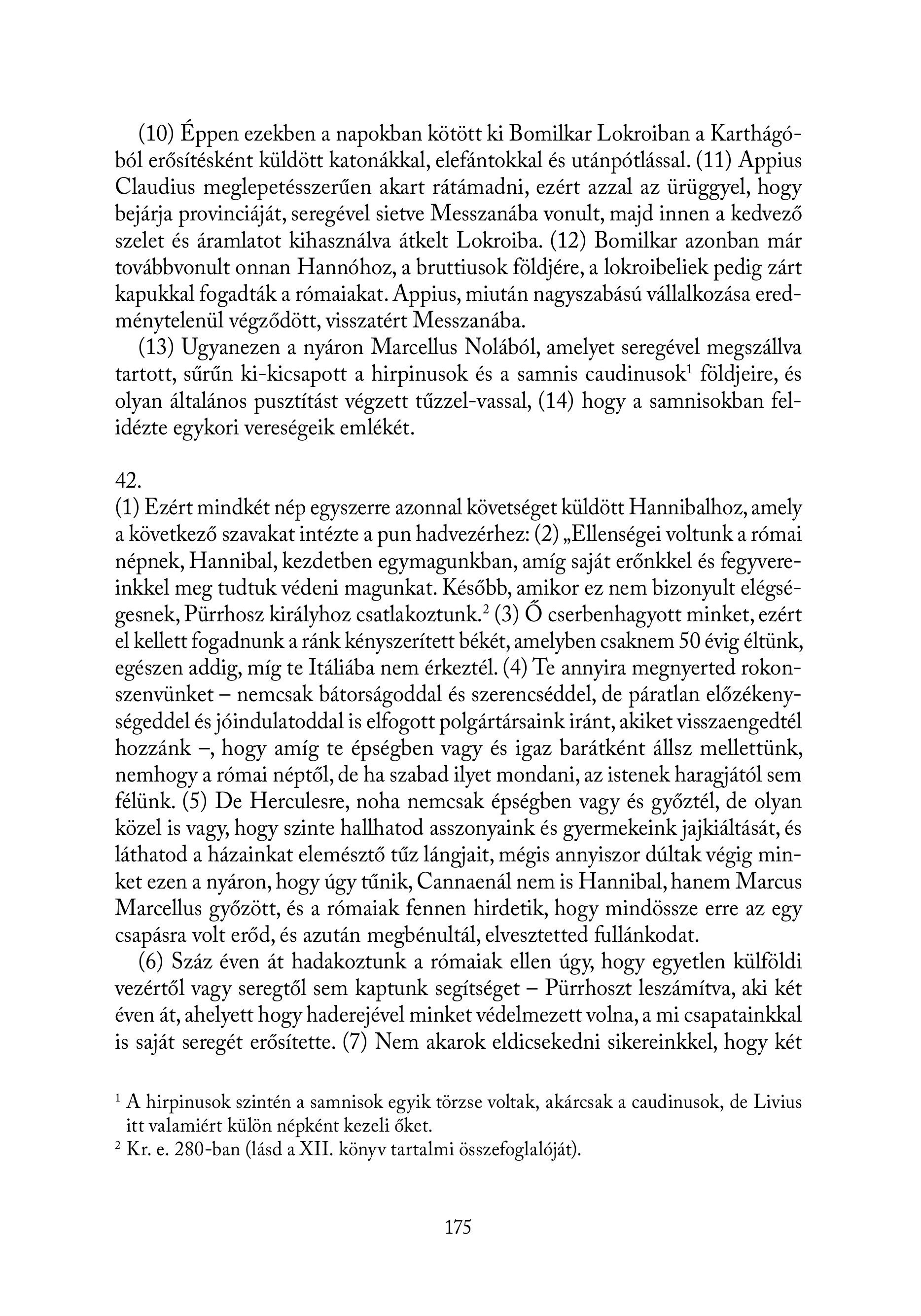 (10) Éppen ezekben a napokban kötött ki Bomilkar Lokroiban a Karthágóból erősítésként küldött katonákkal, elefántokkal és utánpótlással. (11) Appius Claudius meglepetésszerűen akart rátámadni, ezért azzal az ürüggyel, hogy bejárja provinciáját, seregével sietve Messzanába vonult, majd innen a kedvező szelet és áramlatot kihasználva átkelt Lokroiba. (12) Bomilkar azonban már továbbvonult onnan Hannóhoz, a bruttiusok földjére, a lokroibeliek pedig zárt kapukkal fogadták a rómaiakat. Appius, miután nagyszabású vállalkozása eredménytelenül végződött, visszatért Messzanába. (13) Ugyanezen a nyáron Marcellus Nolából, amelyet seregével megszállva tartott, sűrűn ki-kicsapott a hirpinusok és a samnis caudinusok! földjeire, és olyan általános pusztítást végzett tűzzel-vassal, (14) hogy a samnisokban felidézte egykori vereségeik emlékét. 42. (1) Ezért mindkét nép egyszerre azonnal követséget küldött Hannibalhoz, amely a következő szavakat intézte a pun hadvezérhez: (2) , Ellenségei voltunk a római népnek, Hannibal, kezdetben egymagunkban, amíg saját erőnkkel és fegyvereinkkel meg tudtuk védeni magunkat. Később, amikor ez nem bizonyult elégségesnek, Pürrhosz királyhoz csatlakoztunk.? (3) Ő cserbenhagyott minket, ezért el kellett fogadnunk a ránk kényszerített békét, amelyben csaknem 50 évig éltünk, egészen addig, míg te Itáliába nem érkeztél. (4) le annyira megnyerted rokonszenvünket — nemcsak bátorságoddal és szerencséddel, de páratlan előzékenységeddel és jóindulatoddal is elfogott polgártársaink iránt, akiket visszaengedtél hozzánk -, hogy amíg te épségben vagy és igaz barátként állsz mellettünk, nemhogy a római néptől, de ha szabad ilyet mondani, az istenek haragjától sem félünk. (5) De Herculesre, noha nemcsak épségben vagy és győztél, de olyan közel is vagy, hogy szinte hallhatod asszonyaink és gyermekeink jajkiáltását, és láthatod a házainkat elemésztő tűz lángjait, mégis annyiszor dúltak végig minket ezen a nyáron, hogy úgy tűnik, Cannaenál nem is Hannibal, hanem Marcus Marcellus győzött, és a rómaiak fennen hirdetik, hogy mindössze erre az egy csapásra volt erőd, és azután megbénultál, elvesztetted fullánkodat. (6) Száz éven át hadakoztunk a rómaiak ellen úgy, hogy egyetlen külföldi vezértől vagy seregtől sem kaptunk segítséget — Pürrhoszt leszámítva, aki két éven át, ahelyett hogy haderejével minket védelmezett volna, a mi csapatainkkal is saját seregét erősítette. (7) Nem akarok eldicsekedni sikereinkkel, hogy két ! A hirpinusok szintén a samnisok egyik törzse voltak, akárcsak a caudinusok, de Livius itt valamiért külön népként kezeli őket. ? Kr. e. 280-ban (lásd a XII. könyv tartalmi összefoglalóját). 175