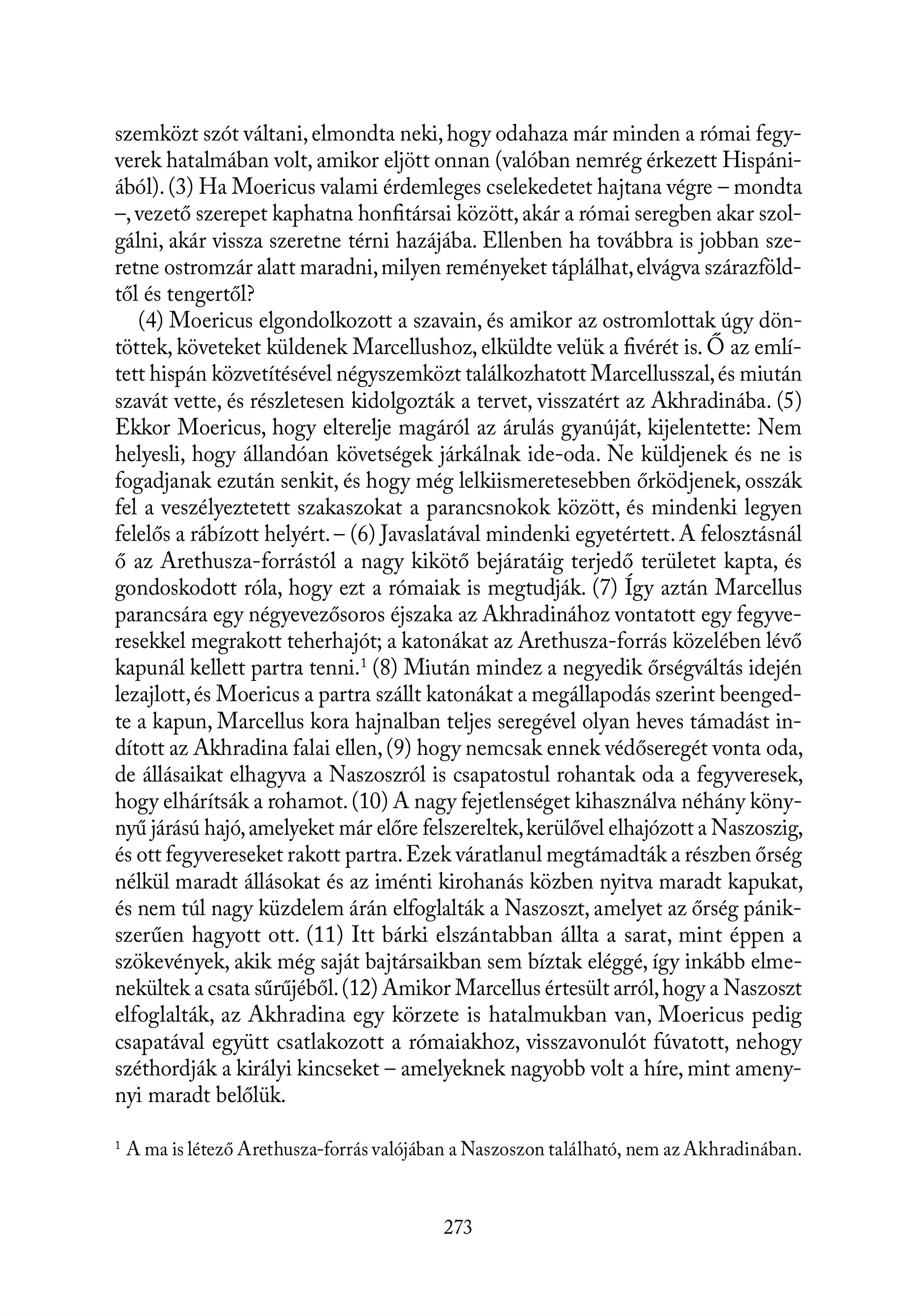 szemközt szót váltani, elmondta neki, hogy odahaza már minden a római fegyverek hatalmában volt, amikor eljött onnan (valóban nemrég érkezett Hispániából). (3) Ha Moericus valami érdemleges cselekedetet hajtana végre — mondta —, vezető szerepet kaphatna honfitársai között, akár a római seregben akar szolgálni, akár vissza szeretne térni hazájába. Ellenben ha továbbra is jobban szeretne ostromzár alatt maradni, milyen reményeket táplálhat, elvágva szárazföldtől és tengertől? (4) Moericus elgondolkozott a szavain, és amikor az ostromlottak úgy döntöttek, követeket küldenek Marcellushoz, elküldte velük a fivérét is. Ő az említett hispán közvetítésével négyszemközt találkozhatott Marcellusszal, és miután szavát vette, és részletesen kidolgozták a tervet, visszatért az Akhradinába. (5) Ekkor Moericus, hogy elterelje magáról az árulás gyanúját, kijelentette: Nem helyesli, hogy állandóan követségek járkálnak ide-oda. Ne küldjenek és ne is fogadjanak ezután senkit, és hogy még lelkiismeretesebben őrködjenek, osszák fel a veszélyeztetett szakaszokat a parancsnokok között, és mindenki legyen felelős a rábízott helyért. — (6) Javaslatával mindenki egyetértett. A felosztásnál ő az Arethusza-forrástól a nagy kikötő bejáratáig terjedő területet kapta, és gondoskodott róla, hogy ezt a rómaiak is megtudják. (7) Így aztán Marcellus parancsára egy négyevezősoros éjszaka az Akhradinához vontatott egy fegyveresekkel megrakott teherhajót; a katonákat az Arethusza-forrás közelében lévő kapunál kellett partra tenni.! (8) Miután mindez a negyedik őrségváltás idején lezajlott, és Moericus a partra szállt katonákat a megállapodás szerint beengedte a kapun, Marcellus kora hajnalban teljes seregével olyan heves támadást indított az Akhradina falai ellen, (9) hogy nemcsak ennek védőseregét vonta oda, de állásaikat elhagyva a Naszoszról is csapatostul rohantak oda a fegyveresek, hogy elhárítsák a rohamot. (10) A nagy fejetlenséget kihasználva néhány könynyű járású hajó, amelyeket már előre felszereltek, kerülővel elhajózott a Naszoszig, és ott fegyvereseket rakott partra. Ezek váratlanul megtámadták a részben őrség nélkül maradt állásokat és az iménti kirohanás közben nyitva maradt kapukat, és nem túl nagy küzdelem árán elfoglalták a Naszoszt, amelyet az őrség pánikszerűen hagyott ott. (11) Itt bárki elszántabban állta a sarat, mint éppen a szökevények, akik még saját bajtársaikban sem bíztak eléggé, így inkább elmenekültek a csata sűrűjéből. (12) Amikor Marcellus értesült arról, hogy a Naszoszt elfoglalták, az Akhradina egy körzete is hatalmukban van, Moericus pedig csapatával együtt csatlakozott a rómaiakhoz, visszavonulót fúvatott, nehogy széthordják a királyi kincseket — amelyeknek nagyobb volt a híre, mint amenynyi maradt belőlük. ! A ma is létező Arethusza-forrás valójában a Naszoszon található, nem az Akhradinában. 273