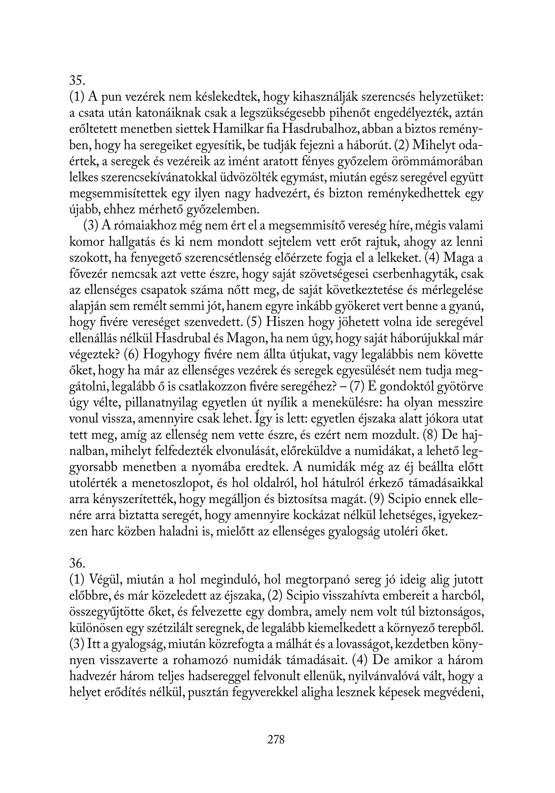 35. (1) A pun vezérek nem késlekedtek, hogy kihasználják szerencsés helyzetüket: a csata után katonáiknak csak a legszükségesebb pihenőt engedélyezték, aztán erőltetett menetben siettek Hamilkar fia Hasdrubalhoz, abban a biztos reményben, hogy ha seregeiket egyesítik, be tudják fejezni a háborút. (2) Mihelyt odaértek, a seregek és vezéreik az imént aratott fényes győzelem örömmámorában lelkes szerencsekívánatokkal üdvözölték egymást, miután egész seregével együtt megsemmisítettek egy ilyen nagy hadvezért, és bizton reménykedhettek egy újabb, ehhez mérhető győzelemben. (3) A rómaiakhoz még nem ért el a megsemmisítő vereség híre, mégis valami komor hallgatás és ki nem mondott sejtelem vett erőt rajtuk, ahogy az lenni szokott, ha fenyegető szerencsétlenség előérzete fogja el a lelkeket. (4) Maga a fővezér nemcsak azt vette észre, hogy saját szövetségesei cserbenhagyták, csak az ellenséges csapatok száma nőtt meg, de saját következtetése és mérlegelése alapján sem remélt semmi jót, hanem egyre inkább gyökeret vert benne a gyanú, hogy fivére vereséget szenvedett. (5) Hiszen hogy jöhetett volna ide seregével ellenállás nélkül Hasdrubal és Magon, ha nem úgy, hogy saját háborújukkal már végeztek? (6) Hogyhogy fivére nem állta útjukat, vagy legalábbis nem követte őket, hogy ha már az ellenséges vezérek és seregek egyesülését nem tudja meggátolni, legalább ő is csatlakozzon fivére seregéhez? — (7) E gondoktól gyötörve úgy vélte, pillanatnyilag egyetlen út nyílik a menekülésre: ha olyan messzire vonul vissza, amennyire csak lehet. Így is lett: egyetlen éjszaka alatt jókora utat tett meg, amíg az ellenség nem vette észre, és ezért nem mozdult. (8) De hajnalban, mihelyt felfedezték elvonulását, előreküldve a numidákat, a lehető leggyorsabb menetben a nyomába eredtek. A numidák még az éj beállta előtt utolérték a menetoszlopot, és hol oldalról, hol hátulról érkező támadásaikkal arra kényszerítették, hogy megálljon és biztosítsa magát. (9) Scipio ennek ellenére arra biztatta seregét, hogy amennyire kockázat nélkül lehetséges, igyekezzen harc közben haladni is, mielőtt az ellenséges gyalogság utoléri őket. 36. (1) Végül, miután a hol meginduló, hol megtorpanó sereg jó ideig alig jutott előbbre, és már közeledett az éjszaka, (2) Scipio visszahívta embereit a harcból, összegyűjtötte őket, és felvezette egy dombra, amely nem volt túl biztonságos, különösen egy szétzilált seregnek, de legalább kiemelkedett a környező terepből. (3) Itt a gyalogság, miután közrefogta a málhát és a lovasságot, kezdetben könynyen visszaverte a rohamozó numidák támadásait. (4) De amikor a három hadvezér három teljes hadsereggel felvonult ellenük, nyilvánvalóvá vált, hogy a helyet erődítés nélkül, pusztán fegyverekkel aligha lesznek képesek megvédeni, 278