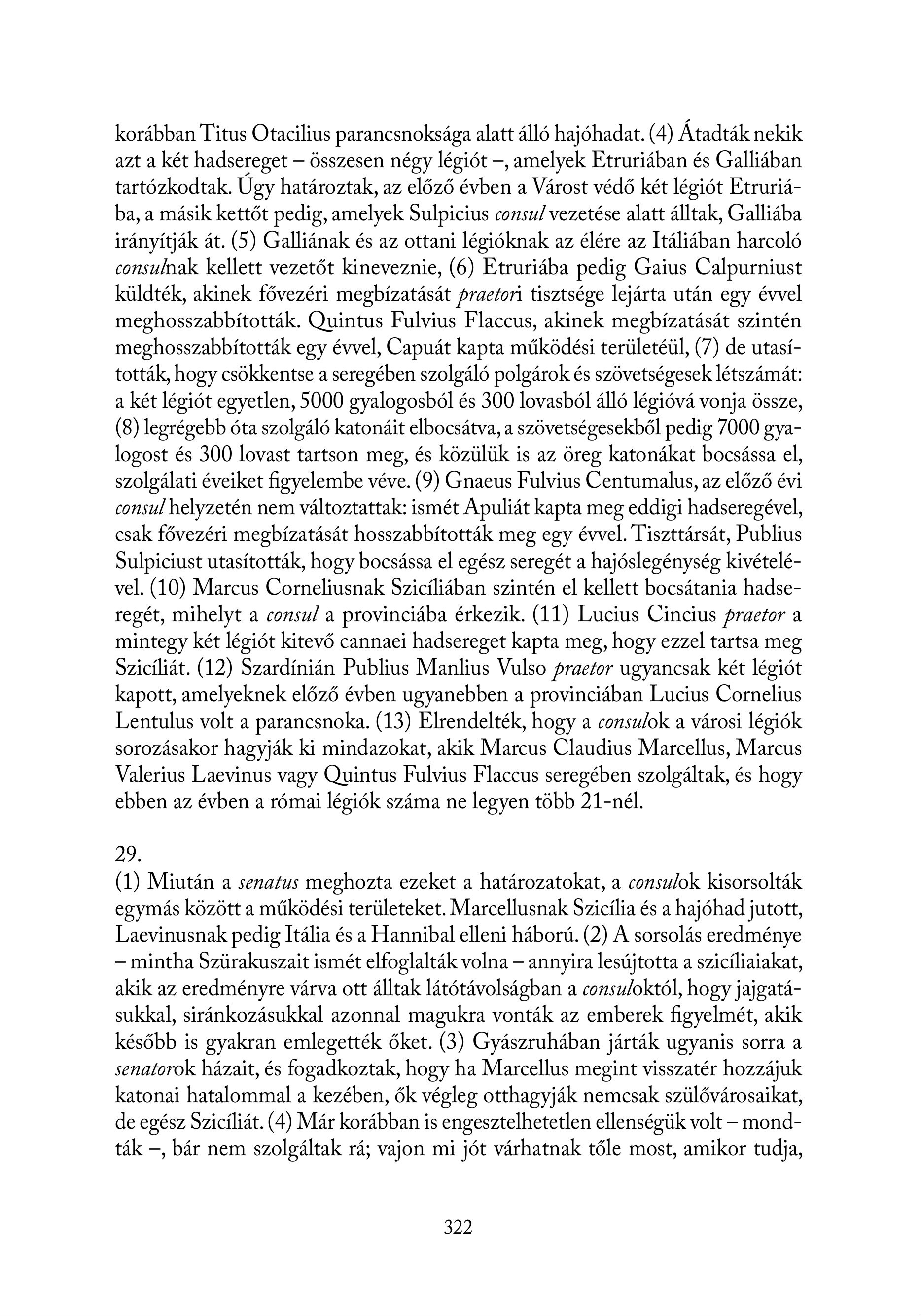 korábban Titus Otacilius parancsnoksága alatt álló hajóhadat. (4) Átadták nekik azt a két hadsereget — összesen négy légiót —, amelyek Etruriában és Galliában tartózkodtak. Úgy határoztak, az előző évben a Várost védő két légiót Etruriába, a másik kettőt pedig, amelyek Sulpicius consu/ vezetese alatt álltak, Galliába irányítják át. (5) Galliának és az ottani légióknak az élére az Itáliában harcoló consulnak kellett vezetőt kineveznie, (6) Etruriába pedig Gaius Calpurniust küldték, akinek fővezéri megbízatását praezori tisztsége lejárta után egy évvel meghosszabbították. Ouintus Fulvius Flaccus, akinek megbízatását szintén meghosszabbították egy évvel, Capuát kapta működési területéül, (7) de utasították, hogy csökkentse a seregében szolgáló polgárok és szövetségesek létszámát: a két légiót egyetlen, 5000 gyalogosból és 300 lovasból álló légióvá vonja össze, (8) legrégebb óta szolgáló katonáit elbocsátva, a szövetségesekből pedig 7000 gyalogost és 300 lovast tartson meg, és közülük is az öreg katonákat bocsássa el, szolgálati éveiket figyelembe véve. (9) Gnaeus Fulvius Centumalus, az előző évi consul helyzetén nem változtattak: ismét Apuliát kapta meg eddigi hadseregével, csak fővezéri megbízatását hosszabbították meg egy évvel. Liszttársát, Publius Sulpiciust utasították, hogy bocsássa el egész seregét a hajóslegénység kivételével. (10) Marcus Corneliusnak Szicíliában szintén el kellett bocsátania hadseregét, mihelyt a consul a provinciaba érkezik. (11) Lucius Cincius praetor a mintegy két légiót kitevő cannaei hadsereget kapta meg, hogy ezzel tartsa meg Sziciliät. (12) Szardiniän Publius Manlius Vulso praetor ugyancsak két légiôt kapott, amelyeknek előző évben ugyanebben a provinciában Lucius Cornelius Lentulus volt a parancsnoka. (13) Elrendelték, hogy a consulok a városi légiók sorozásakor hagyják ki mindazokat, akik Marcus Claudius Marcellus, Marcus Valerius Laevinus vagy Ouintus Fulvius Flaccus seregében szolgáltak, és hogy ebben az évben a római légiók száma ne legyen több 21-nél. 29. (1) Miután a senazus meghozta ezeket a határozatokat, a consulok kisorsolták egymás között a működési területeket. Marcellusnak Szicília és a hajóhad jutott, Laevinusnak pedig Itália és a Hannibal elleni háború. (2) A sorsolás eredménye — mintha Szürakuszait ismét elfoglalták volna — annyira lesújtotta a szicíliaiakat, akik az eredményre várva ott álltak látótávolságban a consuloktöl, hogy jajgatäsukkal, siránkozásukkal azonnal magukra vonták az emberek figyelmét, akik később is gyakran emlegették őket. (3) Gyászruhában járták ugyanis sorra a senatorok házait, és fogadkoztak, hogy ha Marcellus megint visszatér hozzájuk katonai hatalommal a kezében, ők végleg otthagyják nemcsak szülővárosaikat, de egész Szicíliát. (4) Már korábban is engesztelhetetlen ellenségük volt — mondták -, bár nem szolgáltak rá; vajon mi jót várhatnak tőle most, amikor tudja, 322