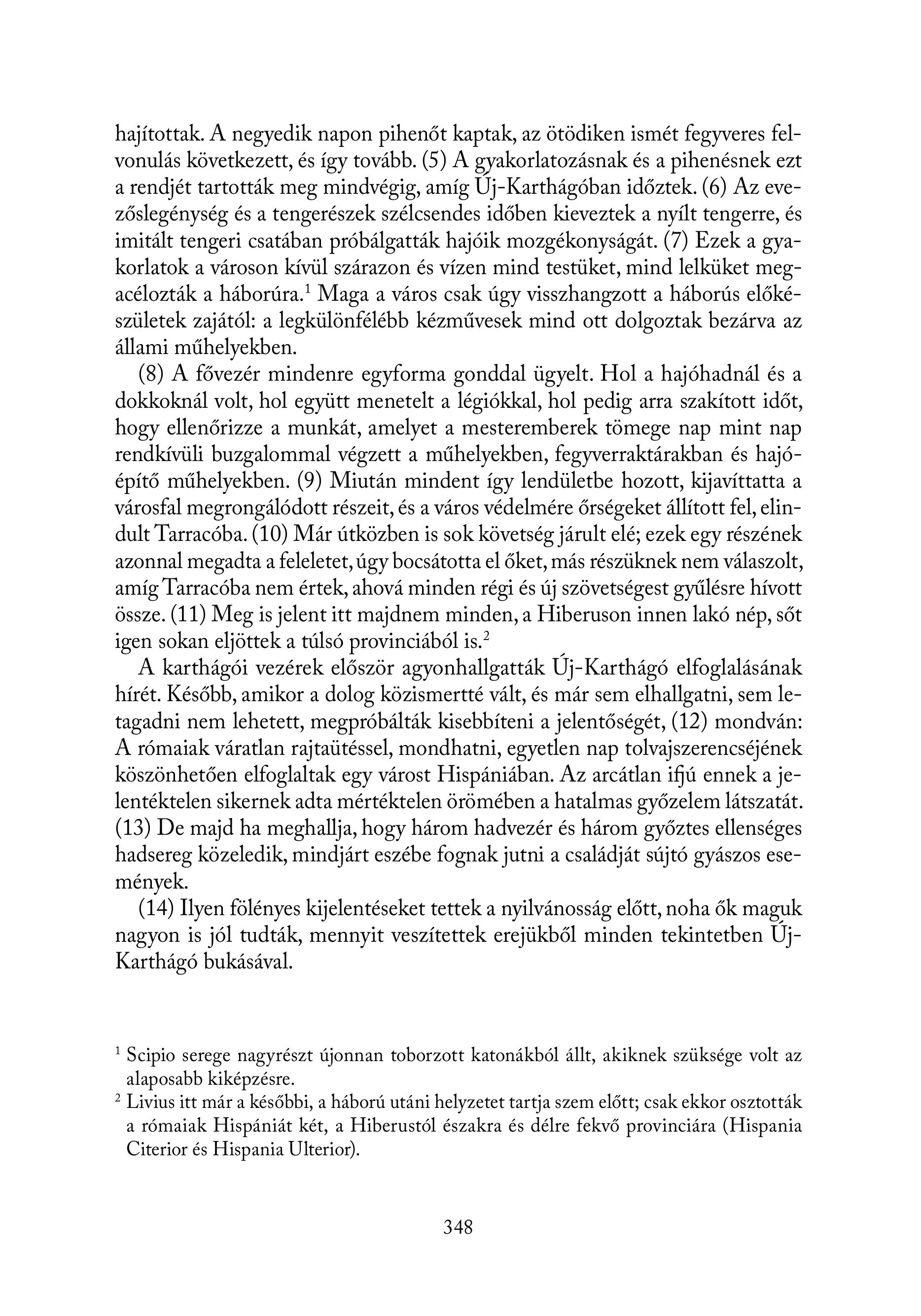 hajítottak. A negyedik napon pihenőt kaptak, az ötödiken ismét fegyveres felvonulás következett, és így tovább. (5) A gyakorlatozásnak és a pihenésnek ezt a rendjét tartották meg mindvégig, amíg UJ-Karthágóban időztek. (6) Az evezőslegénység és a tengerészek szélcsendes időben kieveztek a nyílt tengerre, és imitált tengeri csatában próbálgatták hajóik mozgékonyságát. (7) Ezek a gyakorlatok a városon kívül szárazon és vízen mind testüket, mind lelküket megacélozták a háborúra." Maga a város csak úgy visszhangzott a háborús előkészületek zajától: a legkülönfélébb kézművesek mind ott dolgoztak bezárva az állami műhelyekben. (8) A fővezér mindenre egyforma gonddal ügyelt. Hol a hajóhadnál és a dokkoknál volt, hol együtt menetelt a légiókkal, hol pedig arra szakított időt, hogy ellenőrizze a munkát, amelyet a mesteremberek tömege nap mint nap rendkívüli buzgalommal végzett a műhelyekben, fegyverraktárakban és hajóépítő műhelyekben. (9) Miután mindent így lendületbe hozott, kijavíttatta a városfal megrongálódott részeit, és a város védelmére őrségeket állított fel, elindult Tarracóba. (10) Már útközben is sok követség járult elé; ezek egy részének azonnal megadta a feleletet, úgy bocsátotta el őket, más részüknek nem válaszolt, amíg Tarracóba nem értek, ahová minden régi és új szövetségest gyűlésre hívott össze. (11) Meg is jelent itt majdnem minden, a Hiberuson innen lakó nép, sőt igen sokan eljöttek a túlsó provinciából is.? A karthágói vezérek először agyonhallgatták Új- Karthágó elfoglalásának hírét. Később, amikor a dolog közismertté vált, és már sem elhallgatni, sem letagadni nem lehetett, megpróbálták kisebbíteni a jelentőségét, (12) mondván: A rómaiak váratlan rajtaütéssel, mondhatni, egyetlen nap tolvajszerencséjének köszönhetően elfoglaltak egy várost Hispániában. Az arcátlan ifjú ennek a jelentéktelen sikernek adta mértéktelen örömében a hatalmas győzelem látszatát. (13) De majd ha meghallja, hogy három hadvezér és három győztes ellenséges hadsereg közeledik, mindjárt eszébe fognak jutni a családját sújtó gyászos események. (14) Ilyen fölényes kijelentéseket tettek a nyilvánosság előtt, noha ők maguk nagyon is jól tudták, mennyit veszítettek erejükből minden tekintetben ÚjKarthágó bukásával. ! Scipio serege nagyrészt újonnan toborzott katonákból állt, akiknek szüksége volt az alaposabb kiképzésre. ? Livius itt már a későbbi, a háború utáni helyzetet tartja szem előtt; csak ekkor osztották a rómaiak Hispániát két, a Hiberustól északra és délre fekvő provinciára (Hispania Citerior és Hispania Ulterior). 348