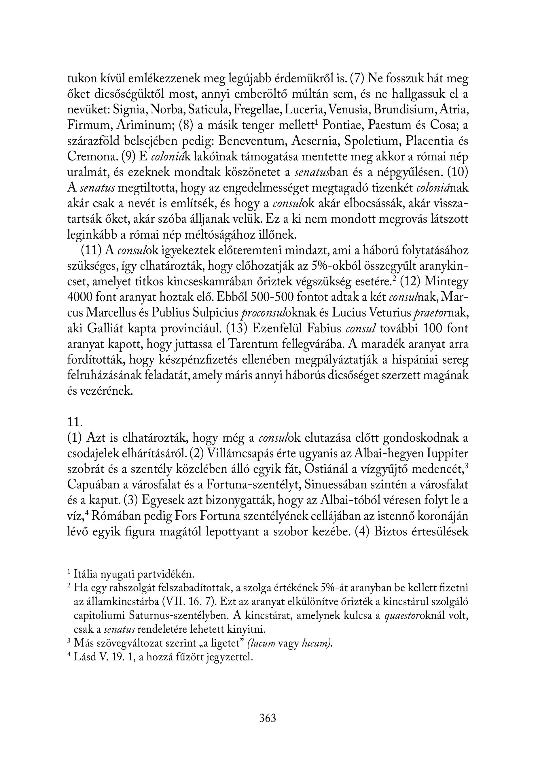 tukon kívül emlékezzenek meg legújabb érdemükfről is. (7) Ne fosszuk hát meg őket dicsőségüktől most, annyi emberöltő múltán sem, és ne hallgassuk el a nevüket: Signia, Norba, Saticula, Fregellae, Luceria, Venusia, Brundisium, Atria, Firmum, Ariminum; (8) a mäsik tenger mellett! Pontiae, Paestum és Cosa; a szärazföld belsejeben pedig: Beneventum, Aesernia, Spoletium, Placentia és Cremona. (9) E coloniak lakóinak támogatása mentette meg akkor a római nép uralmát, és ezeknek mondtak köszönetet a senazusban és a népgyűlésen. (10) A senatus megtiltotta, hogy az engedelmességet megtagadó tizenkét coloniának akár csak a nevét is említsék, és hogy a consulok akár elbocsássák, akár visszatartsák őket, akár szóba álljanak velük. Ez a ki nem mondott megrovás látszott leginkább a római nép méltóságához illőnek. (11) A consulok igyekeztek előteremteni mindazt, ami a háború folytatásához szükséges, így elhatározták, hogy előhozatják az 596-okból összegyűlt aranykincset, amelyet titkos kincseskamrában őriztek végszükség esetére.? (12) Mintegy 4000 font aranyat hoztak elö. Ebböl 500-500 fontot adtak a ket consulnak, Marcus Marcellus és Publius Sulpicius proconsuloknak és Lucius Veturius praetornak, aki Galliat kapta provinciäul. (13) Ezenfelül Fabius consu/ további 100 font aranyat kapott, hogy juttassa el Tarentum fellegvárába. A maradék aranyat arra fordították, hogy készpénzfizetés ellenében megpályáztatják a hispániai sereg felruházásának feladatát, amely máris annyi háborús dicsőséget szerzett magának és vezérének. 11. (1) Azt is elhatározták, hogy még a consulok elutazása előtt gondoskodnak a csodajelek elhárításáról. (2) Villámcsapás érte ugyanis az Albai-hegyen Iuppiter szobrát és a szentély közelében álló egyik fát, Ostiánál a vízgyűjtő medencét," Capuában a városfalat és a Fortuna-szentélyt, Sinuessában szintén a városfalat és a kaput. (3) Egyesek azt bizonygatták, hogy az Albai-tóból véresen folyt le a víz," Rómában pedig Fors Fortuna szentélyének cellájában az istennő koronáján lévő egyik figura magától lepottyant a szobor kezébe. (4) Biztos értesülések ! Itália nyugati partvidékén. ? Ha egy rabszolgát felszabadítottak, a szolga értékének 590-át aranyban be kellett fizetni az államkincstárba (VII. 16. 7). Ezt az aranyat elkülönítve őrizték a kincstárul szolgáló capitoliumi Saturnus-szentélyben. A kincstárat, amelynek kulcsa a guaeszoroknál volt, csak a senazus rendeletére lehetett kinyitni. 3 Más szövegváltozat szerint , a ligetet" (Jacum vagy lucum). * Läsd V. 19. 1, a hozzä füzött jegyzettel. 363