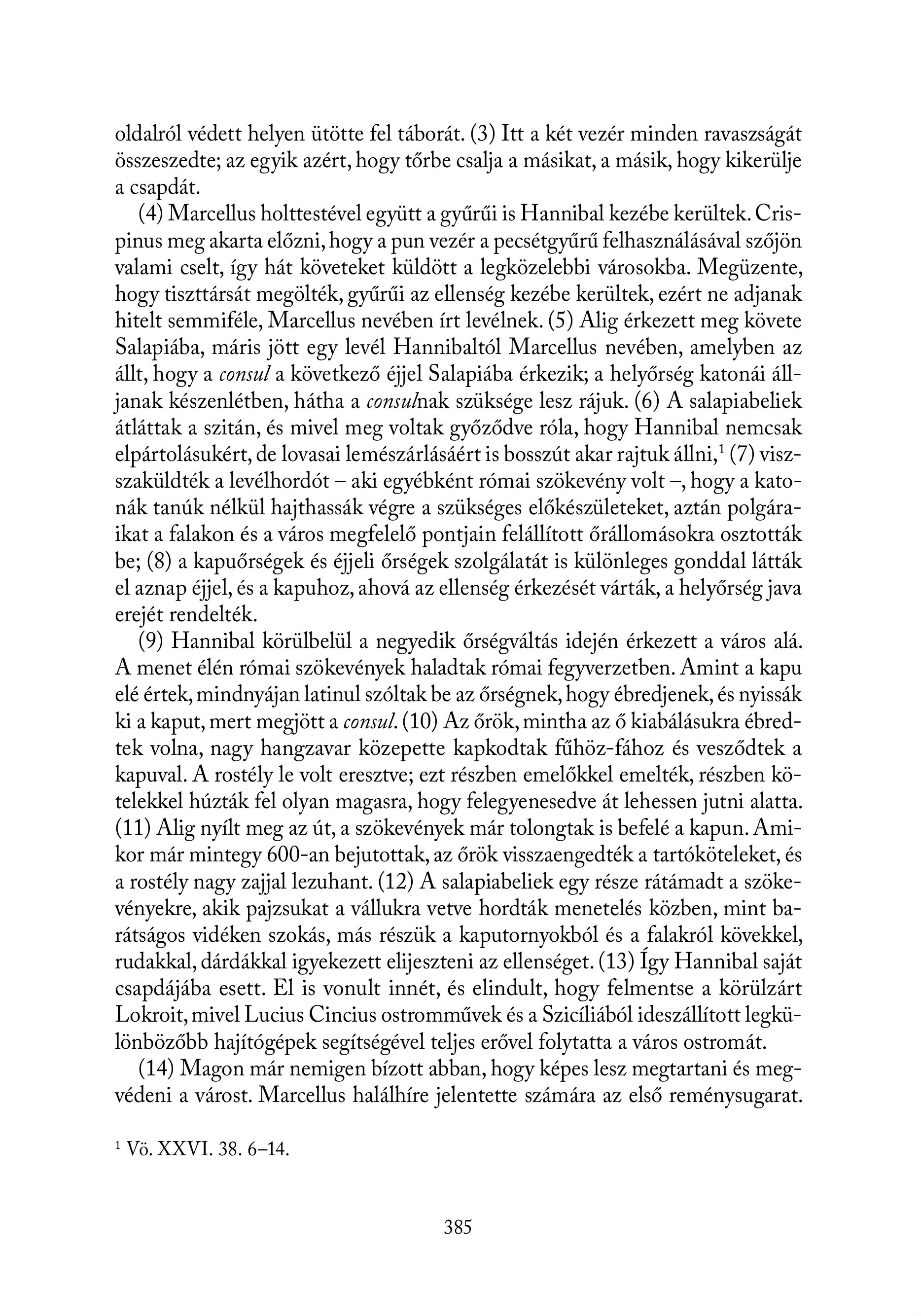 oldalról védett helyen ütötte fel táborát. (3) Itt a két vezér minden ravaszságát összeszedte; az egyik azért, hogy tőrbe csalja a másikat, a másik, hogy kikerülje a csapdát. (4) Marcellus holttestével együtt a gyűrűi is Hannibal kezébe kerültek. Crispinus meg akarta előzni, hogy a pun vezér a pecsétgyűrű felhasználásával szőjön valami cselt, így hát követeket küldött a legközelebbi városokba. Megüzente, hogy tiszttársát megölték, gyűrűi az ellenség kezébe kerültek, ezért ne adjanak hitelt semmiféle, Marcellus nevében írt levélnek. (5) Alig érkezett meg követe Salapiába, máris jött egy levél Hannibaltól Marcellus nevében, amelyben az állt, hogy a consul a következő éjjel Salapiába érkezik; a helyőrség katonái álljanak készenlétben, hátha a consulnak szüksége lesz räjuk. (6) A salapiabeliek átláttak a szitán, és mivel meg voltak győződve róla, hogy Hannibal nemcsak elpártolásukért, de lovasai lemészárlásáért is bosszút akar rajtuk ällni,! (7) viszszaküldték a levélhordót — aki egyébként római szökevény volt —, hogy a katonák tanúk nélkül hajthassák végre a szükséges előkészületeket, aztán polgáraikat a falakon és a város megfelelő pontjain felállított őrállomásokra osztották be; (8) a kapuőrségek és éjjeli őrségek szolgálatát is különleges gonddal látták el aznap éjjel, és akapuhoz, ahová az ellenség érkezését várták, a helyőrség java erejét rendelték. (9) Hannibal körülbelül a negyedik őrségváltás idején érkezett a város alá. A menet élén római szökevények haladtak római fegyverzetben. Amint a kapu elé értek, mindnyájan latinul szóltak be az őrségnek, hogy ébredjenek, és nyissák ki a kaput, mert megjött a consul. (10) Az őrök, mintha az ő kiabálásukra ébredtek volna, nagy hangzavar közepette kapkodtak fűhöz-fához és vesződtek a kapuval. A rostély le volt eresztve; ezt részben emelőkkel emelték, részben kötelekkel húzták fel olyan magasra, hogy felegyenesedve át lehessen jutni alatta. (11) Alig nyílt meg az út, a szökevények már tolongtak is befelé a kapun. Amikor már mintegy 600-an bejutottak, az őrök visszaengedték a tartóköteleket, és a rostély nagy zajjal lezuhant. (12) A salapiabeliek egy része rátámadt a szökevényekre, akik pajzsukat a vállukra vetve hordták menetelés közben, mint barátságos vidéken szokás, más részük a kaputornyokból és a falakról kövekkel, rudakkal, dárdákkal igyekezett elijeszteni az ellenséget. (13) Így Hannibal saját csapdájába esett. El is vonult innét, és elindult, hogy felmentse a körülzárt Lokroit, mivel Lucius Cincius ostrommtivek és a Sziciliäböl ideszällitott legkülönbözőbb hajítógépek segítségével teljes erővel folytatta a város ostromát. (14) Magon már nemigen bízott abban, hogy képes lesz megtartani és megvédeni a várost. Marcellus halálhíre jelentette számára az első reménysugarat. ! Vö. XXVI. 38. 6—14. 385
