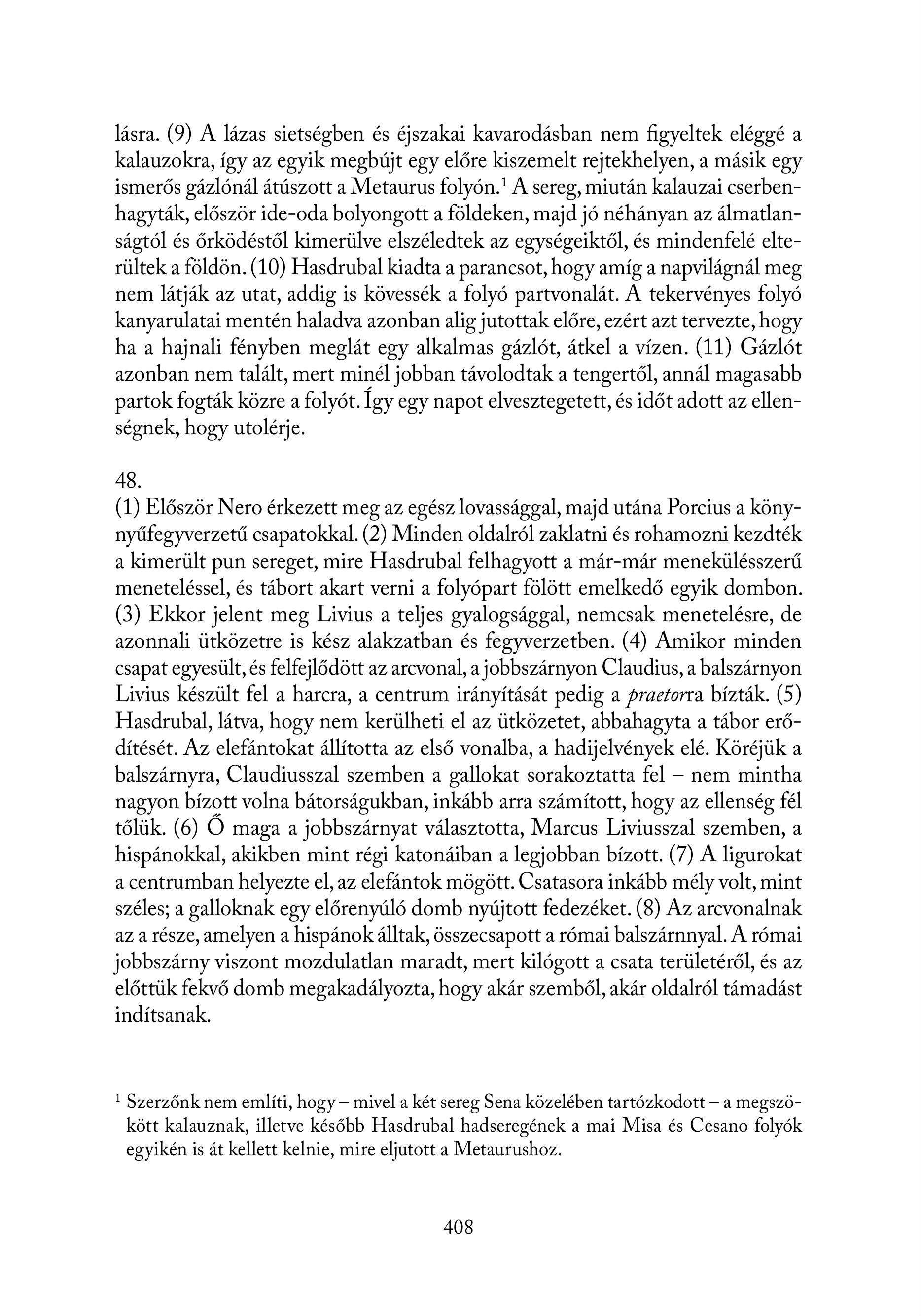 lásra. (9) A lázas sietségben és éjszakai kavarodásban nem figyeltek eléggé a kalauzokra, így az egyik megbújt egy előre kiszemelt rejtekhelyen, a másik egy ismerős gázlónál átúszott a Metaurus folyón.! A sereg, miután kalauzai cserbenhagyták, először ide-oda bolyongott a földeken, majd jó néhányan az álmatlanságtól és őrködéstől kimerülve elszéledtek az egységeiktől, és mindenfelé elterültek a földön. (10) Hasdrubal kiadta a parancsot, hogy amíg a napvilágnál meg nem látják az utat, addig is kövessék a folyó partvonalát. A tekervényes folyó kanyarulatai mentén haladva azonban alig jutottak előre, ezért azt tervezte, hogy ha a hajnali fényben meglát egy alkalmas gázlót, átkel a vízen. (11) Gázlót azonban nem talált, mert minél jobban távolodtak a tengertől, annál magasabb partok fogták közre a folyót. Így egy napot elvesztegetett, és időt adott az ellenségnek, hogy utolérje. 48. (1) Először Nero érkezett meg az egész lovassággal, majd utána Porcius a könynyűfegyverzetű csapatokkal. (2) Minden oldalról zaklatni és rohamozni kezdték a kimerült pun sereget, mire Hasdrubal felhagyott a már-már menekülésszerű meneteléssel, és tábort akart verni a folyópart fölött emelkedő egyik dombon. (3) Ekkor jelent meg Livius a teljes gyalogsággal, nemcsak menetelésre, de azonnali ütközetre is kész alakzatban és fegyverzetben. (4) Amikor minden csapat egyesült, és felfejlődött az arcvonal, a jobbszárnyon Claudius, a balszárnyon Livius készült fel a harcra, a centrum irányítását pedig a praezorra bízták. (5) Hasdrubal, látva, hogy nem kerülheti el az ütközetet, abbahagyta a tábor erődítését. Az elefántokat állította az első vonalba, a hadijelvények elé. Köréjük a balszárnyra, Claudiusszal szemben a gallokat sorakoztatta fel — nem mintha nagyon bízott volna bátorságukban, inkább arra számított, hogy az ellenség fél tőlük. (6) Ő maga a jobbszárnyat választotta, Marcus Liviusszal szemben, a hispánokkal, akikben mint régi katonáiban a legjobban bízott. (7) A ligurokat a centrumban helyezte el, az elefántok mögött. Csatasora inkább mély volt, mint széles; a galloknak egy előrenyúló domb nyújtott fedezéket. (8) Az arcvonalnak az a része, amelyen a hispánok álltak, összecsapott a római balszárnnyal. A római jobbszárny viszont mozdulatlan maradt, mert kilógott a csata területéről, és az előttük fekvő domb megakadályozta, hogy akár szemből, akár oldalról támadást indítsanak. ! Szerzőnk nem említi, hogy — mivel a két sereg Sena közelében tartózkodott — a megszökött kalauznak, illetve később Hasdrubal hadseregének a mai Misa és Cesano folyók egyikén is át kellett kelnie, mire eljutott a Metaurushoz. 408