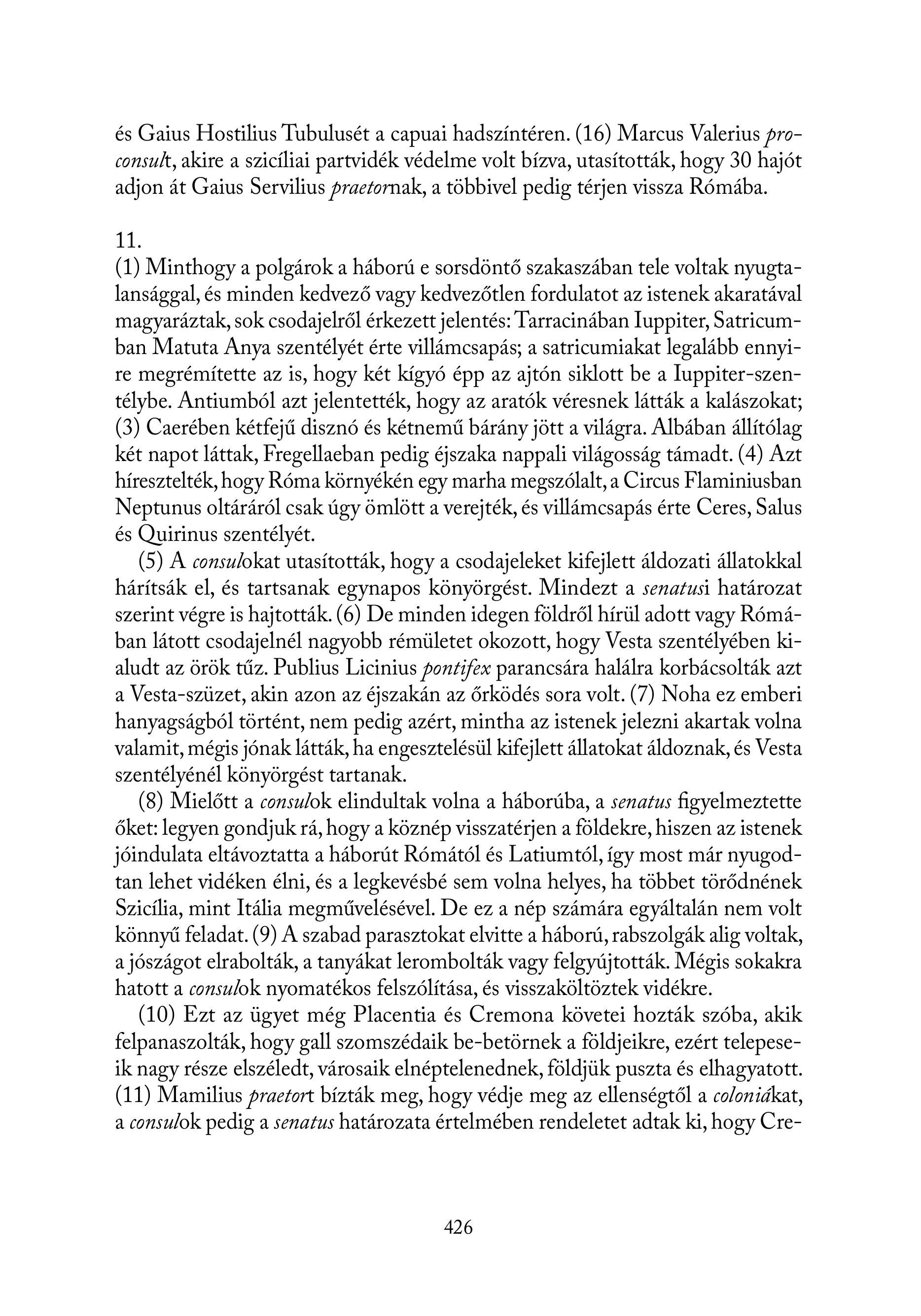 és Gaius Hostilius Tubulusét a capuai hadszintéren. (16) Marcus Valerius proconsult, akire a sziciliai partvidék védelme volt bizva, utasitottak, hogy 30 hajét adjon at Gaius Servilius praetornak, a tobbivel pedig térjen vissza Rémäba. 11. (1) Minthogy a polgárok a háború e sorsdöntő szakaszában tele voltak nyugtalansággal, és minden kedvező vagy kedvezőtlen fordulatot az istenek akaratával magyaráztak, sok csodajelről érkezett jelentés: Tarracinában Iuppiter, Satricumban Matuta Anya szentélyét érte villámcsapás; a satricumiakat legalább ennyire megrémítette az is, hogy két kígyó épp az ajtón siklott be a luppiter-szentélybe. Antiumból azt jelentették, hogy az aratók véresnek látták a kalászokat; (3) Caerében kétfejű disznó és kétnemű bárány jött a világra. Albában állítólag két napot láttak, Fregellaeban pedig éjszaka nappali világosság támadt. (4) Azt híresztelték, hogy Róma környékén egy marha megszólalt, a Circus Flaminiusban Neptunus oltáráról csak úgy ömlött a verejték, és villámcsapás érte Ceres, Salus és Quirinus szentélyét. (5) A consulokat utasították, hogy a csodajeleket kifejlett áldozati állatokkal hárítsák el, és tartsanak egynapos könyörgést. Mindezt a semazusi határozat szerint végre is hajtották. (6) De minden idegen földről hírül adott vagy Rómában látott csodajelnél nagyobb rémületet okozott, hogy Vesta szentélyében kialudt az örök tűz. Publius Licinius bonzifex parancsára halálra korbácsolták azt a Vesta-szüzet, akin azon az éjszakán az őrködés sora volt. (7) Noha ez emberi hanyagságból történt, nem pedig azért, mintha az istenek jelezni akartak volna valamit, mégis jónak látták, ha engesztelésül kifejlett állatokat áldoznak, és Vesta szentélyénél könyörgést tartanak. (8) Mielőtt a consulok elindultak volna a háborúba, a senaíus figyelmeztette őket: legyen gondjuk rá, hogy a köznép visszatérjen a földekre, hiszen az istenek jóindulata eltávoztatta a háborút Rómától és Latiumtól, így most már nyugodtan lehet vidéken élni, és a legkevésbé sem volna helyes, ha többet törődnének Szicília, mint Itália megművelésével. De ez a nép számára egyáltalán nem volt könnyű feladat. (9) A szabad parasztokat elvitte a háború, rabszolgák alig voltak, a jószágot elrabolták, a tanyákat lerombolták vagy felgyújtották. Mégis sokakra hatott a consulok nyomatékos felszólítása, és visszaköltöztek vidékre. (10) Ezt az ügyet még Placentia és Cremona követei hozták szóba, akik felpanaszolták, hogy gall szomszédaik be-betörnek a földjeikre, ezért telepeseik nagy része elszéledt, városaik elnéptelenednek, földjük puszta és elhagyatott. (11) Mamilius praetort biztak meg, hogy védje meg az ellenségtől a co/oniákat, a consulok pedig a senazus határozata értelmében rendeletet adtak ki, hogy Cre426