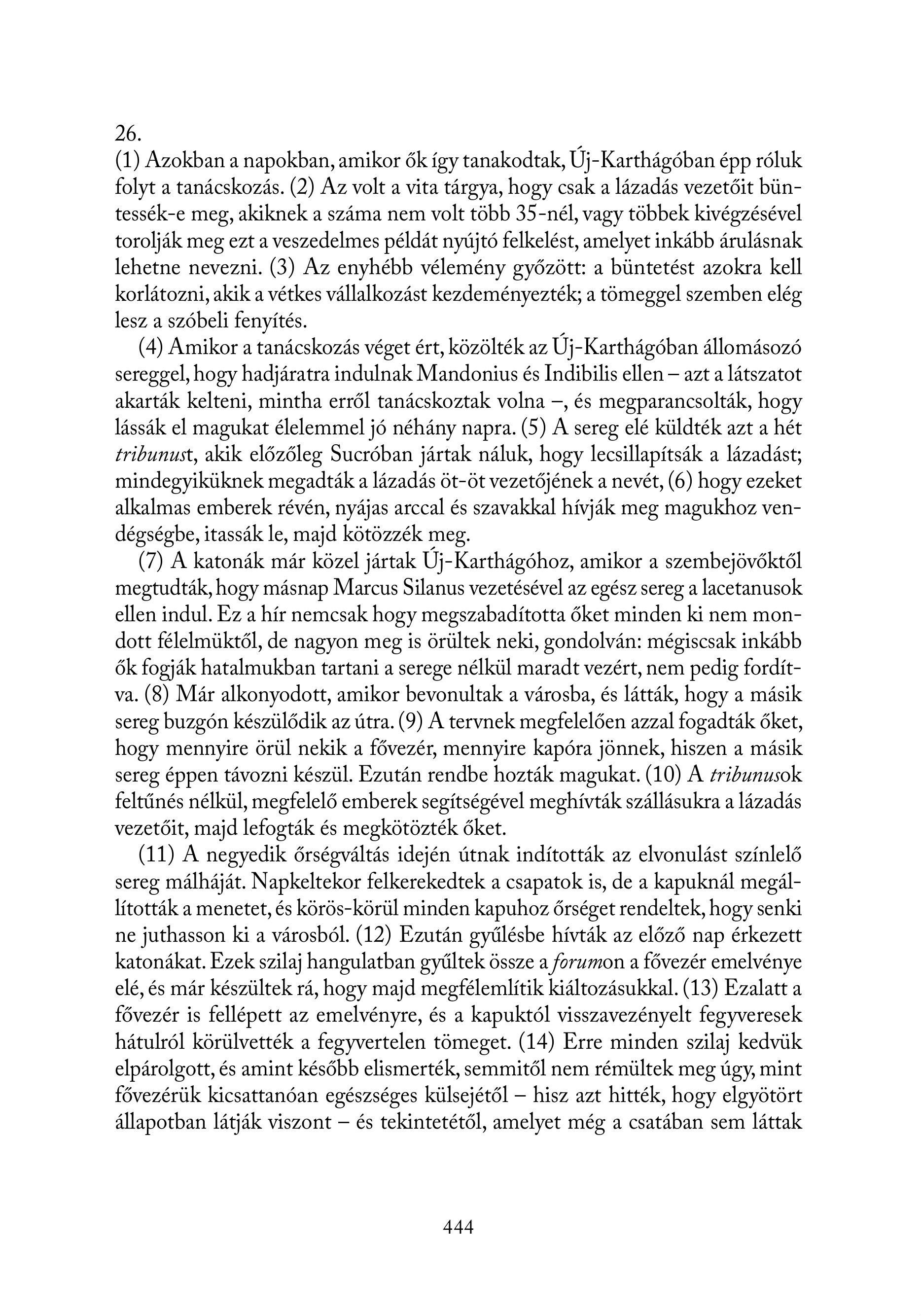 26. (1) Azokban a napokban, amikor ők így tanakodtak, Új-Karthágóban épp róluk folyt a tanácskozás. (2) Az volt a vita tárgya, hogy csak a lázadás vezetőit büntessék-e meg, akiknek a száma nem volt több 35-nél, vagy többek kivégzésével torolják meg ezt a veszedelmes példát nyújtó felkelést, amelyet inkább árulásnak lehetne nevezni. (3) Az enyhébb vélemény győzött: a büntetést azokra kell korlátozni, akik a vétkes vállalkozást kezdeményezték; a tömeggel szemben elég lesz a szóbeli fenyítés. | (4) Amikor a tanácskozás véget ért, közölték az Uj-Karthágóban állomásozó sereggel, hogy hadjáratra indulnak Mandonius és Indibilis ellen — azt a látszatot akarták kelteni, mintha erről tanácskoztak volna —, és megparancsolták, hogy lássák el magukat élelemmel jó néhány napra. (5) A sereg elé küldték azt a hét tribunust, akik előzőleg Sucróban jártak náluk, hogy lecsillapítsák a lázadást; mindegyiküknek megadták a lázadás öt-öt vezetőjének a nevét, (6) hogy ezeket alkalmas emberek révén, nyájas arccal és szavakkal hívják meg magukhoz vendégségbe, itassák le, majd kötözzék meg. (7) A katonák már közel jártak Új-Karthágóhoz, amikor a szembejövőktől megtudták, hogy másnap Marcus Silanus vezetésével az egész sereg a lacetanusok ellen indul. Ez a hír nemcsak hogy megszabadította őket minden ki nem mondott félelmüktől, de nagyon meg is örültek neki, gondolván: mégiscsak inkább ők fogják hatalmukban tartani a serege nélkül maradt vezért, nem pedig fordítva. (8) Már alkonyodott, amikor bevonultak a városba, és látták, hogy a másik sereg buzgón készülődik az útra. (9) A tervnek megfelelően azzal fogadták őket, hogy mennyire örül nekik a fővezér, mennyire kapóra jönnek, hiszen a másik sereg éppen távozni készül. Ezután rendbe hozták magukat. (10) A íribunusok feltűnés nélkül, megfelelő emberek segítségével meghívták szállásukra a lázadás vezetőit, majd lefogták és megkötözték őket. (11) A negyedik őrségváltás idején útnak indították az elvonulást színlelő sereg málháját. Napkeltekor felkerekedtek a csapatok is, de a kapuknál megállították a menetet, és körös-körül minden kapuhoz őrséget rendeltek, hogy senki ne juthasson ki a városból. (12) Ezután gyűlésbe hívták az előző nap érkezett katonákat. Ezek szilaj hangulatban gyűltek össze a forumon a fővezér emelvénye elé, és már készültek rá, hogy majd megfélemlítik kiáltozásukkal. (13) Ezalatt a fővezér is fellépett az emelvényre, és a kapuktól visszavezényelt fegyveresek hátulról körülvették a fegyvertelen tömeget. (14) Erre minden szilaj kedvük elpárolgott, és amint később elismerték, semmitől nem rémültek meg úgy, mint fővezérük kicsattanóan egészséges külsejétől — hisz azt hitték, hogy elgyötört állapotban látják viszont — és tekintetétől, amelyet még a csatában sem láttak 444