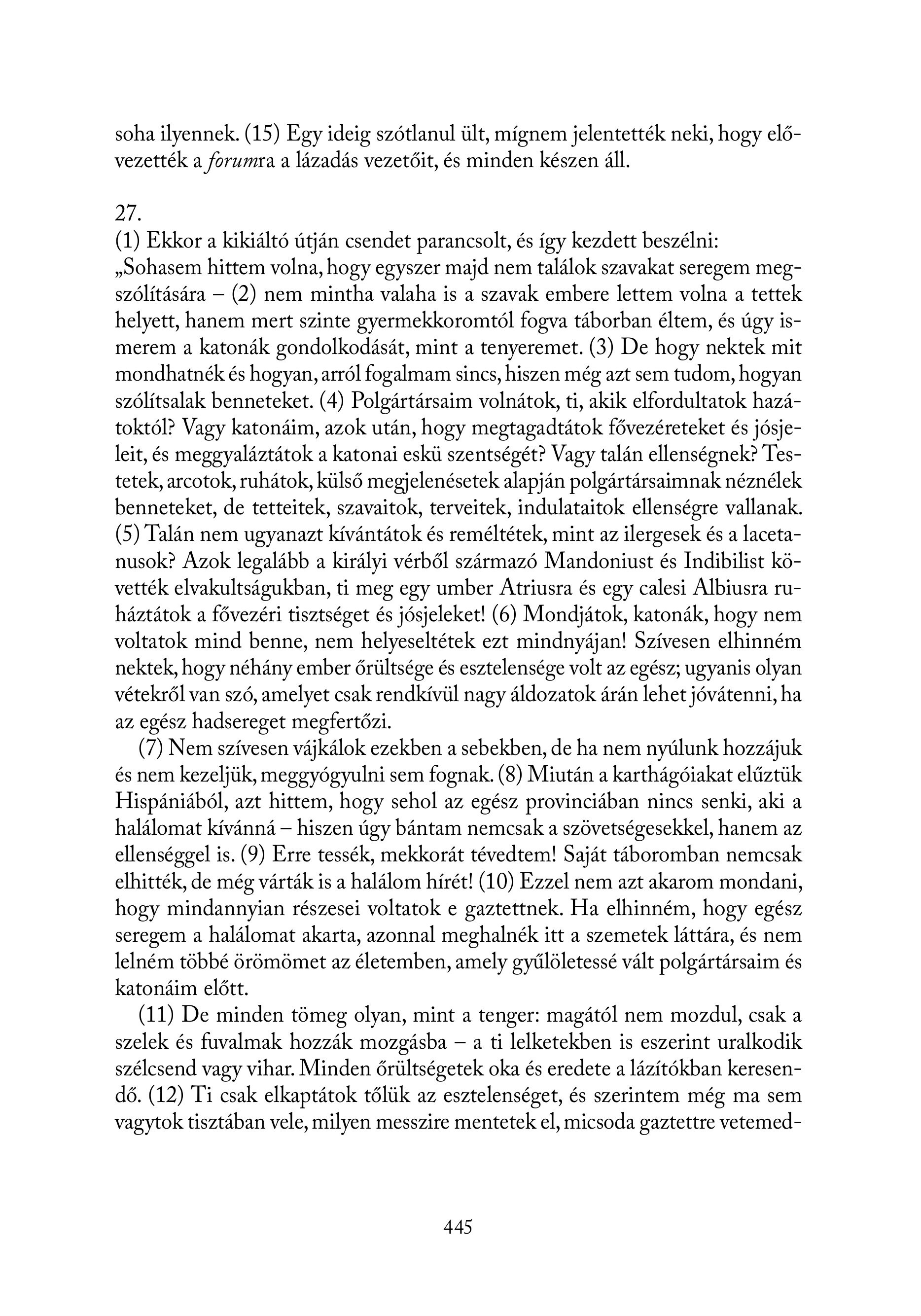 soha ilyennek. (15) Egy ideig szótlanul ült, mígnem jelentették neki, hogy elővezették a forumra a lázadás vezetőit, és minden készen áll. 27. (1) Ekkor a kikiáltó útján csendet parancsolt, és így kezdett beszélni: , Sohasem hittem volna, hogy egyszer majd nem találok szavakat seregem megszólítására — (2) nem mintha valaha is a szavak embere lettem volna a tettek helyett, hanem mert szinte gyermekkoromtól fogva táborban éltem, és úgy ismerem a katonák gondolkodását, mint a tenyeremet. (3) De hogy nektek mit mondhatnék és hogyan, arról fogalmam sincs, hiszen még azt sem tudom, hogyan szólítsalak benneteket. (4) Polgártársaim volnátok, ti, akik elfordultatok hazátoktól? Vagy katonáim, azok után, hogy megtagadtátok fővezéreteket és jósjeleit, és meggyaláztátok a katonai eskü szentségét? Vagy talán ellenségnek? Testetek, arcotok, ruhátok, külső megjelenésetek alapján polgártársaimnak néznélek benneteket, de tetteitek, szavaitok, terveitek, indulataitok ellenségre vallanak. (5) Talán nem ugyanazt kívántátok és reméltétek, mint az ilergesek és a lacetanusok? Azok legalább a királyi vérből származó Mandoniust és Indibilist követték elvakultsagukban, ti meg egy umber Atriusra és egy calesi Albiusra ruháztátok a fővezéri tisztséget és jósjeleket! (6) Mondjátok, katonák, hogy nem voltatok mind benne, nem helyeseltétek ezt mindnyájan! Szívesen elhinném nektek, hogy néhány ember őrültsége és esztelensége volt az egész; ugyanis olyan vétekről van szó, amelyet csak rendkívül nagy áldozatok árán lehet jóvátenni, ha az egész hadsereget megfertőzi. (7) Nem szívesen vájkálok ezekben a sebekben, de ha nem nyúlunk hozzájuk és nem kezeljük, meggyógyulni sem fognak. (8) Miután a karthágóiakat elűztük Hispániából, azt hittem, hogy sehol az egész provinciában nincs senki, aki a halálomat kívánná — hiszen úgy bántam nemcsak a szövetségesekkel, hanem az ellenséggel is. (9) Erre tessék, mekkorát tévedtem! Saját táboromban nemcsak elhitték, de még várták is a halálom hírét! (10) Ezzel nem azt akarom mondani, hogy mindannyian részesei voltatok e gaztettnek. Ha elhinném, hogy egész seregem a halálomat akarta, azonnal meghalnék itt a szemetek láttára, és nem lelném többé örömömet az életemben, amely gyűlöletessé vált polgártársaim és katonáim előtt. (11) De minden tömeg olyan, mint a tenger: magától nem mozdul, csak a szelek és fuvalmak hozzák mozgásba - a ti lelketekben is eszerint uralkodik szélcsend vagy vihar. Minden őrültségetek oka és eredete a lázítókban keresendö. (12) Ti csak elkaptätok tőlük az esztelenséget, és szerintem még ma sem vagytok tisztában vele, milyen messzire mentetek el, micsoda gaztettre vetemed445