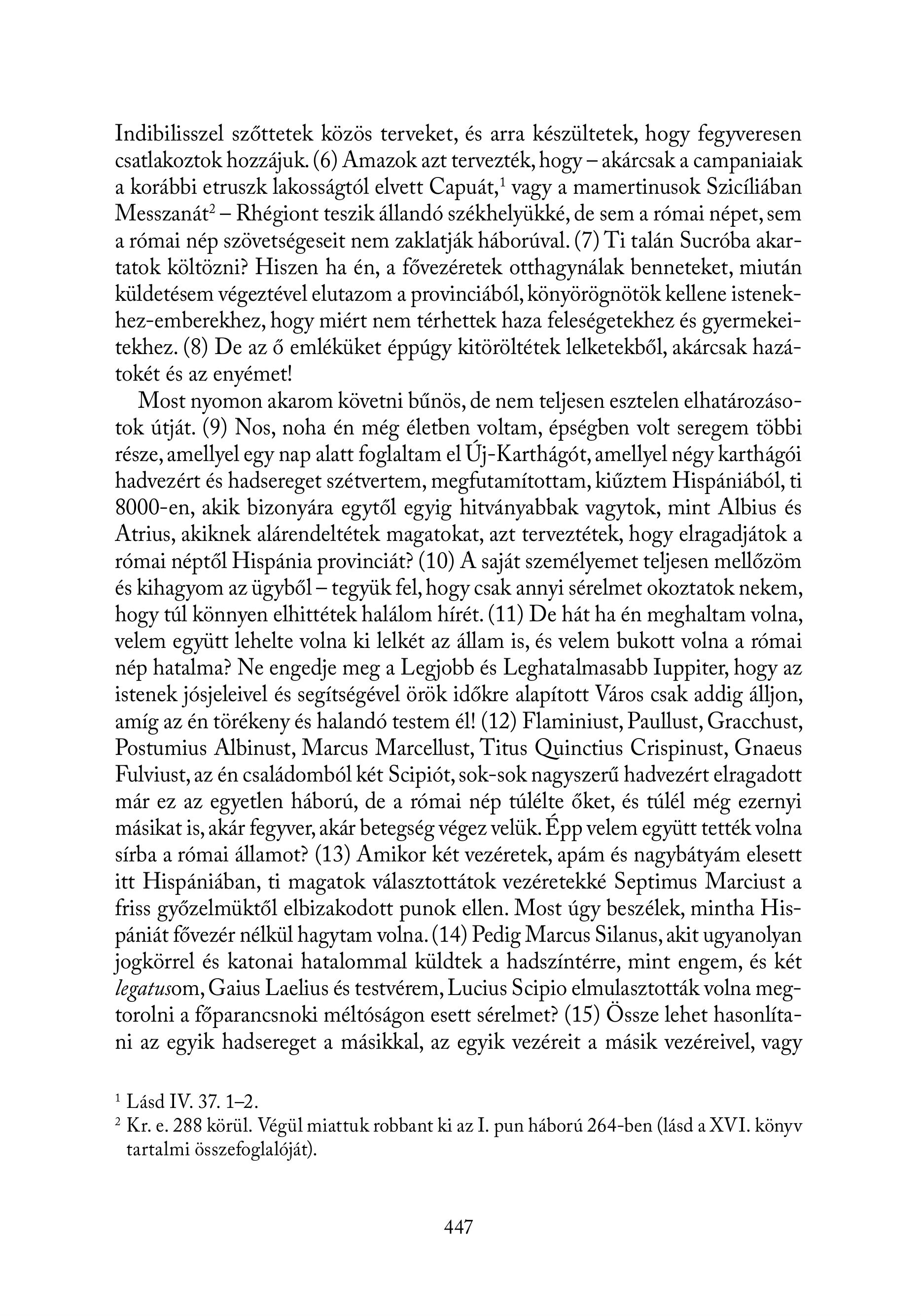 Indibilisszel szőttetek közös terveket, és arra készültetek, hogy fegyveresen csatlakoztok hozzájuk. (6) Amazok azt tervezték, hogy — akárcsak a campaniaiak a korábbi etruszk lakosságtól elvett Capuát,! vagy a mamertinusok Szicíliában Messzanát? — Rhégiont teszik állandó székhelyükké, de sem a római népet, sem a római nép szövetségeseit nem zaklatják háborúval. (7) Ti talán Sucróba akartatok költözni?" Hiszen ha én, a fővezéretek otthagynálak benneteket, miután küldetésem végeztével elutazom a provinciából, könyörögnötök kellene istenekhez-emberekhez, hogy miért nem térhettek haza feleségetekhez és gyermekeitekhez. (8) De az ő emléküket éppúgy kitöröltétek lelketekből, akárcsak hazátokét és az enyémet! Most nyomon akarom követni bűnös, de nem teljesen esztelen elhatározásotok útját. (9) Nos, noha én még életben voltam, épségben volt seregem többi része, amellyel egy nap alatt foglaltam el Új- Karthágót, amellyel négy karthágói hadvezért és hadsereget szétvertem, megfutamítottam, kiűztem Hispániából, ti 8000-en, akik bizonyára egytől egyig hitványabbak vagytok, mint Albius és Atrius, akiknek alárendeltétek magatokat, azt terveztétek, hogy elragadjátok a római néptől Hispánia provinciát? (10) A saját személyemet teljesen mellőzöm és kihagyom az ügyből - tegyük fel, hogy csak annyi sérelmet okoztatok nekem, hogy túl könnyen elhittétek halálom hírét. (11) De hát ha én meghaltam volna, velem együtt lehelte volna ki lelkét az állam is, és velem bukott volna a római nép hatalma? Ne engedje meg a Legjobb és Leghatalmasabb luppiter, hogy az istenek jósjeleivel és segítségével örök időkre alapított Város csak addig álljon, amíg az én törékeny és halandó testem él! (12) Flaminiust, Paullust, Gracchust, Postumius Albinust, Marcus Marcellust, Titus Ouinctius Crispinust, Gnaeus Fulviust, az én családomból két Scipiót, sok-sok nagyszerű hadvezért elragadott már ez az egyetlen háború, de a római nép túlélte őket, és túlél még ezernyi másikat is, akár fegyver, akár betegség végez velük. Épp velem együtt tették volna sírba a római államot? (13) Amikor két vezéretek, apám és nagybátyám elesett itt Hispániában, ti magatok választottátok vezéretekké Septimus Marciust a friss győzelmüktől elbizakodott punok ellen. Most úgy beszélek, mintha Hispániát fővezér nélkül hagytam volna. (14) Pedig Marcus Silanus, akit ugyanolyan jogkörrel és katonai hatalommal küldtek a hadszíntérre, mint engem, és két legatusom, Gaius Laelius és testvérem, Lucius Scipio elmulasztották volna megtorolni a főparancsnoki méltóságon esett sérelmet? (15) Össze lehet hasonlítani az egyik hadsereget a másikkal, az egyik vezéreit a másik vezéreivel, vagy ! Lásd IV. 37. 1-2. ? Kr. e. 288 körül. Végül miattuk robbant ki az I. pun háború 264-ben (lásd a XVI. könyv tartalmi összefoglalóját). 447