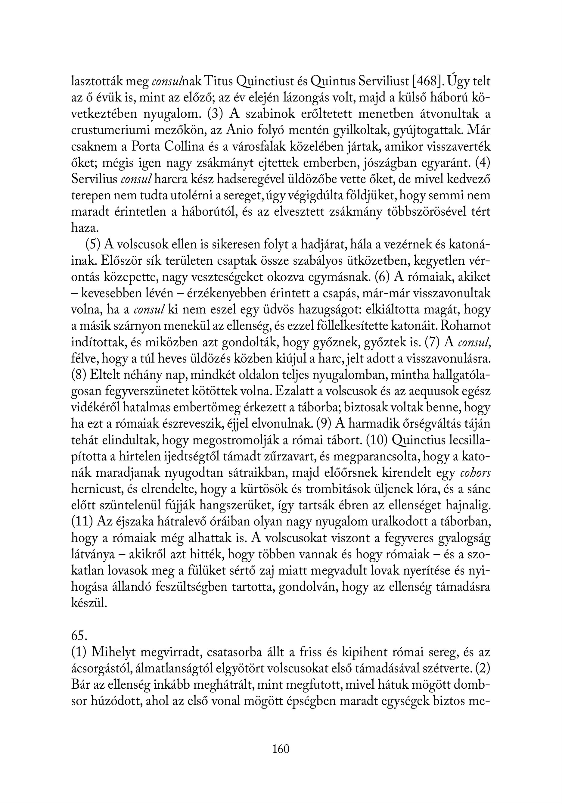 lasztották meg consulnak Titus Quinctiust és Quintus Serviliust [468]. Úgy telt az ő évük is, mint az előző; az év elején lázongás volt, majd a külső háború következtében nyugalom. (3) A szabinok erőltetett menetben átvonultak a crustumeriumi mezőkön, az Anio folyó mentén gyilkoltak, gyújtogattak. Már csaknem a Porta Collina és a városfalak közelében jártak, amikor visszaverték őket; mégis igen nagy zsákmányt ejtettek emberben, jószágban egyaránt. (4) Servilius consul harcra kész hadseregével üldözőbe vette őket, de mivel kedvező terepen nem tudta utolérni a sereget, úgy végigdúlta földjüket, hogy semmi nem maradt érintetlen a háborútól, és az elvesztett zsákmány többszörösével tért haza. (5) A volscusok ellen is sikeresen folyt a hadjárat, hála a vezérnek és katonáinak. Először sík területen csaptak össze szabályos ütközetben, kegyetlen vérontás közepette, nagy veszteségeket okozva egymásnak. (6) A rómaiak, akiket — kevesebben lévén — érzékenyebben érintett a csapás, már-már visszavonultak volna, ha a consul ki nem eszel egy üdvös hazugságot: elkiáltotta magát, hogy a másik szárnyon menekül az ellenség, és ezzel föllelkesítette katonáit. Rohamot indítottak, és miközben azt gondolták, hogy győznek, győztek is. (7) A consul, félve, hogy a túl heves üldözés közben kiújul a harc, jelt adott a visszavonulásra. (8) Eltelt néhány nap, mindkét oldalon teljes nyugalomban, mintha hallgatólagosan fegyverszünetet kötöttek volna. Ezalatt a volscusok és az aeguusok egész vidékéről hatalmas embertömeg érkezett a táborba; biztosak voltak benne, hogy ha ezt a rómaiak észreveszik, éjjel elvonulnak. (9) A harmadik őrségváltás táján tehát elindultak, hogy megostromolják a római tábort. (10) Ouinctius lecsillapította a hirtelen ijedtségtől támadt zűrzavart, és megparancsolta, hogy a katonák maradjanak nyugodtan sátraikban, majd előőrsnek kirendelt egy cohors hernicust, és elrendelte, hogy a kürtösök és trombitások üljenek lóra, és a sánc előtt szüntelenül fújják hangszerüket, így tartsák ébren az ellenséget hajnalig. (11) Az éjszaka hátralevő óráiban olyan nagy nyugalom uralkodott a táborban, hogy a rómaiak még alhattak is. A volscusokat viszont a fegyveres gyalogság látványa — akikről azt hitték, hogy többen vannak és hogy rómaiak — és a szokatlan lovasok meg a fülüket sértő zaj miatt megvadult lovak nyerítése és nyihogása állandó feszültségben tartotta, gondolván, hogy az ellenség támadásra készül. 65. (1) Mihelyt megvirradt, csatasorba állt a friss és kipihent római sereg, és az ácsorgástól, álmatlanságtól elgyötört volscusokat első támadásával szétverte. (2) Bár az ellenség inkább meghátrált, mint megfutott, mivel hátuk mögött dombsor húzódott, ahol az első vonal mögött épségben maradt egységek biztos me160