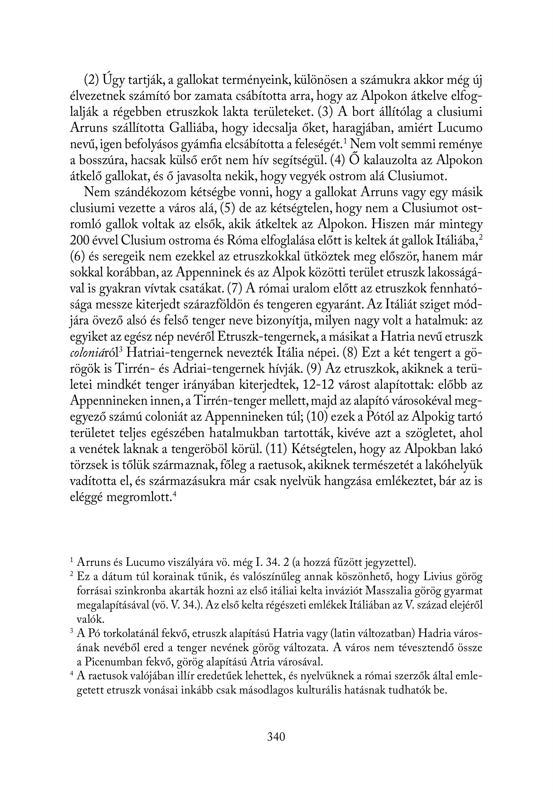 (2) Úgy tartják, a gallokat terményeink, különösen a számukra akkor még új élvezetnek számító bor zamata csábította arra, hogy az Alpokon átkelve elfoglalják a régebben etruszkok lakta területeket. (3) A bort állítólag a clusiumi Arruns szállította Galliába, hogy idecsalja őket, haragjában, amiért Lucumo nevű, igen befolyásos gyámfia elcsábította a feleségét." Nem volt semmi reménye a bosszúra, hacsak külső erőt nem hív segítségül. (4) Ö kalauzolta az Alpokon átkelő gallokat, és ő javasolta nekik, hogy vegyék ostrom alá Clusiumot. Nem szándékozom kétségbe vonni, hogy a gallokat Arruns vagy egy másik clusiumi vezette a város alá, (5) de az kétségtelen, hogy nem a Clusiumot ostromló gallok voltak az elsők, akik átkeltek az Alpokon. Hiszen már mintegy 200 évvel Clusium ostroma és Róma elfoglalása előtt is keltek át gallok Itáliába, ? (6) és seregeik nem ezekkel az etruszkokkal ütköztek meg először, hanem már sokkal korábban, az Appenninek és az Alpok közötti terület etruszk lakosságával is gyakran vívtak csatákat. (7) A római uralom előtt az etruszkok fennhatósága messze kiterjedt szárazföldön és tengeren egyaránt. Az Itáliát sziget módjára övező alsó és felső tenger neve bizonyítja, milyen nagy volt a hatalmuk: az egyiket az egész nép nevéről Etruszk-tengernek, a másikat a Hatria nevű etruszk coloniarol’ Hatriai-tengernek nevezték Itália népei. (8) Ezt a két tengert a görögök is Tirrén- és Adriai-tengernek hívják. (9) Az etruszkok, akiknek a területei mindkét tenger irányában kiterjedtek, 12-12 várost alapítottak: előbb az Appennineken innen, a Tirrén-tenger mellett, majd az alapitö värosok&val megegyező számú coloniát az Appennineken túl; (10) ezek a Pótól az Alpokig tartó területet teljes egészében hatalmukban tartották, kivéve azt a szögletet, ahol a venétek laknak a tengeröböl körül. (11) Kétségtelen, hogy az Alpokban lakó törzsek is tőlük származnak, főleg a raetusok, akiknek természetét a lakóhelyük vadította el, és származásukra már csak nyelvük hangzása emlékeztet, bár az is eléggé megromlott." ! Arruns és Lucumo viszályára vö. még I. 34. 2 (a hozzá fűzött jegyzettel). ? Ez a dátum túl korainak tűnik, és valószínűleg annak köszönhető, hogy Livius görög forrásai szinkronba akarták hozni az első itáliai kelta inváziót Masszalia görög gyarmat megalapításával (vö. V. 34.). Az első kelta régészeti emlékek Itáliában az V. század elejéről valók. : A Pó torkolatánál fekvő, etruszk alapítású Hatria vagy (latin változatban) Hadria városának nevéből ered a tenger nevének görög változata. A város nem tévesztendő össze a Picenumban fekvő, görög alapítású Atria városával. ! A raetusok valójában illír eredetűek lehettek, és nyelvüknek a római szerzők által emlegetett etruszk vonásai inkább csak másodlagos kulturális hatásnak tudhatók be. 340
